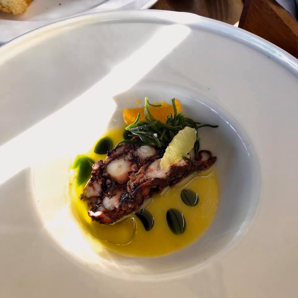 Sırada tüm tadım menüsü içinde en başarılı bulduğum tabak var, oldukça koyu kıvamlı harika bir narenciye sosu içinde gelen ahtapot. Narenciyeli sosları çok seven, ahtapotu da çok seven ben için on üstünden onluk bir kompozisyon. Sosun kendisini tatmanızı cidden çok isterdim, yağ narenciye içinde harika homojenize edilmiş, hafif kalınlaştırılmış. Bu kalınlaştırma önemli, çünkü narenciye suyu gibi oldukça sıvı bir yapının ahtapot üstünde kalabilecek bir dokuya geçmesini sağlıyor -bu doku için elma pektini kullanılmış olabilir. Sonuçta ahtapotla sosun mükemmel uyumu yakalanmış. Söylenecek çok bir şey yok çünkü tabak kusursuz.