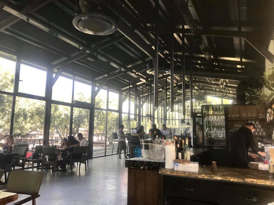Gittiğimizde gündüzdü ve hava çok sıcaktı, bu sebeple bahçede oturmadık. Ama oldukça geniş, yeşillikler içinde, hani şu ağza sakız edilen “keyifli” kelimesinin hakkını verecek bir bahçeleri vardı. Yine de, tavana kadar uzanan camlar sayesinde içerisi de gayet ferahtı. Tasarım göz yormuyor, hem modern ama hem de soğuk değil. Açık mutfak önündeki bar da çok şık. Biraz salonun diğer tarafında, eezervasyonumuzun olduğu masaya alındık ve garson bey menü için bize yardımcı oldu.
