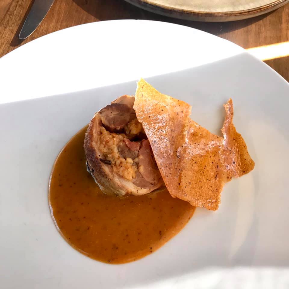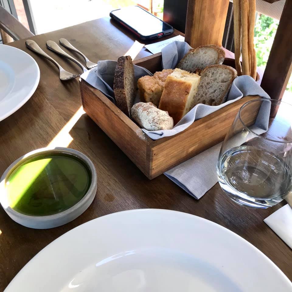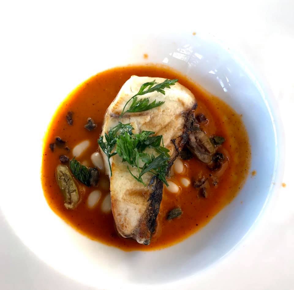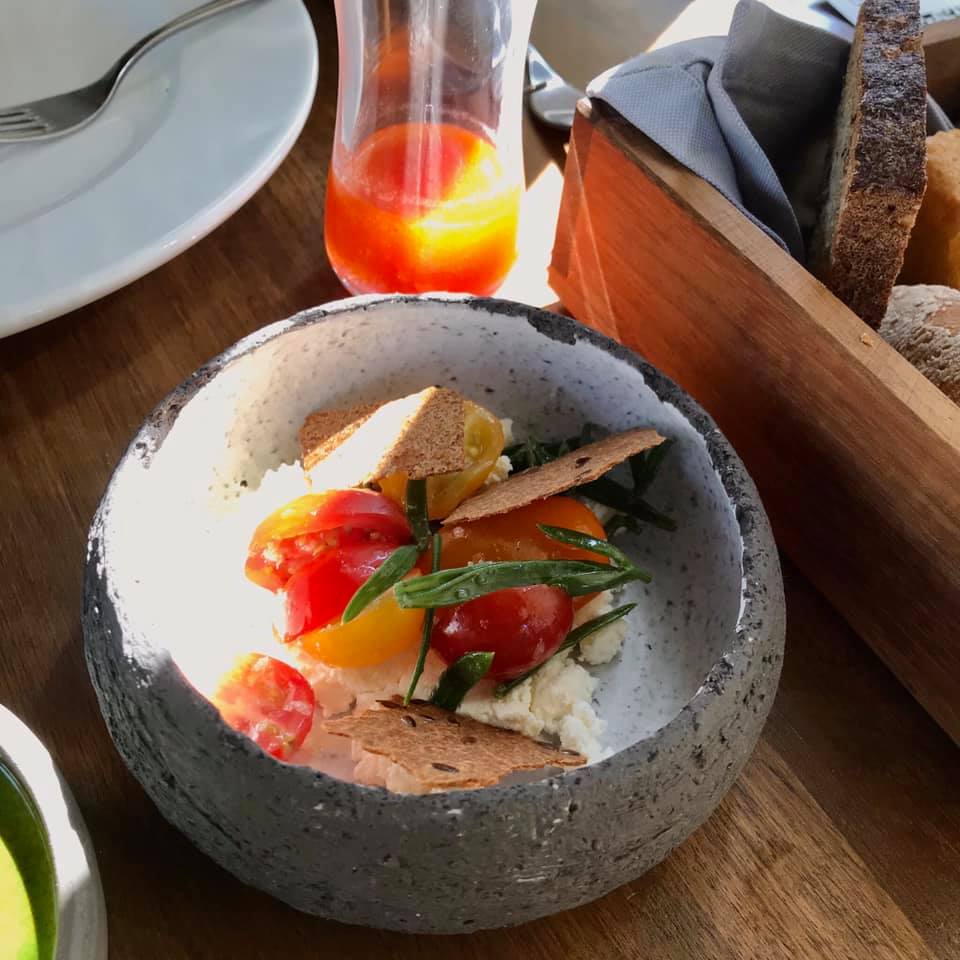 Masaya evvela beş farklı ekmeğin olduğu sepet ve restoranın kendi zeytin ağaçlarından üretilmiş bir zeytinyağı geliyor. Hafif, ancak lezzetli bir yağ, başarılı ekmekler. İlk başlangıç şefin ikramı, köz biber tadının baskın olduğu bir gazpacho ve peynir dolgulu bir şu (choux). Gayet lezzetli, aklımdan “Demek şu denen meret kremayla olduğu kadar tuzluyla da iyi gidiyormuş” cümlesi geçiyor. Sırada üstünde bahçeden kiraz domatesler ve taze kekikle gelen, vanilyalı zeytinyağı ile sunulan Tire çamur peyniri var. Vanilya tadı hiç gelmedi, fazla hafif kalmış. Peynirse hoş ve lezzetli, fakat bir özelliği var mıydı diye sorarsanız ne yazık ki vardı diyemem: İyi bir lor nefasetinde, güzel, ama karakteristik tadı olmayan bir peynir. Yanında yağlı domates sosuyla servis.