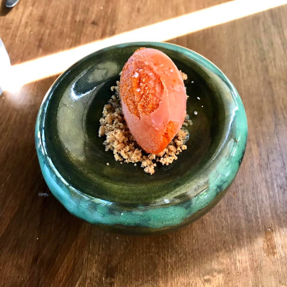 Bu kadar deniz mahsülünden sonra ağzımızın tadını değiştirmek için köz biber ve domatesli sorbe geliyor. Biber tadı domatesten çok daha baskın, oldukça da lezzetli. Altındaki kırıntılar ise oldukça kuvvetli bir tereyağı tadına sahip, seven için çok lezzetli bir ikili olabilir.