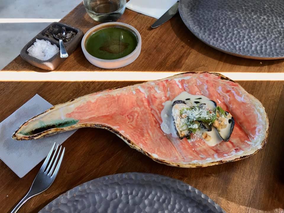 Ardından gelen tabak keçi peyniri soslu midye. Keçi peyniri tanımını detaylandırmamışlar, ama bu peynirin çok daha karakteristik bir tadı olmasından yola çıkarak çok genç, büş tarzı bir peynir olmadığını düşünüyorum. Kokusu keçi peynirinden çok rokfor tarzı bleu’leri anımsatıyor, ki bu bizim için iyi bir şey, zira seviyoruz böyle peynirleri. Midyenin tadını biraz bastırıyor, ama midyenin dokusu çok diri, canlı. Sunumu ekstra güzel, gerçi bütün servis ekipmanı çok şık, bilhassa özel tasarım tabaklar… Özenildiğini hissettiriyorlar.