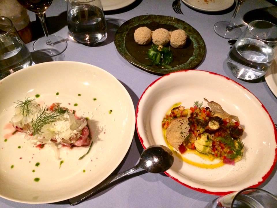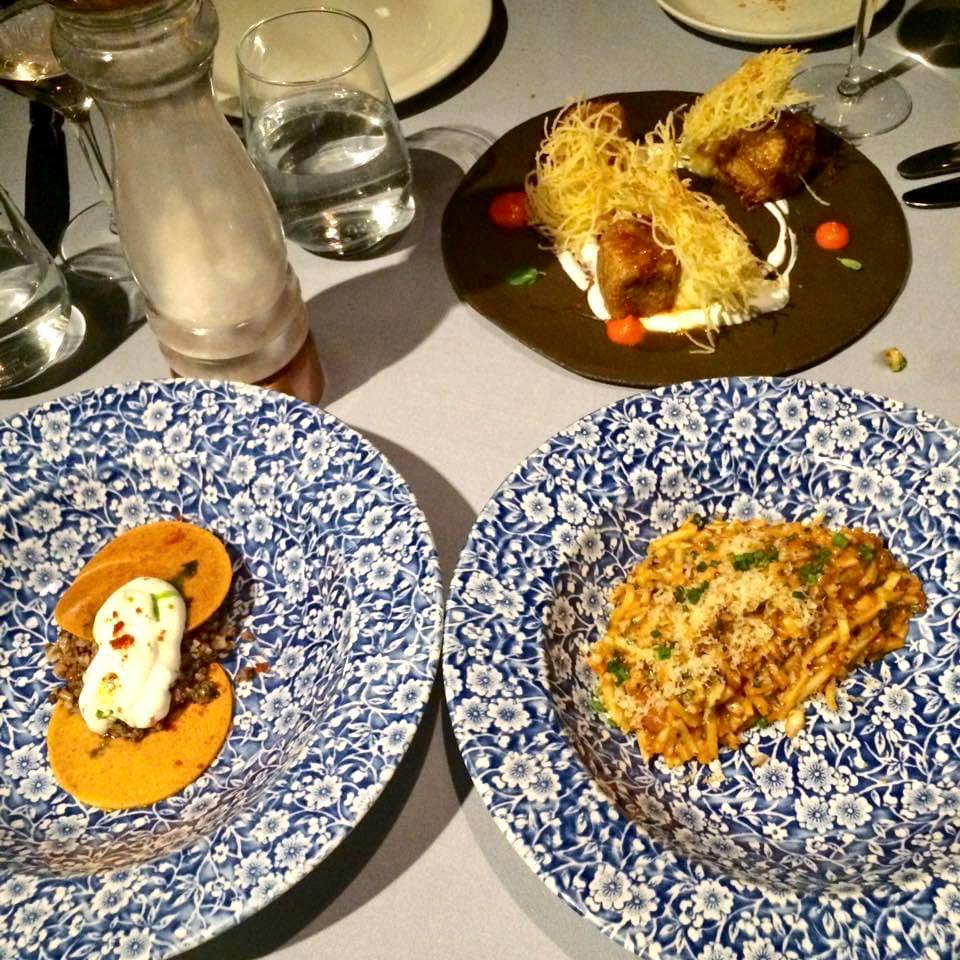 Sıcaklarda, disk halinde açılmış harcıyla içli köfte (şekli farklı, evet), yanında patates kadayıfıyla kadınbudu köfte ve ahtapotlu ev eriştesi görüyorsunuz. İçli köftenin lezzeti harikaydı, gerçekten tadı damağımızda kaldı. Böyle açık sunulunca sini oruğunu da andırıyor biraz tabii. Kadınbuduna gelince, kadayıf patatesler nefis ve çıtır çıtırdı, köfte ise biraz yavan kaldı. Ahtapotlu erişte ise çok ama çok lezzetli! “Belli ki hem iyi ahtapot tedarik edebiliyor hem de onu iyi işleyebiliyorlar” diye düşündüm, çünkü her iki ahtapotlu tabak da sıradışı lezzetteydi. Kesinlikle denemenizi öneririm.