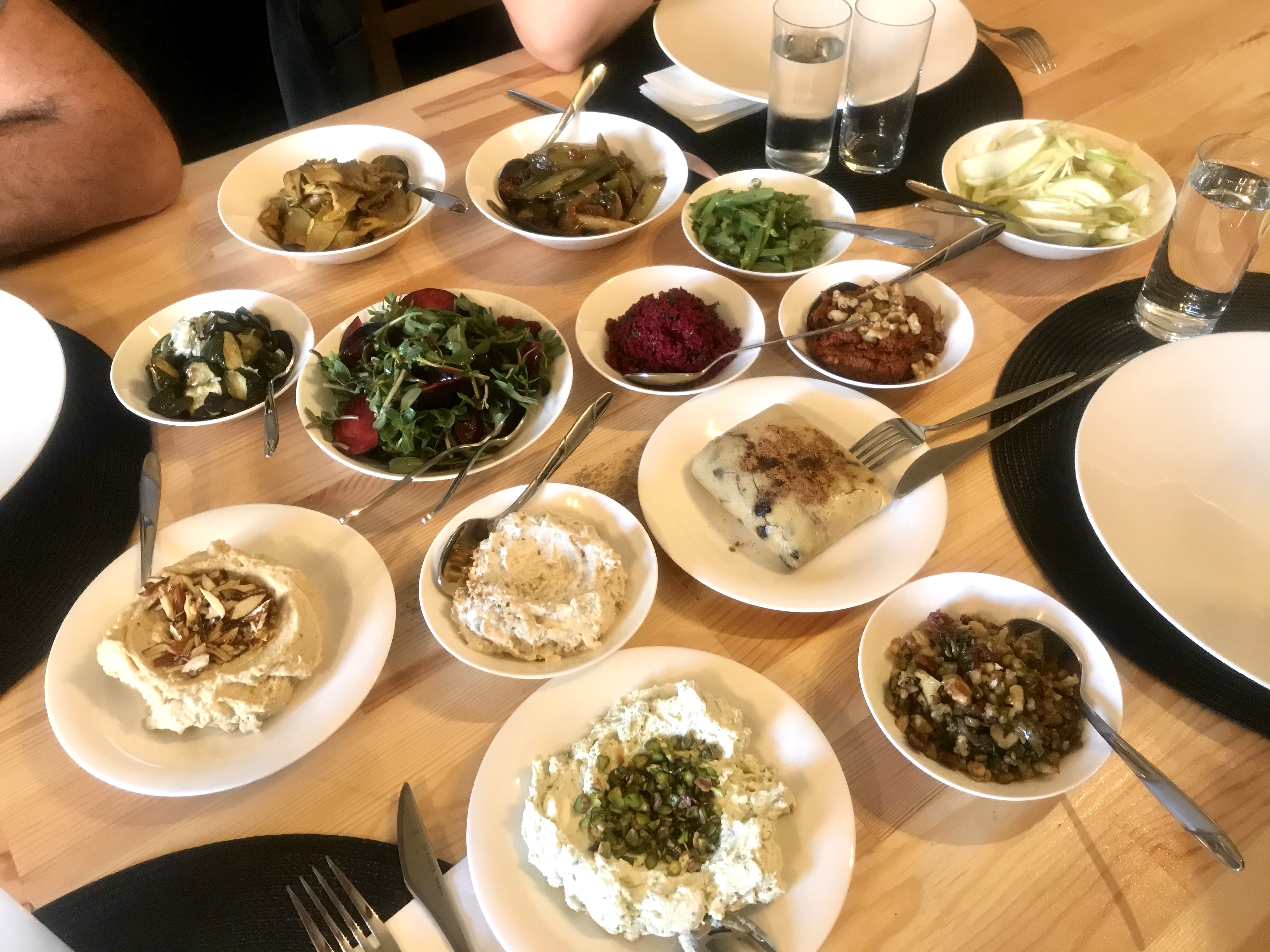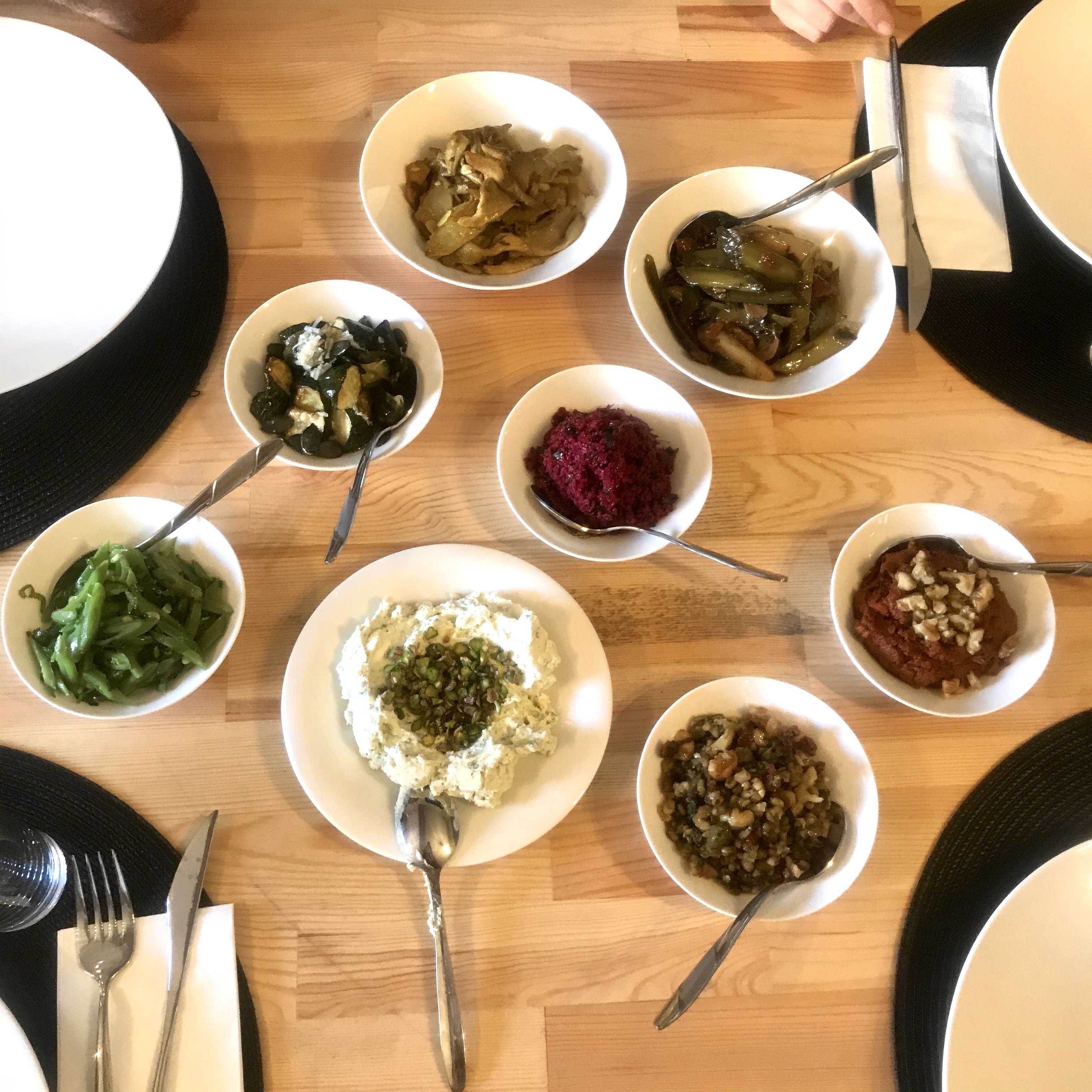 Bu seneki soframızda bademli humus, fesleğenli fıstıklı peynir ezme, erikli semizotu, rezeneli elma salatası, muhammara, kuru domatesli nar ekşili pırasa, tahinli susamlı patlıcan, ekşili karakabak kızartma, pancarlı kısır, zerdeçallı istiridye mantarı, taze naneli taze fasulye, topik, enginar kalbi ve maş fasulyesi salatası vardı. Sayarken yoruldum, ama yerken hiç yorulmadım! Mezelerin hepsi birbirinden güzel, hepsi tazecik, hepsinin sarımsağı, ekşisi, yağı yerli yerinde… O yüzden favorin neydi deseniz seçmek zor, insanın hangi gün neyi beğendiği de değişiyor zaten, ama benim ilk üçüm ekşili karakabak, kuru domatesli nar ekşili pırasa ve fesleğenli fıstıklı peynir ezmesiydi. Topiği ise liste dışı birinci ilan ediyorum, çünkü topiğe bayılırım!