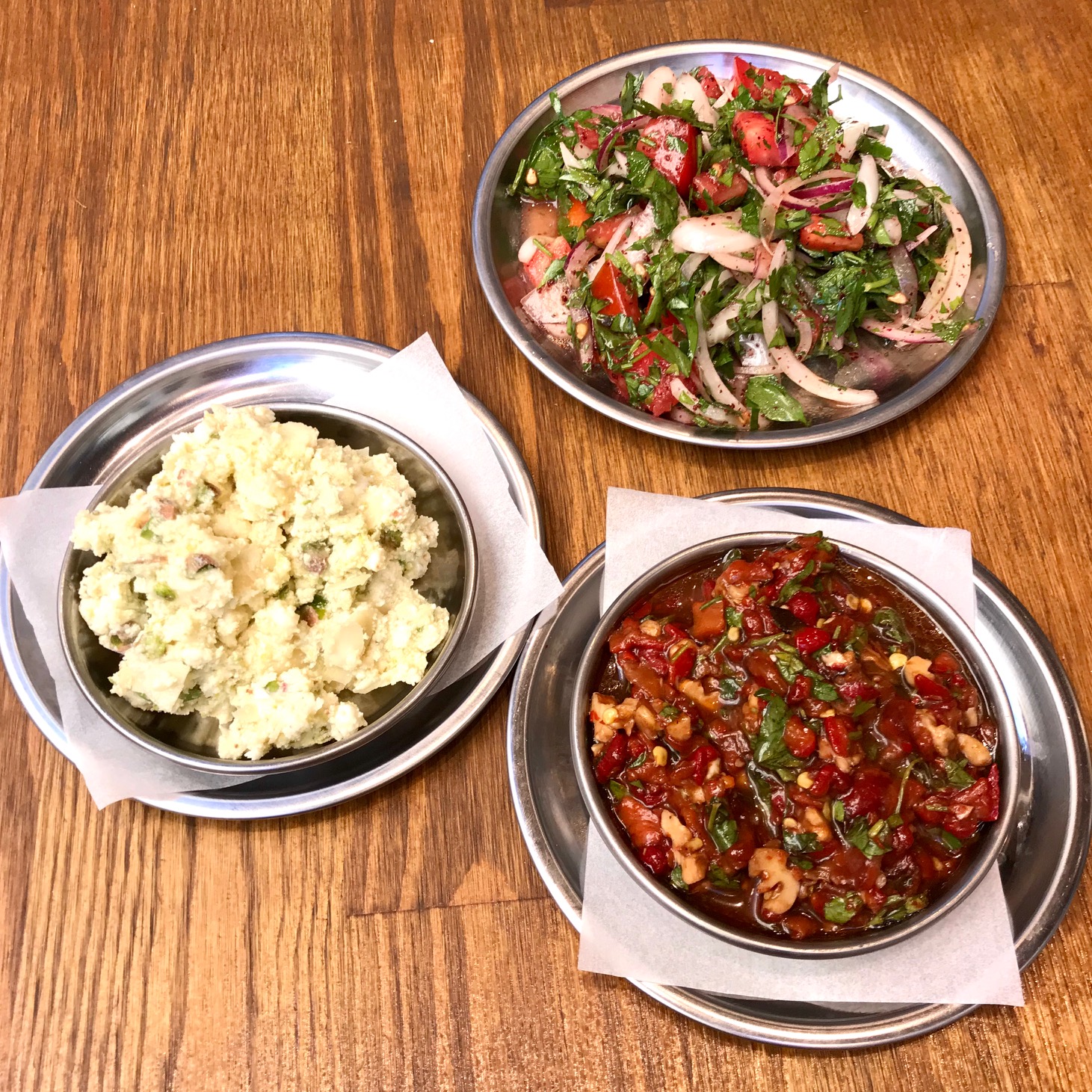 Daha önce giden arkadaşlarım sitayişle bahsettiği için ben de buraya epeyce merakla gittim doğrusu. Tabii gitmişken menüyü denemek farzdı! Köz biberle yapılan “bezirgani”, Girit ezmesi ve bol soğanlı, sumaklı salata geldi önce masaya. Benim için salata çok önemli bir unsur olduğundan lezzetine çok dikkat ederim, hakkını teslim edeyim, bu salata nefisti. İsmi “tabla salatası” ve kullanılan nar ekşisi hem lezzetli, hem de koklatılmamış, bolca konmuş. Bezirgani bana göre biraz acı ama lezzetli, Girit ezmesinin ise tadı benim beklentime göre biraz hafif.