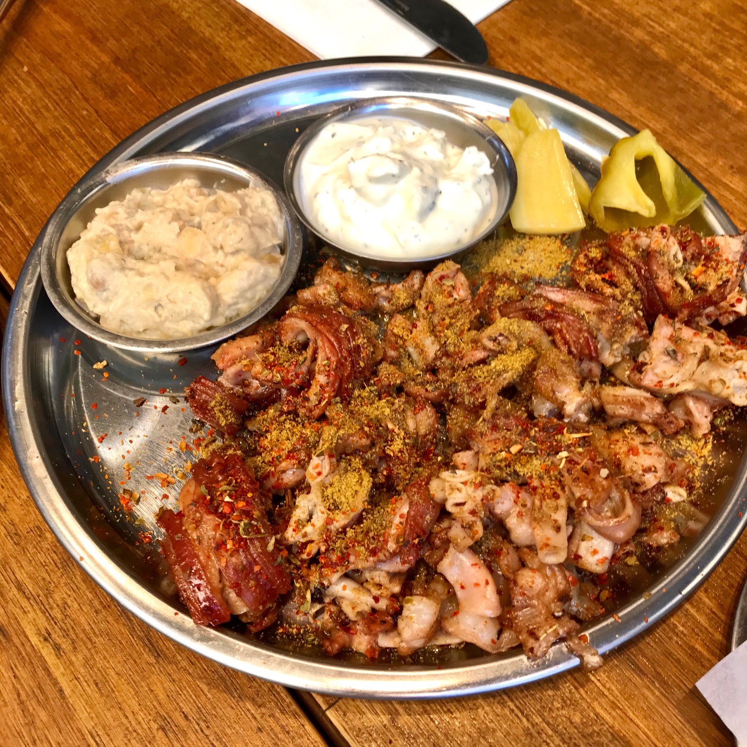 Afil, Antepli şefi Cem’in ellerinde şekillenen, küçük ve lezzetli bir menüye sahip. Sunulanlar ağırlıklı olarak “sokak yemekleri” diyebiliriz; kokoreç, uykuluk, sokak köftesi, sucuk içi, hamburger gibi sıcaklar ve humus, Girit ezme, babagannuş, atom, haydari gibi mezeler mevcut menüde. Bu tarz yerlerde pek bu çeşitte meze olmaz, buradaki genişçe meze seçeneği o açıdan güzel geldi bana. Sadece “et” olmasın, onu lezzetlendirecek eşlikçiler de olsun isterim hep. Burası bunu gayet güzel karşılıyor.