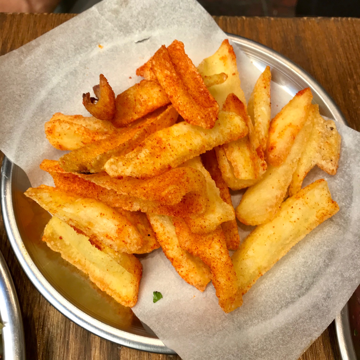Hamburgere izninizle ayrı bir yer açacağım. Aslında bu, hamburger formuna sokulmuş fıstıklı kebap. Çok lezzetli bu kebabın üstünde de onunla uyumlu olacak kelle peyniri konarak (çok şükür ki erimiş plastik cheddar değil!) servis ediliyor. Etin yağı, tadı tuzu çok yerinde, ağza gelen fıstık taneleri de lezzeti katlıyor. Sadece ikiye kesilmesi bazı hamburgerseverleri memnun etmeyebilir, ama zannederim ki kesilmeden servis edilmesini istemek de mümkündür. Hamburgerin eşlikçisi kaşık formunda baharatlı patates. Çıtır çıtır, yağ çekmemiş, eskimiş yağda kızartılmamış. “Ev patatesi” adı altında yağ çekmiş (ve bazen hiç de elde kesilmiş olmayan) patatesler yemektense, iyi hazırlanmış böyle patatesleri tercih ederim doğrusu.