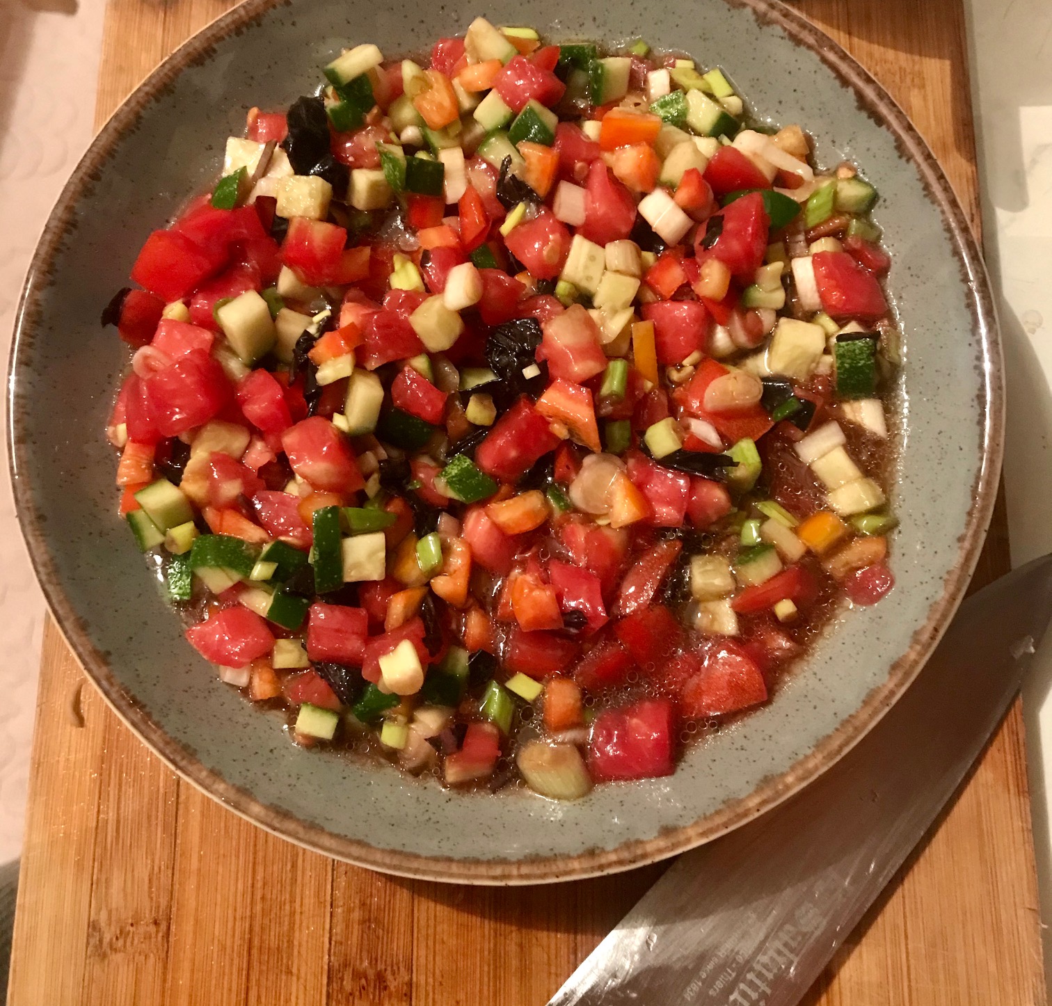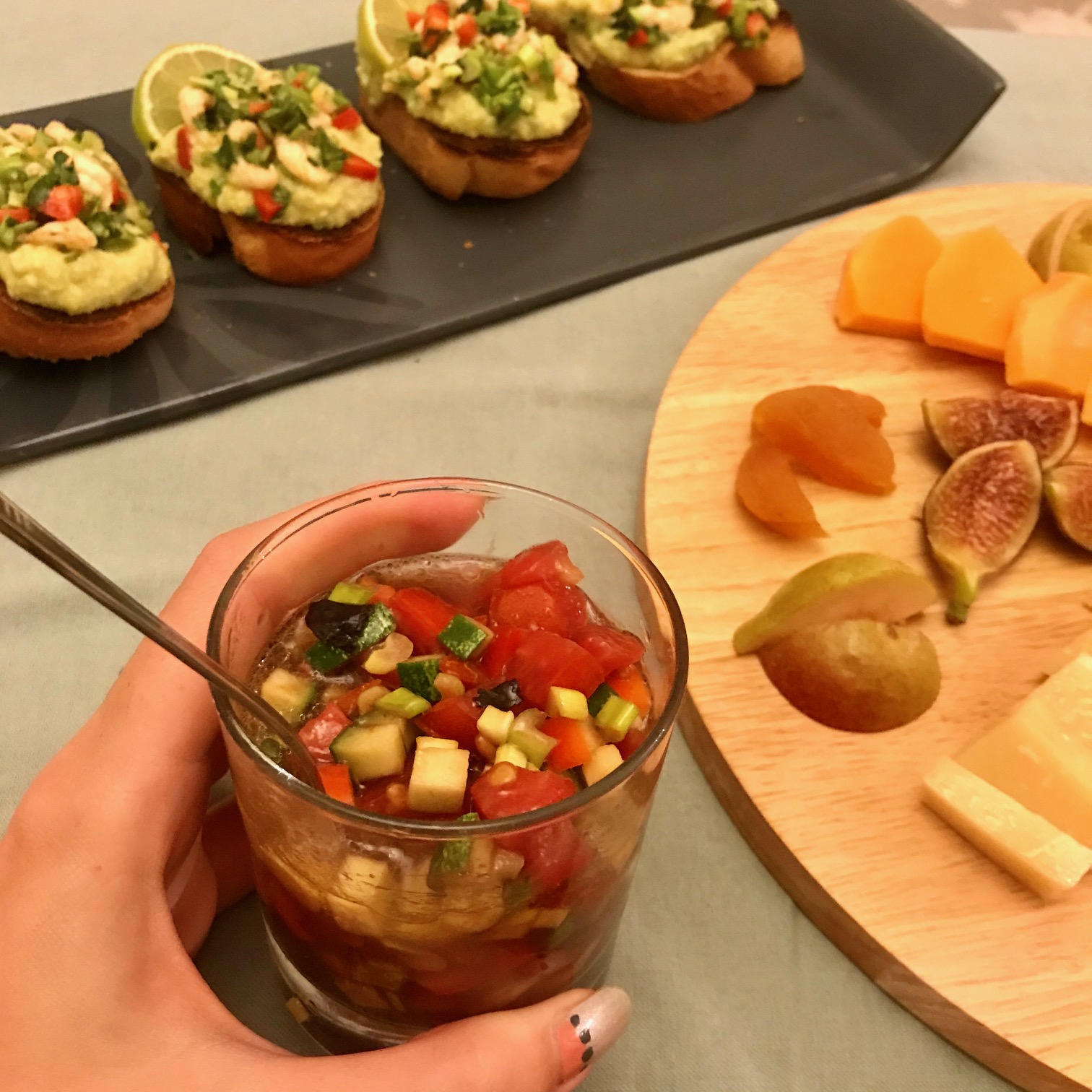 Hazırlıklar tamamlanınca salatayı kısa cam bardaklara (tumbler, viski kadehi vs. olabilir) aktardım, içlerine de birer kaşık attım. Böyle sulu salataları bardakta yemek bence çok daha kolay ve lezzetli. (Özellikle herkesin açık büfe atıştıracağı, gezineceği durumlarda böyle bir servisi öneririm, çok pratk oluyor.) Peynir tabağı ve kanepe yapılmış karides cevicheler de tamam. Yani, güzelce soğumuş -vaktiniz varsa bir de havalandırılmış- şarabınızın eşlik edeceği her şey hazır!