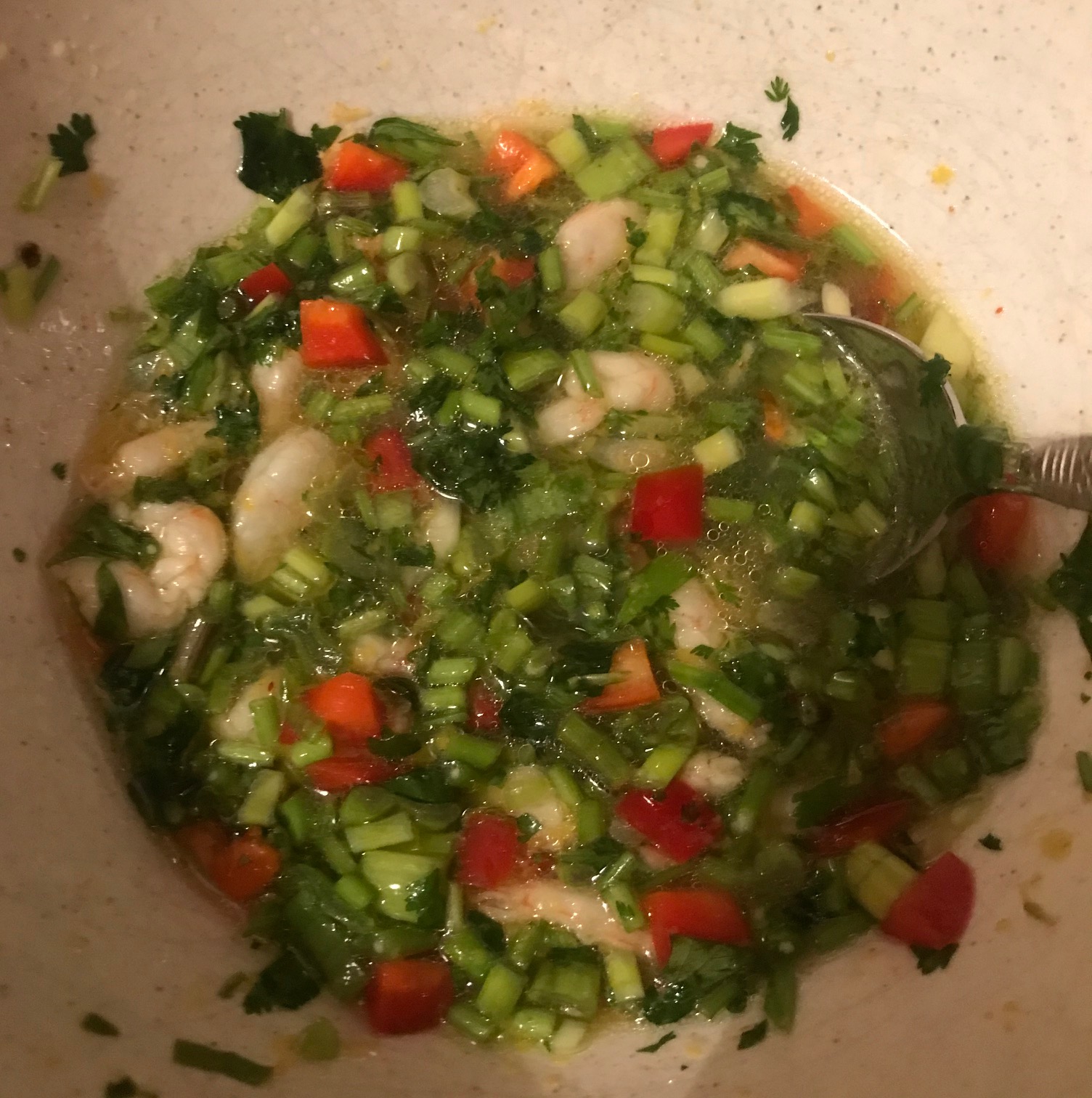 Önce işe karideslerle başladım. Ceviche için çimçim karidesten bir boy daha büyük karidesler seçmiştim, ama çimçimle de olabilir. (Taze veya donmuş tercih edebilirsiniz, Metro’da hem taze hem donuk, gayet başarılı, boy boy karidesler var.) Temel mantığımız, karidesi ateşe göstermeden, asitle pişirmek olduğu için ufak boylarla daha rahat oluyor. Bir avuç ayıklanmış karidesi derin bir kaseye aldım, üzerine yarım limon ve yarım lime/misket limonu sıktım, bir tatlı kaşığı da beyaz balzamik ekledim. (Eğer beyaz balzamik elinizde yoksa şart değil, o zaman yarım lime yerine bir tam lime suyu ekleyebilirsiniz.) Bir paprikanın beşte biri kadarını minicik küpler halinde doğradım (biberin kalanını salatada kullanacağız.) Beş-altı dal kadar kişnişi, sapları dahil incecik kıydım. Taze soğanların en yeşil, en körpe yerlerinden 4-5 ince dal seçip onları da kıydım. Hepsini karideslere ekledim. Ardından bir yemek kaşığı zeytinyağı (Ben Kürşat marka kullandım), tuz, çok az acı biber (bunun miktarı damak tadınıza kalmış tabii) ve çok az karabiberle hepsini harmanlayıp buzdolabında dinlenmeye aldım. Eğer çok diri seviyorsanız 10 dakika, “Yok, asitte güzelce pişsin” derseniz 30-40 dakika kadar bu sosta karidesleri marine edebilirsiniz. Sosunun tadı çok güzel olacak, biliyorum, ama içmeyin, o bize lazım!