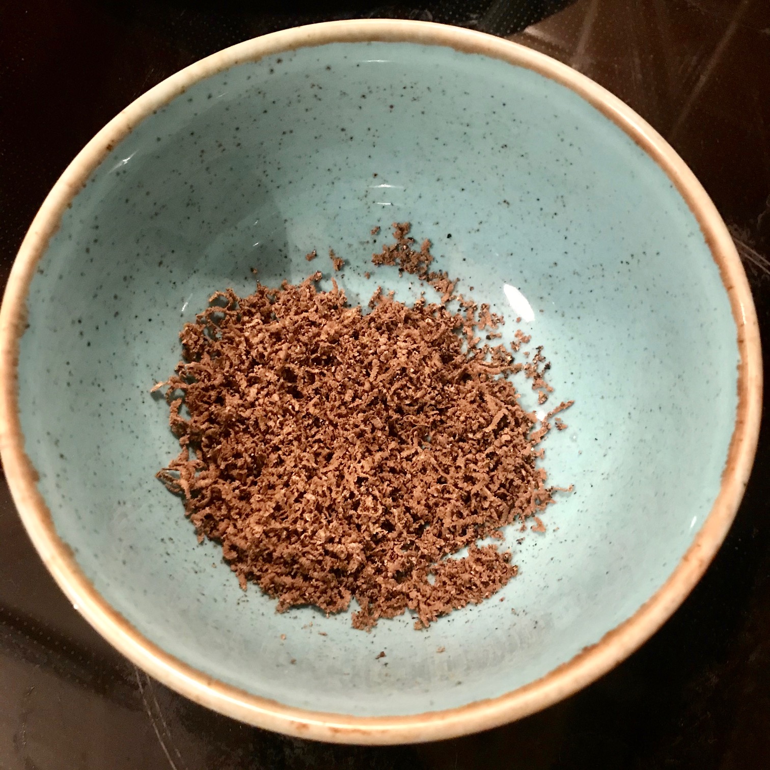 Şimdiii soğanı, pirinçleri kavurduk, şarabı çektirdik, kremayı, karabiber ve tuzu koyduysak en önemli kısma, trüf meselesine gelebiliriz. Elimde gördüğünüz parça 30 grama yakın. İki kişilik risotto için yarısını rendeleyerek kullanacağım. Rendenin en ince tarafıyla, minik minik… Kalanını da incecik traş dilim yapıp zeytinyağının içine atıyorum. Onlar sonra lazım olacak.