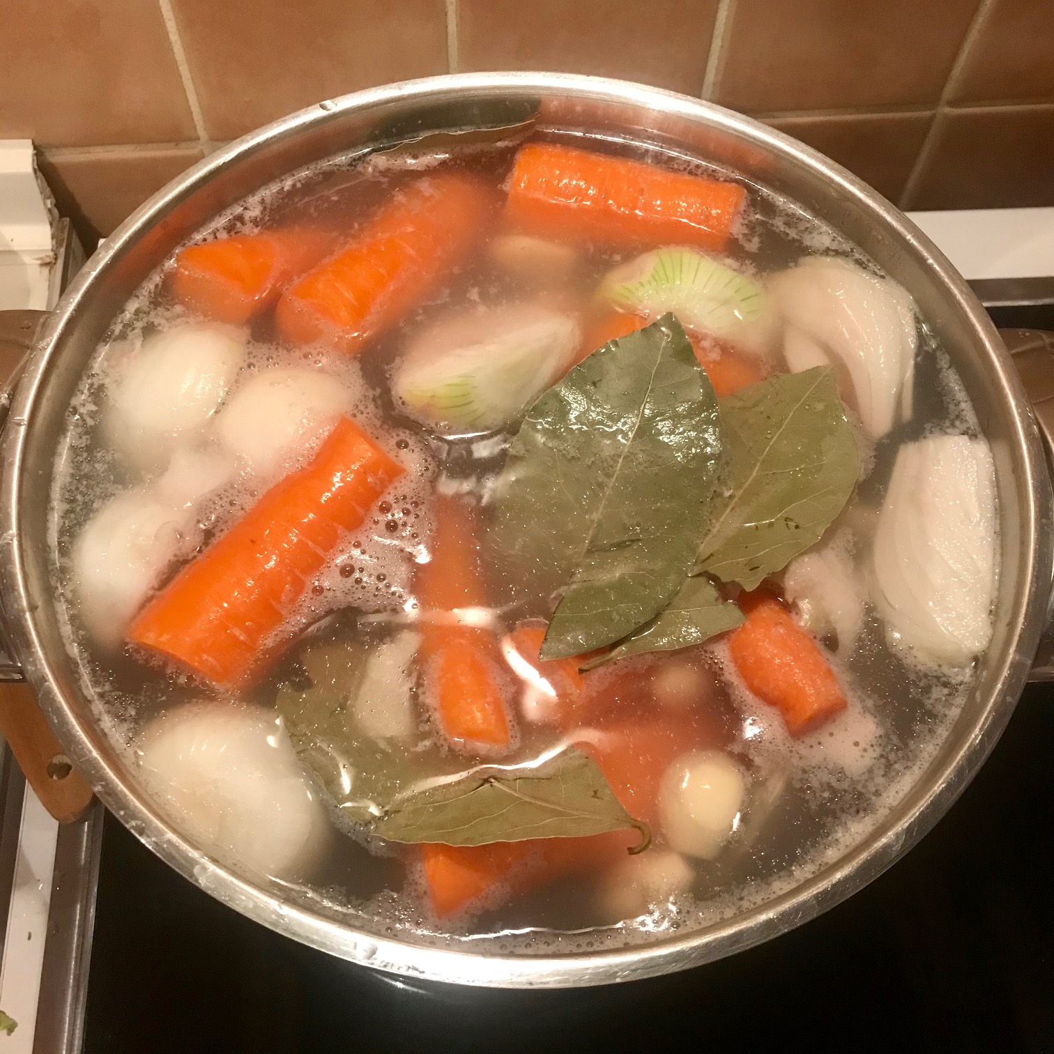 Özellikle büyük balıkların hem kafalarında çok etleri olur (bilhassa lezzetli yanaklarını unutmayın!) hem de fileto çıkarılırken belkemiklerinin etrafında çok et kalır. Ben bu çorbayı onları değerlendirmek için yapıyorum. Bu çorba için temizlettiğim 2 kiloluk iki kaya levreği ve bir dülger balığının kafasını ve kemikli-etli kısımlarını kullandım. Dülger balığı çok lezzetli bir balık olarak bilinir malum, denemediyseniz denemenizi, kafasını da bu çorbada kullanmanızı öneririm. Öncelikle bu kısımları 3 büyük havuç, 4 soğan, 4 diş sarımsak, birkaç dal rezene sapı, birkaç yaprak defne ve tuz, yarım limonun suyu, tuz, karabiber eşliğinde haşlanması için 2 litre suya koydum. Koyduğunuz kısımların pulsuz, temizleniş olmasına dikkat ederseniz çorbayı yerken ağzınıza daha az pul gelir. Balık zaten çok kolay haşlandığı için 15 dakika civarında tamamen pişmişlerdi. Bu haşlama işi bittikten sonra sebzeleri rondoya alıp çektim, kenara koydum. Balıkları alıp ayıkladım. Bu kısım kılçıklar açısından epey dikkat gerektiriyor, güçlü bir ışık altında yaparsanız daha iyi olur. Ayıklanan etleri de bir kenara aldıktan sonra tenzerede kalan suyu süzdüm. Bu hem çorbaya daha berrak bir stok su sağlıyor hem de illa ki haşlanırken suya düşen kılçık, pul vs. oluyor.