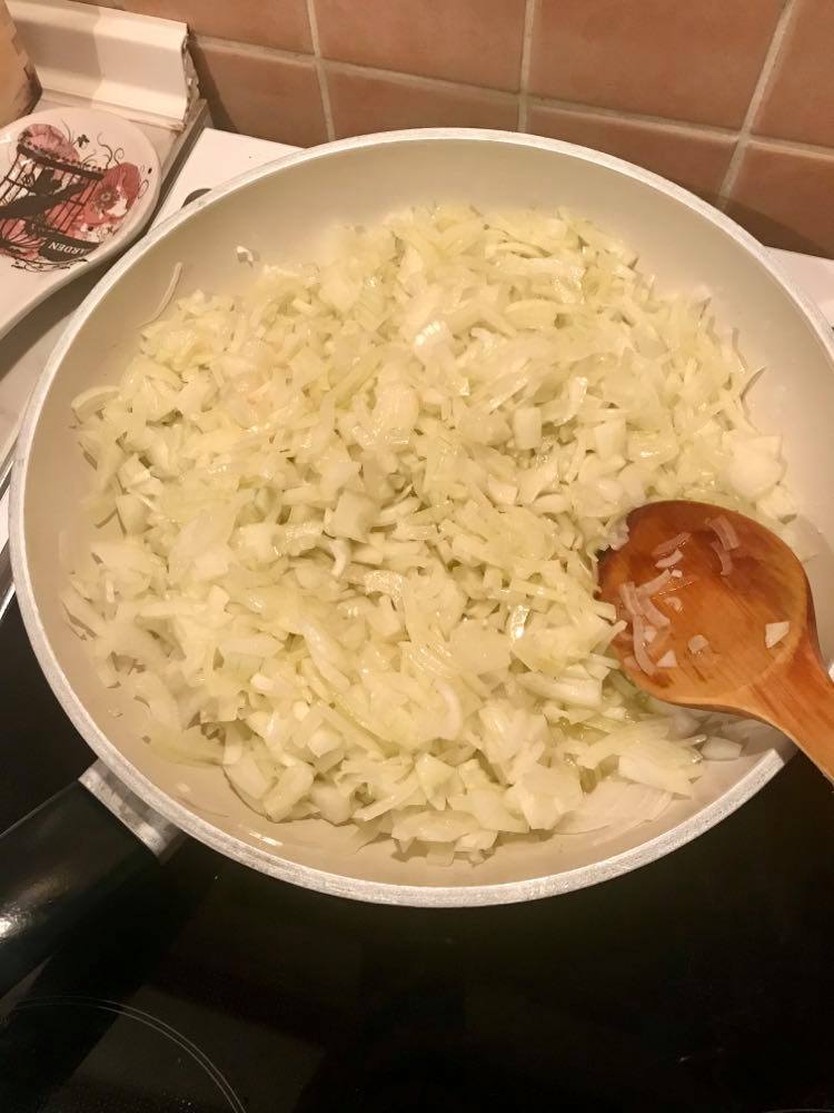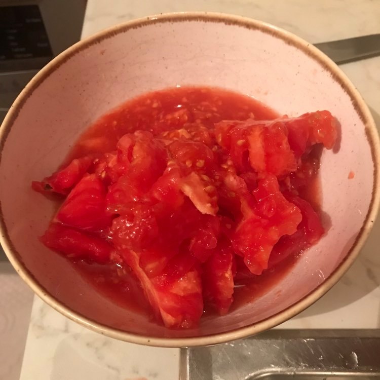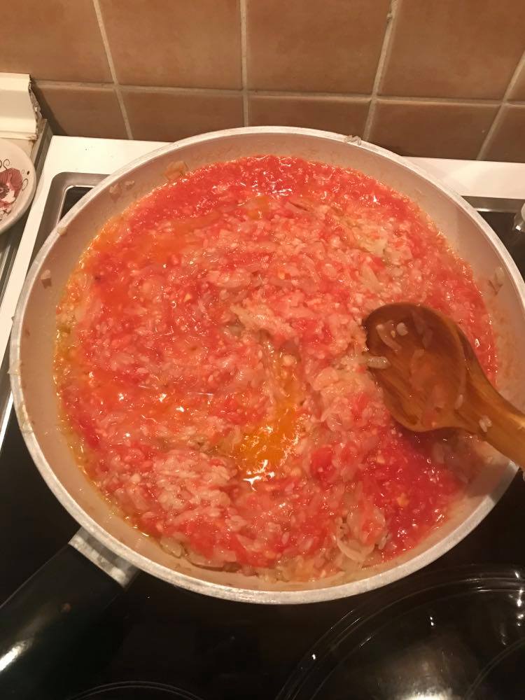 Evvela her dolmada olduğu gibi, “soğan, daha çok soğan”… Yani 1 su bardağı pirinç için en az 4 orta boy soğanı ince ince doğrayarak zeytinyağında öldürerek başlıyorum işe. (Domateslerin büyüklüğü kullanılacak iç miktarını etkileyeceği için bunu tam tutturmak zor olabilir, ama ne gam, zaten artarsa da neffis bir pilav olarak yeniveriyor! Ben 8 dev domates için 1 su bardağından yaptım, birazı da arttı.) Soğanların iyice ölmesi, her zamanki gibi önemli… Onların ölmesini beklerken domateslerin ortalarını oydum. Kenarlarını çok ince bırakmamaya dikkat edin, pişirirken delinmesinler. Oyduğunuz kısımları kenara alın, harcı için lazım olacak.