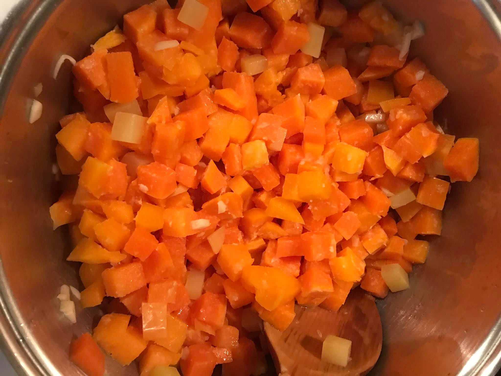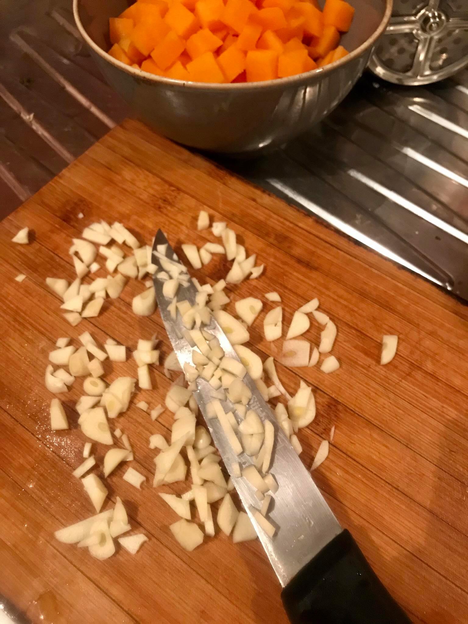 Bir yandan patatesleri karıştırıp bir yandan bal kabaklarını da aynı şekilde küçük küçük doğradım, kenara yığdım. 8 diş sarımsağı soyup onları da ufak ufak doğradım. Önce sarımsakları patateslerle birlikte çevirdim, kokusu çıkınca bal kabağı küplerini de ekledim. Karıştırarak yüksek ateşte çevirmeye başladım. Genellikle çorbalarım çok beğenilir ve lezzetli bulunur, sırrı da buradadır. Her ne sebze kullanıyorsam ateşte uzun uzun çevirir, kavurur, sonra çorbaya dönüştürürüm. Tabii ki sebzeleri direkt haşlayarak da çorba yapmak mümkün, şüphesiz daha da pratik, ama tadı kesinlikle böyle lezzetli olmuyor o zaman.