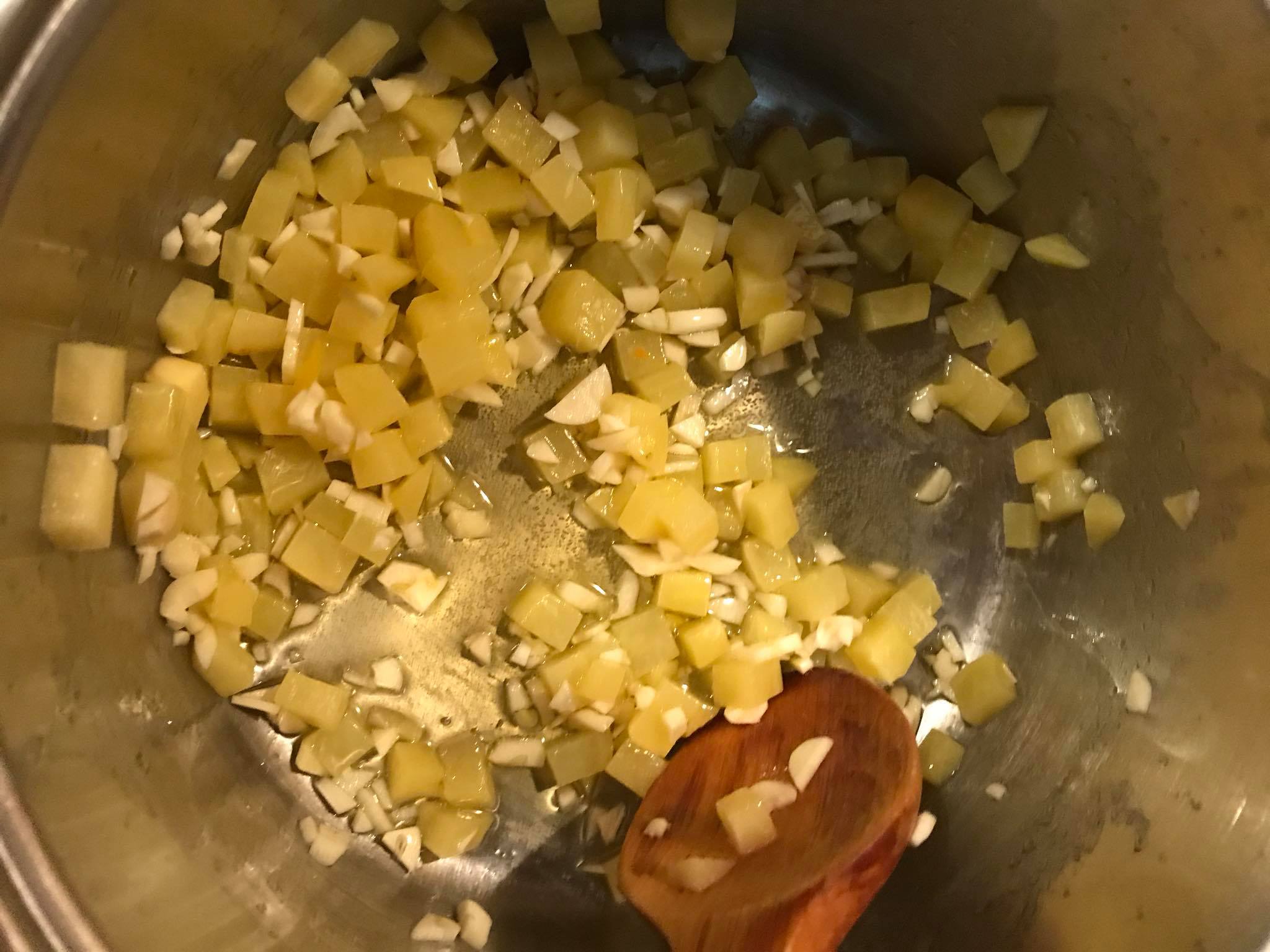 Derin bir tencereye 3 dolu dolu kaşık tereyağ (60 gr) ve 5-6 kaşık zeytinyağı koydum. (Yağı baştan biraz az tutuyorum, çünkü sonra kremanın yağı da devreye girecek.) Tereyağı erirken, bir orta boy patatesi soyup tavla zarından az büyük küpler halinde doğradım (macedoine kesim diye geçer hani, ondan). Ateşi küçültüp patatesleri attım ve ara ara karıştırarak kavurmaya başladım. Patates nişastalı olduğu için tencerenize yapışabilir, o yüzden başından ayrılmamak gerek, en az bir 15 dakika kendi başına kavrulmalı.