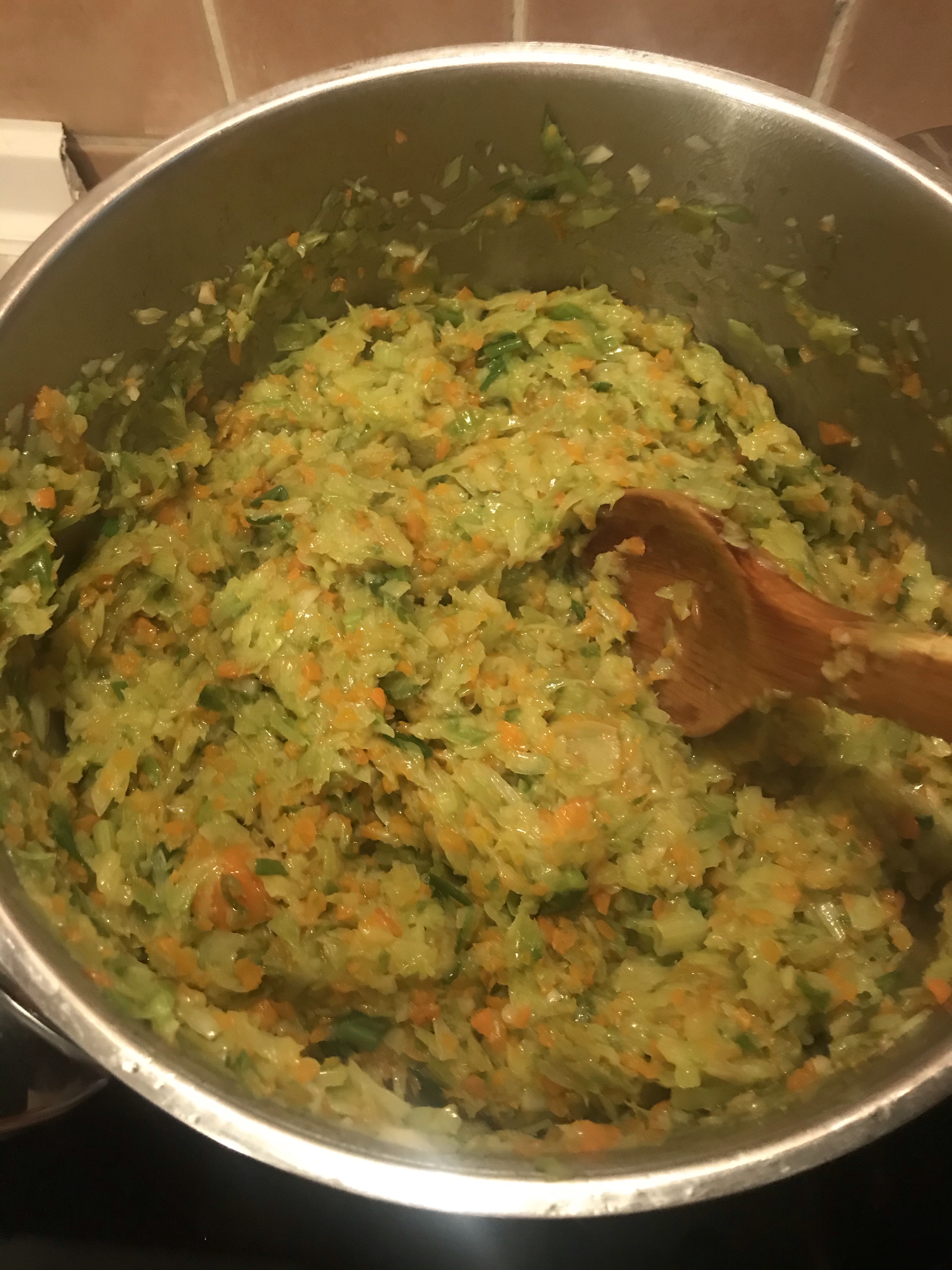 İşe bir kilo pırasayı 3-4 parmak eninde parçalar halinde kesip rondoda kıyarak veya elde ince ince kıyarak başlıyoruz. 5-6 kaşık zeytinyağı ile kıyılmış pırasaları ateşte çevirmeye başlıyorum. Hemen ardından soğan ekliyorum. Pırasaya soğan ilave etmeye gerek yok gibi gelebilir, hatta bana da öyle gelirdi eskiden, sonra şef dostlarımızdan pırasa kullandığım her şeyde pırasanın tadını yumuşatarak belirginleştirmek için muhakkak soğan eklemek gerektiğini öğrendim. O günden beri bir de soğan katıyorum, hakikaten daha güzel oluyor! Evdeki bir demet taze soğanı değerlendirmek için bu kez ondan koydum, ama normalde bir irice kuru soğan ekliyorum, dilediğinizi seçebilirsiniz. Soğanın hemen ardından 4 irice havucu da yine rondodan geçirerek veya rendeleyerek tencereye ilave ediyorum. Dilerseniz bu karışıma 1-2 orta boy patatesi de minicik küpler halinde doğrayarak ilave edebilirsiniz, ancak şart değil.