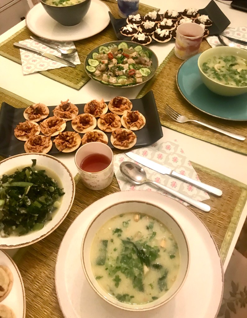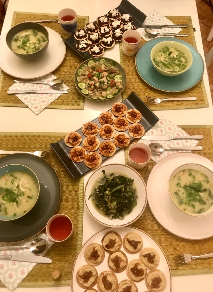 Bize birkaç gün öncesinden yemekleri ve gerekenleri açıkladı İpek, ona göre alışveriş yaptık. Menüyü de ortak isteğimizle deniz mahsulü teması üstüne kurdu. Hepimiz de tariflere ufak tefek dokunduk, dolayısıyla “en orijinal, en doğru” olduğu gibi iddialarımız yoktu, ama lezzet konusunda kesinlikle harika sonuçlar aldık. Asya mutfağını sevenler için biraz Japon, biraz Thai esintili bir menü oluşturmuştu İpek, hatta bir de tatlı tarifi vardı ama ben onu pas geçtim, deniz mahsulü masasına oturmak için kendimizi hazırladık, şaraplarımızla, kanepelerimiz de yemeklere eşlik etti…