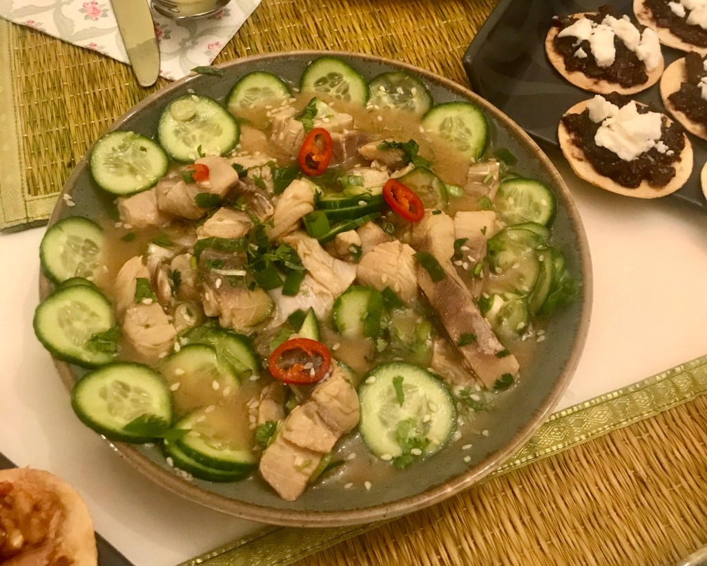 Masaya geçtiğimizde soğuk başlangıç olarak levrekli sunomono, kanepe olarak da üstünde koyun peyniriyle incir chutney, karamelize cevizli çerkes tavuğu ve ançüezli humus vardı. Hepsi gerçekten harikaydı, kanepeleri arkadaşım önden hazırlayıp getirmişti, sayesinde beyaz ve roze şaraplarla nefis bir başlangıç yaptık. Sunomono ile ceviche’yi birleştirdiğimiz tarif öyle başarılı oldu ki, soğuk bir anayemek olarak da rahatça yiyebileceğimize kanaat getirdik. Ama ah o tom kha gai… Bu kadar mı güzel olur! Yıllar önce gittiğim Tayland’da yediğim yemeklerin tadını yeniden damağımda hissettim. Daha da güzeli, “Öğrendim nasılsa, çok da kolaymış, bunu artık yaparım ben!” diyebilmekti. İnsanın sevdiği bir tadı kendisinin yapabilmesi kadar özgürce bir şey olabilir mi!