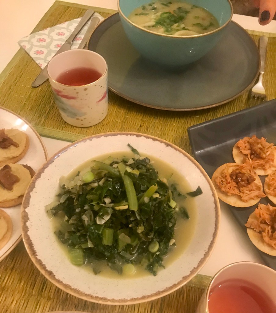 Çorbayı hazır ederken bir yandan tavada iki demete yakın pazıyı da chilli, sarımsak, yarım avuç taze zencefil, karabiber ve tuzla soteledik. Basit ama çok lezzetli bir yan yemek olarak hızlıca hazır oldu. Çorbayı da ocaktan aldıktan sonra kaselere pay ettik ve bolca taze soğan ile kişniş ekledik. (Kişniş sevmeyenler onu pas geçebilir.) İlave acı isteyenler birkaç taze chilli dilimi de atabilir. Ve işte, şimdi her şey hazır!