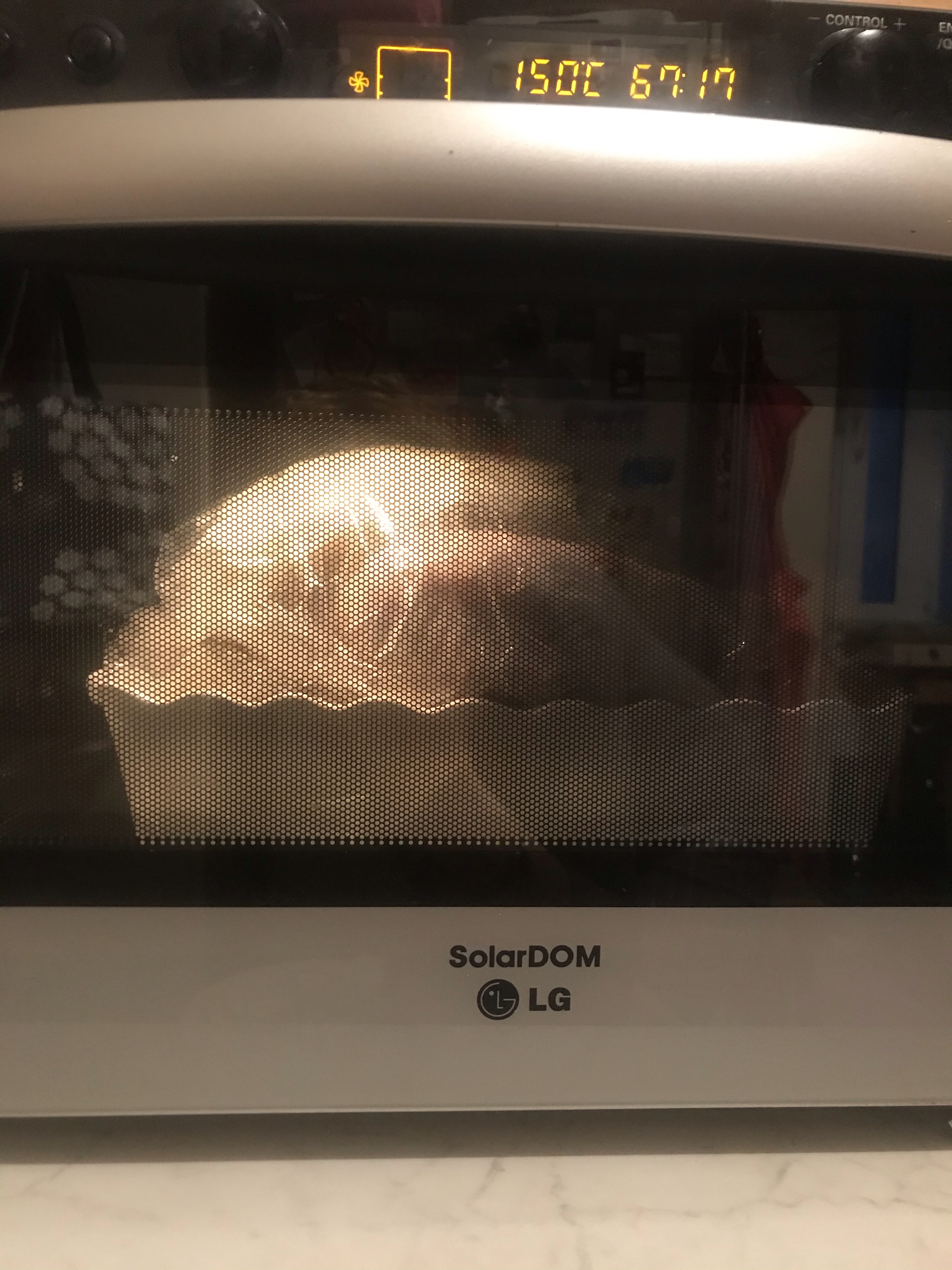 Bu hazırlıklardan sonra, fırına koymadan 2 saat önce buzdolabından çıkarılmış ve böylece oda ısısına inmesi sağlanmış hindimizi fırına attık. 5 kilo civarındaki hindimiz önce 150 derecede 2,5 saat kadar pişti. Sonra pişirme torbasından çıkardık, göğsündeki yağlı kağıtları aldık, bıraktığı yağını kaşıkla üstüne döküp parlattık ve yeniden fırına verdik. 1,5 saat de 165 derecede pişti. Toplam 4 saate hiç kurumadan, üstü nar gibi kızardı. Rengi o kadar güzel oldu ki üstüne herhangi bir glaze, sos bile yapmadık, sadece kendi yağı ve tereyağıyla mükemmel kızardı, derisi çıtır içi ise pamuk gibi oldu. (Hindiniz daha büyükse sürelerin daha da uzayacağını göz önünde bulundurun yalnız.)