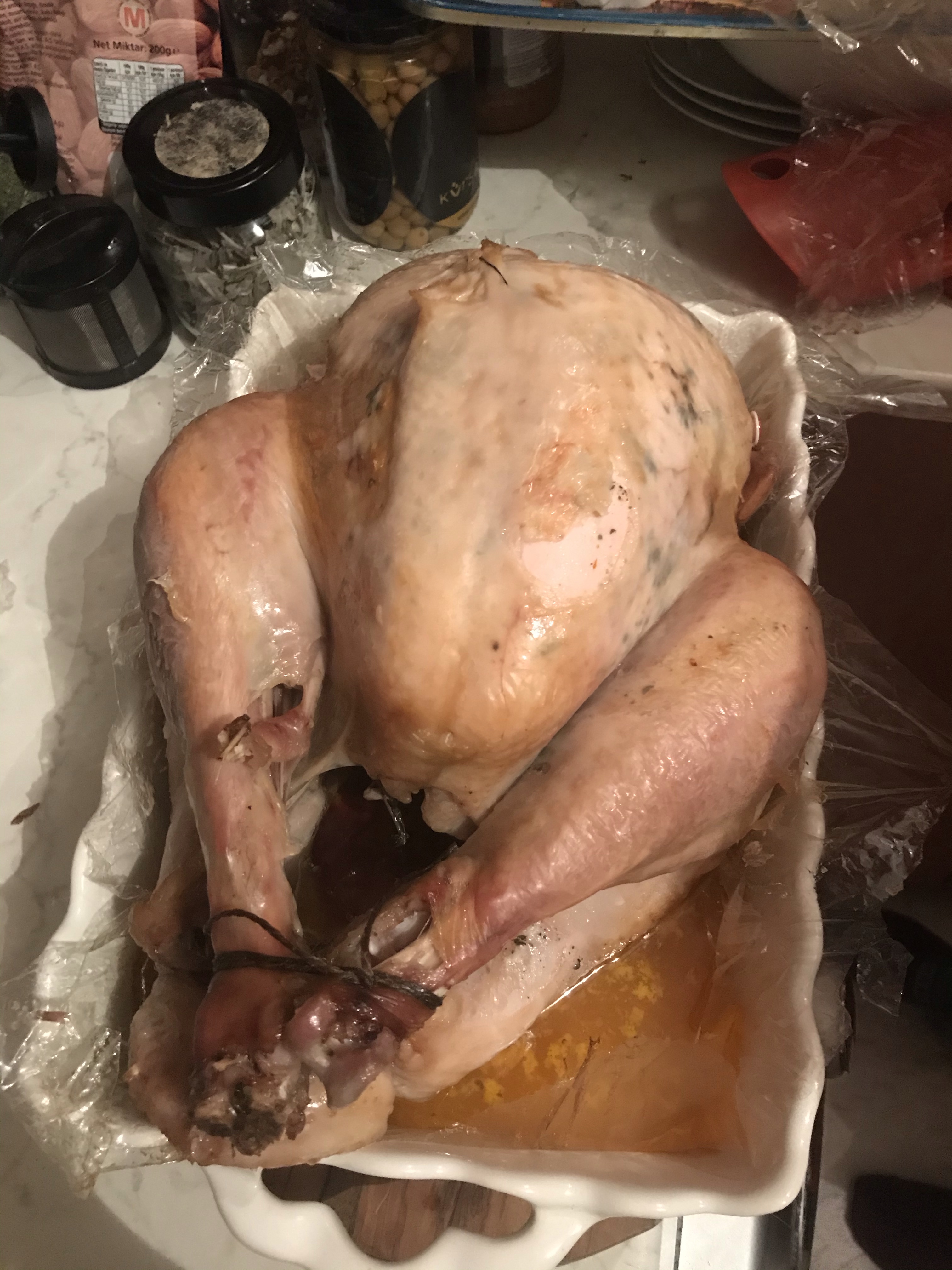 Öncelikle hindiyi üç gün önce brine (salamura su) hazırlayarak banyoya yatırdık. Bu “güzellik banyosu” için hindinin sığabileceği kadar büyük bir kabın içine kaynar tuzlu su koyduk ve içine kabuklarıyla birlikte dörde bölünmüş soğan, birkaç diş sarımsak, tane karabiber, taze kekik ve biberiye dalları, defne yaprakları attık. Su soğuyunca hindiyi de içine koyduk, ağzını kapattık, buzdolabına yerleştirdik. Bunun triği şu; hindi bu suyun içinde bekleyince hem eti suyla şişiyor ve pişerken kurumuyor, nemli kalıyor, hem normalde dışarıdan böyle büyük bir et parçasının içine kadar girecek tuzlama yapmak mümkün değilken bu sayede etin her yeri eşit şekilde tuzlanıyor, hem et aromatik lezzetlerle marine oluyor, hem de soğan kabukları hindinin dışına güzel bir renk veriyor. (Bu yöntemi tüm kanatlılara lezzet katması için, ayrıca kuzu budu gibi büyük etlerde kullanabilirsiniz.) 24 saat bu suyun içinde kaldıktan sonra hindiyi çıkardık, lavaboya dikine gelecek şekilde astık, suları süzüldü ve kurudu. Ardından 400 gram kadar tereyağın içine sarımsak, taze kekik, karabiber ve tuz koyup yoğurdu İbrahim, yağ hafif eriyip yumuşayınca hindinin etiyle derisinin arasını komple bu yağla yağladı, adeta masaj yapa yapa her yerine yedirdi. Sonra 24 saat de bu şekilde bekledi hindimiz. En son hindiyi bağladı, dikti ve pişirme torbasına koydu İbrahim. Göğsünün üstüne de önce ikiye katlanmış yağlı kağıt, onun üstüne de ikiye katlanmış alüminyum folyo yerleştirdi, zira göğüs hem fırının tavanına yakın olduğu için daha çok kızarıyor, hem de daha yağsız olduğu için erken pişip kuruyabiliyor.