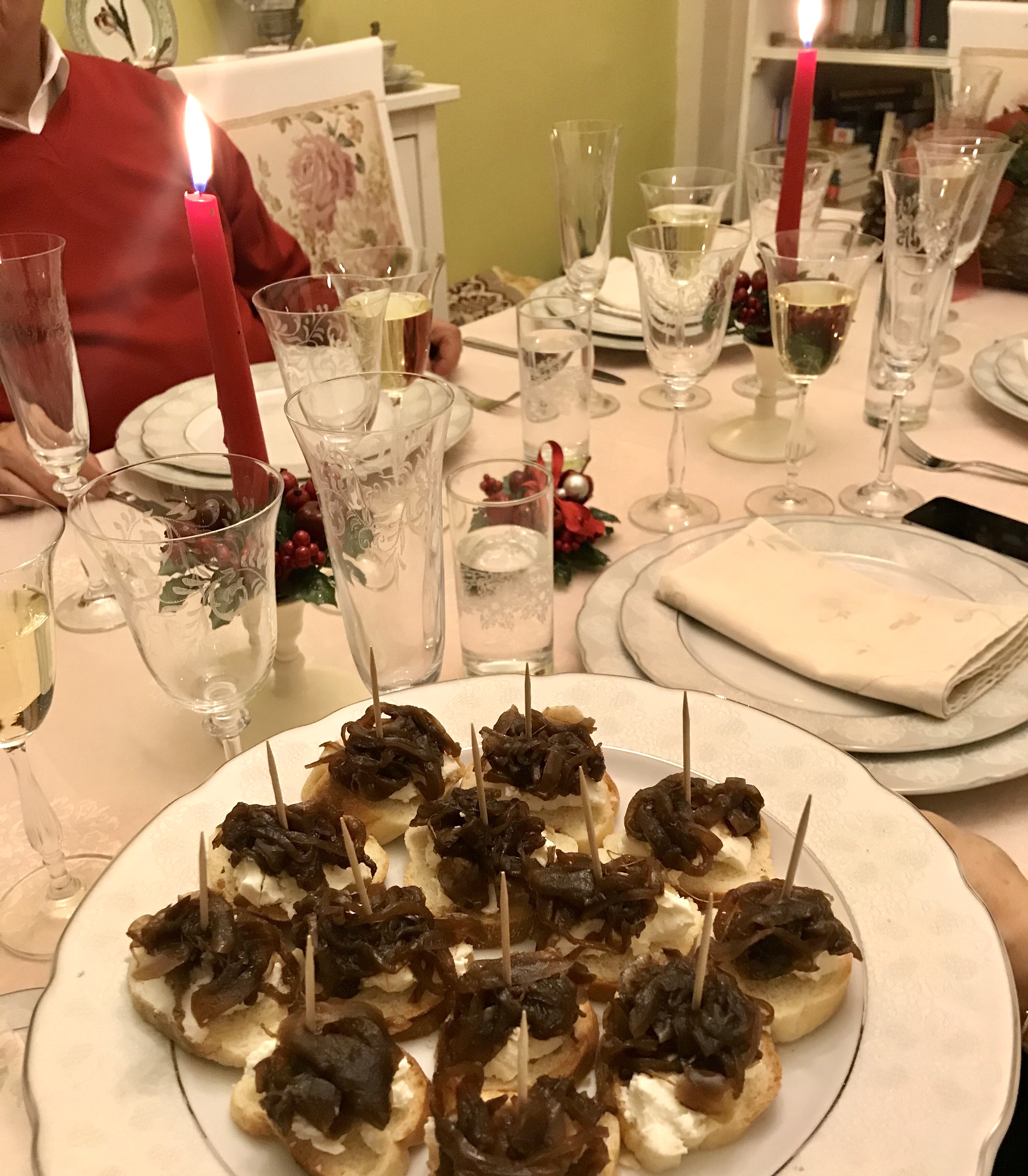 Fırınlanmış baget dilimleri üstünde keçi peyniri ve soğan reçeli