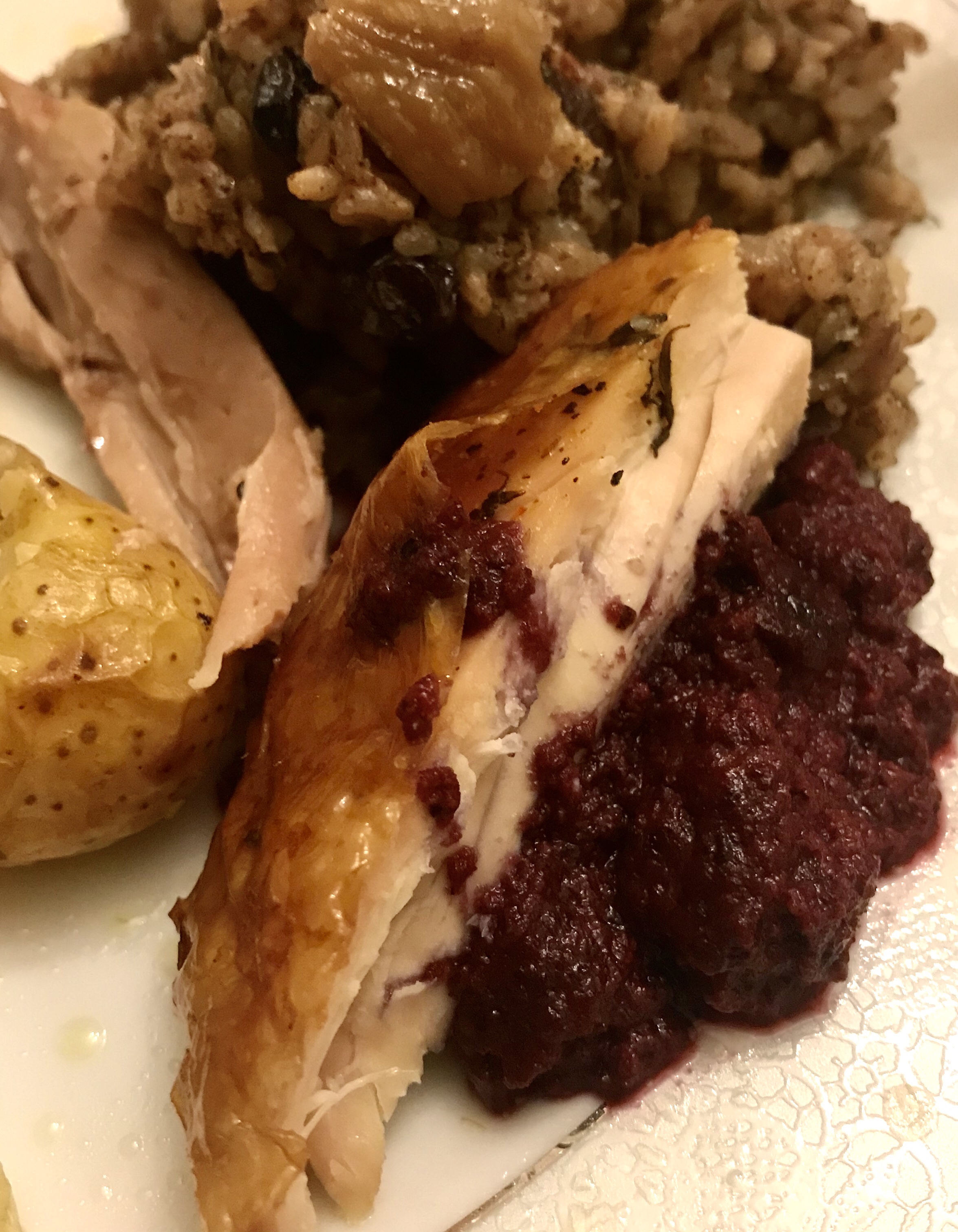 Fırın hindi, yanında cranberry (turna yemişi) ve blueberry (yaban mersini) sos ile