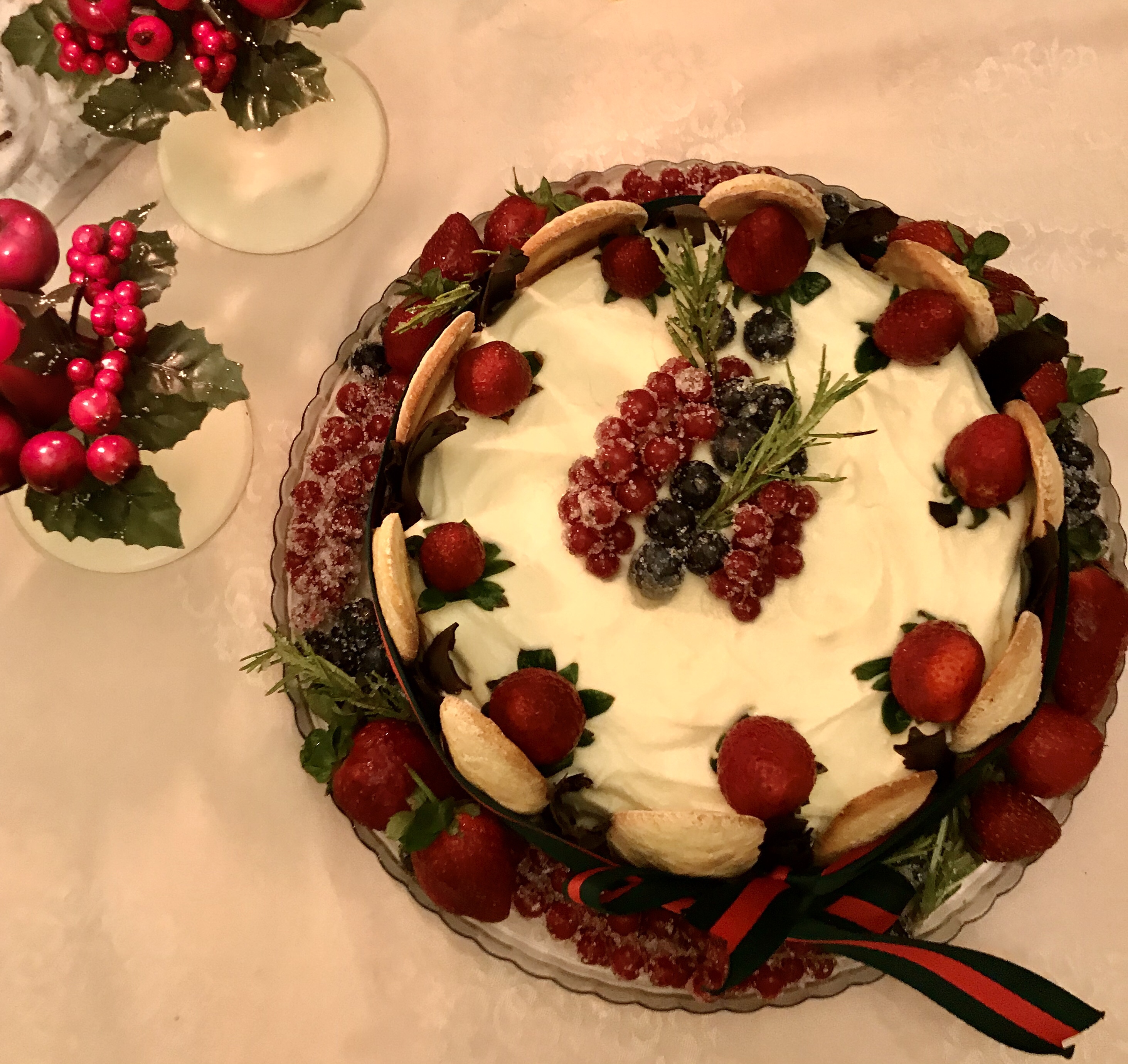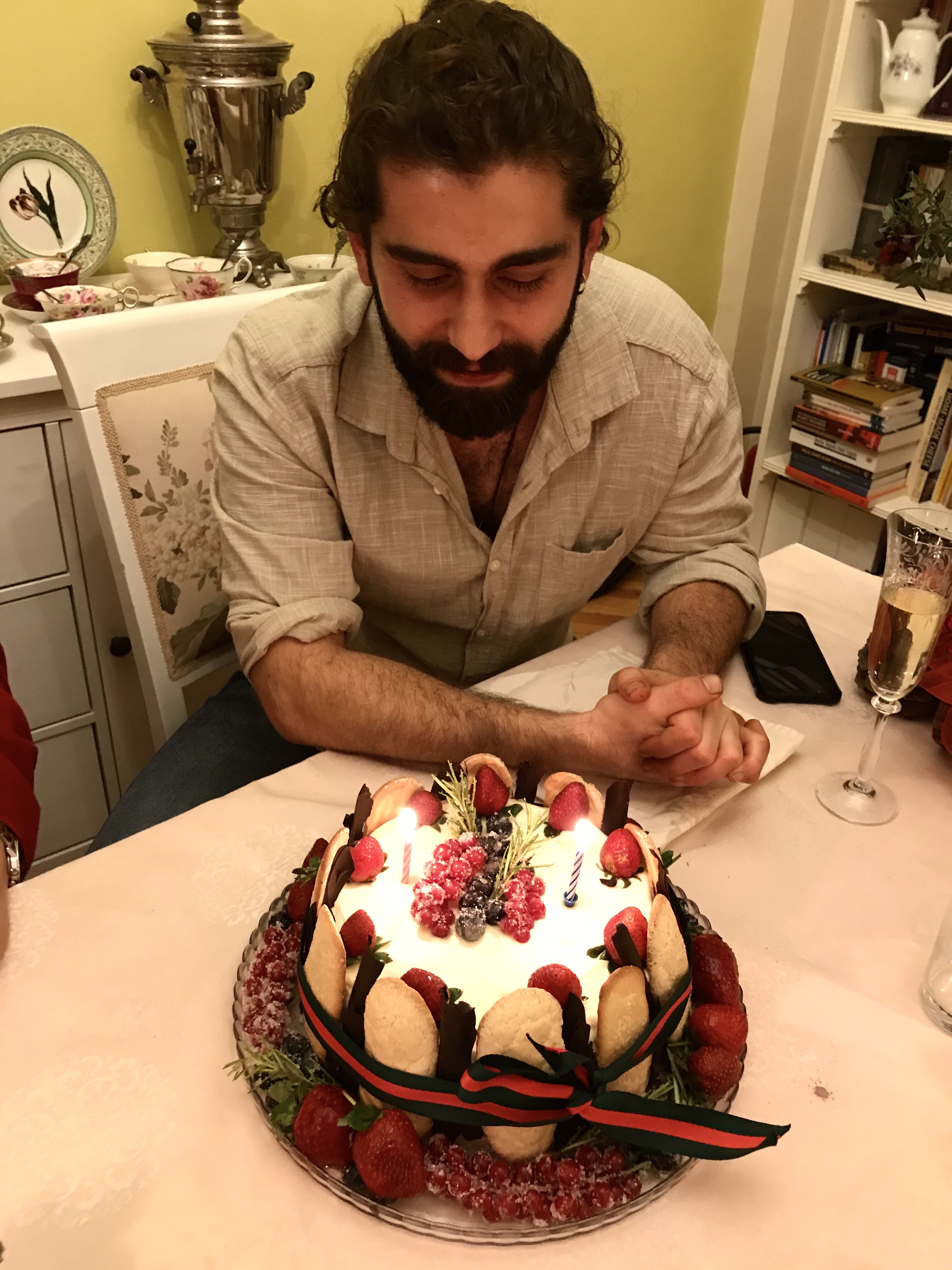 Bu sene hizmet sektöründe çalışanların çoğu belki de yıllardır ilk kez yılbaşı kutlayabildi, İbrahim de keza aynı durumdaydı. (Hoş bizim için o kadar hindi, sebze filan yaptırdık, çalışmamış sayılır mı acaba!) Başka zaman belki istesek bile hep birlikte yılbaşı kutlayamayız, o yüzden o ne kadar mutluysa doğrusu biz de o kadar mutluyduk. Elinin maharetiyle hepimiz için harika bir yemek yarattı, biz de ona küçük bir sürpriz yapmak istedik, zira 2 Ocak doğum günü, hazır aynı masada buluşmuşken kutlamasa mıydık? Gül hamur işi ve tatlılar konusunda müthiş yetenekli bir insan olarak annesinin özel pandispanyasını yaptı, puf puf pandispanyayı pastacı kreması, muz ve kırmızı meyvelerle süsledi. Charlotte görüntüsü vermek için etrafında dizdiği kedi dili bisküvileri ve çikolataları bile kendisinin yapmasına ne buyrulur peki? Biz şapka çıkardık doğrusu! Kırmızı meyveleri buz tutmuş gibi gözüksünler diye şekerlemesine ayrıca bayıldım ben. İnanılmaz lezzetli, çok da hafif ve taze bir pastayla hem İbrahim’e mum üflettik hem de yemeği noktaladık.