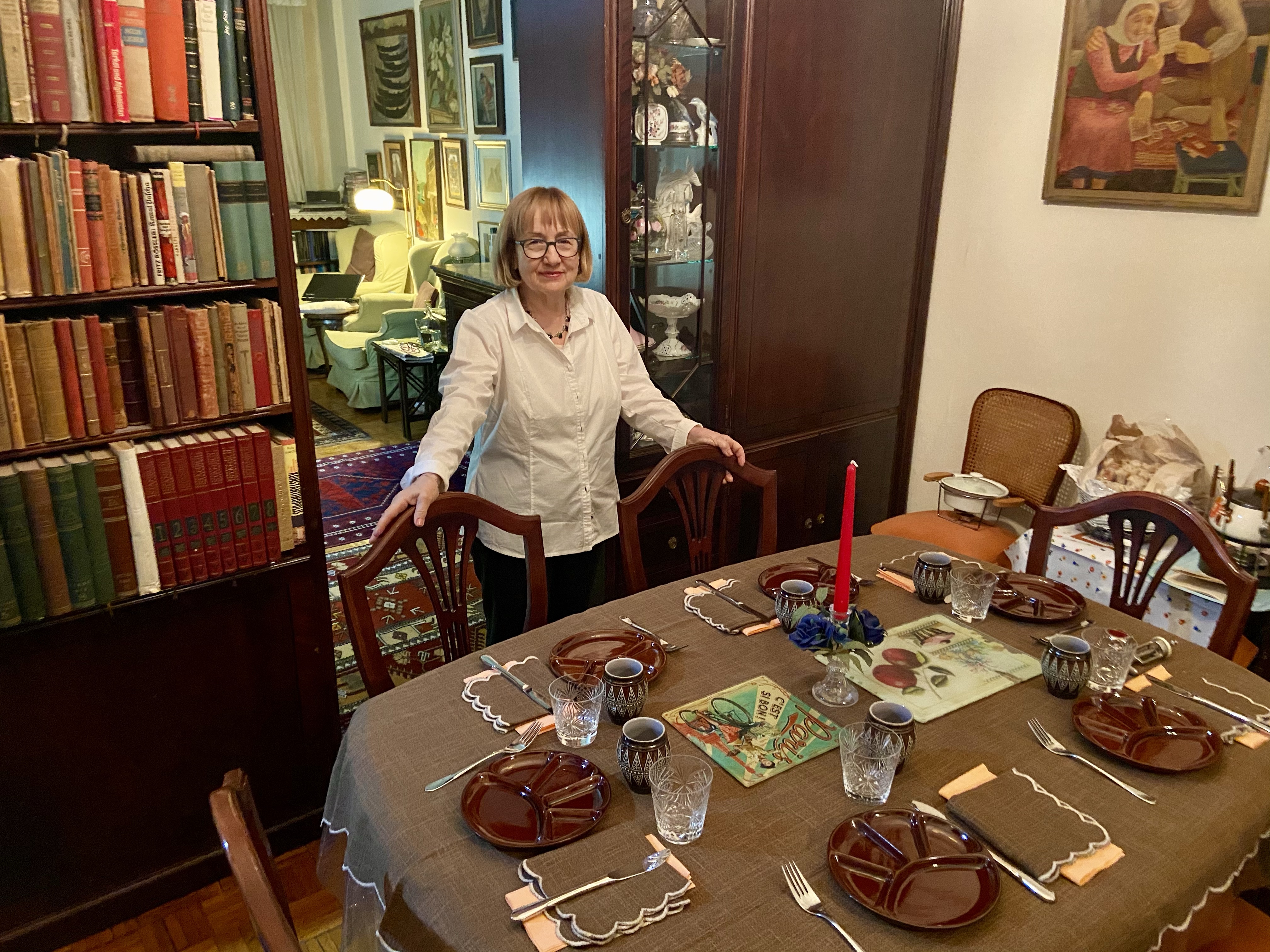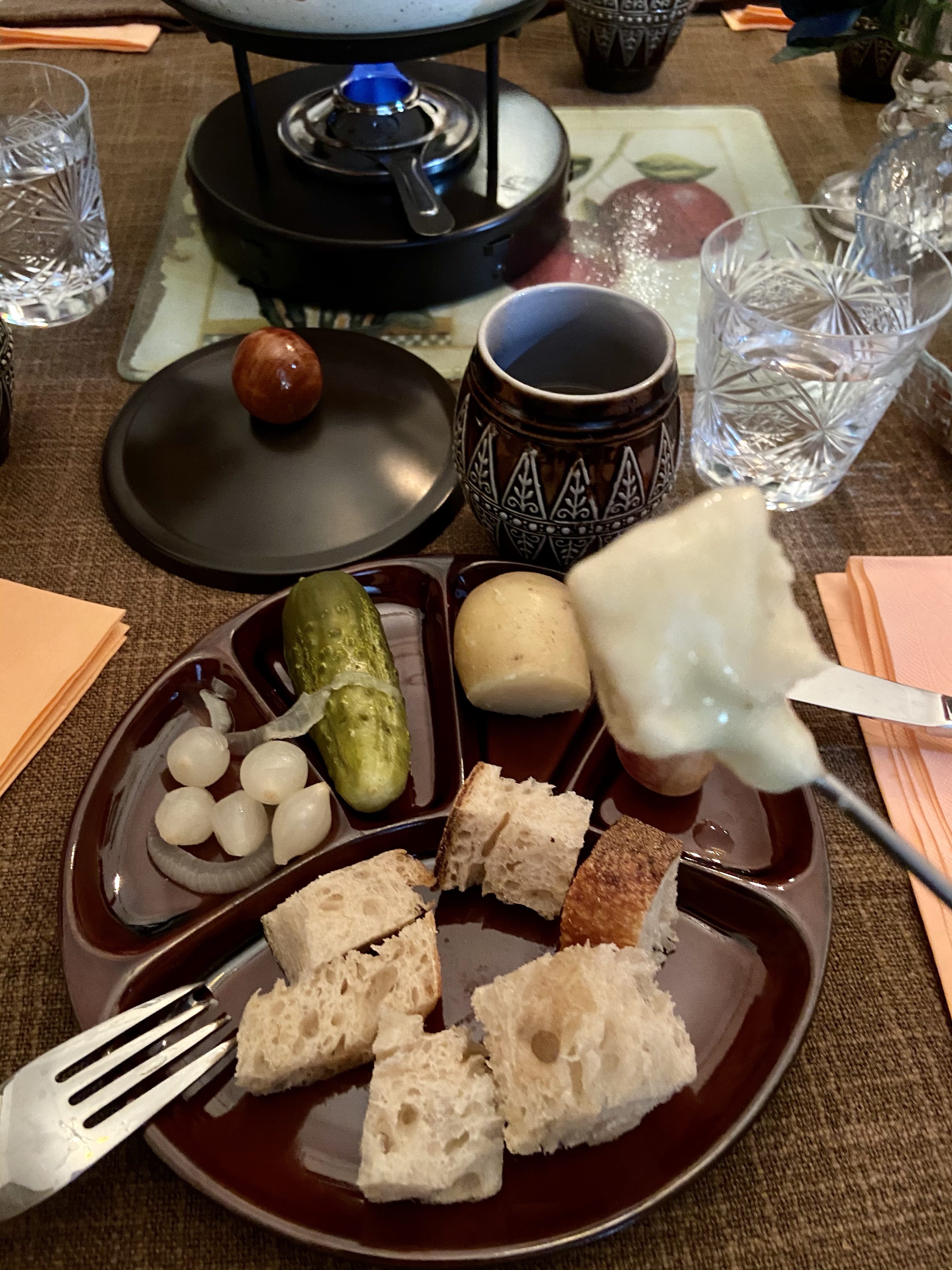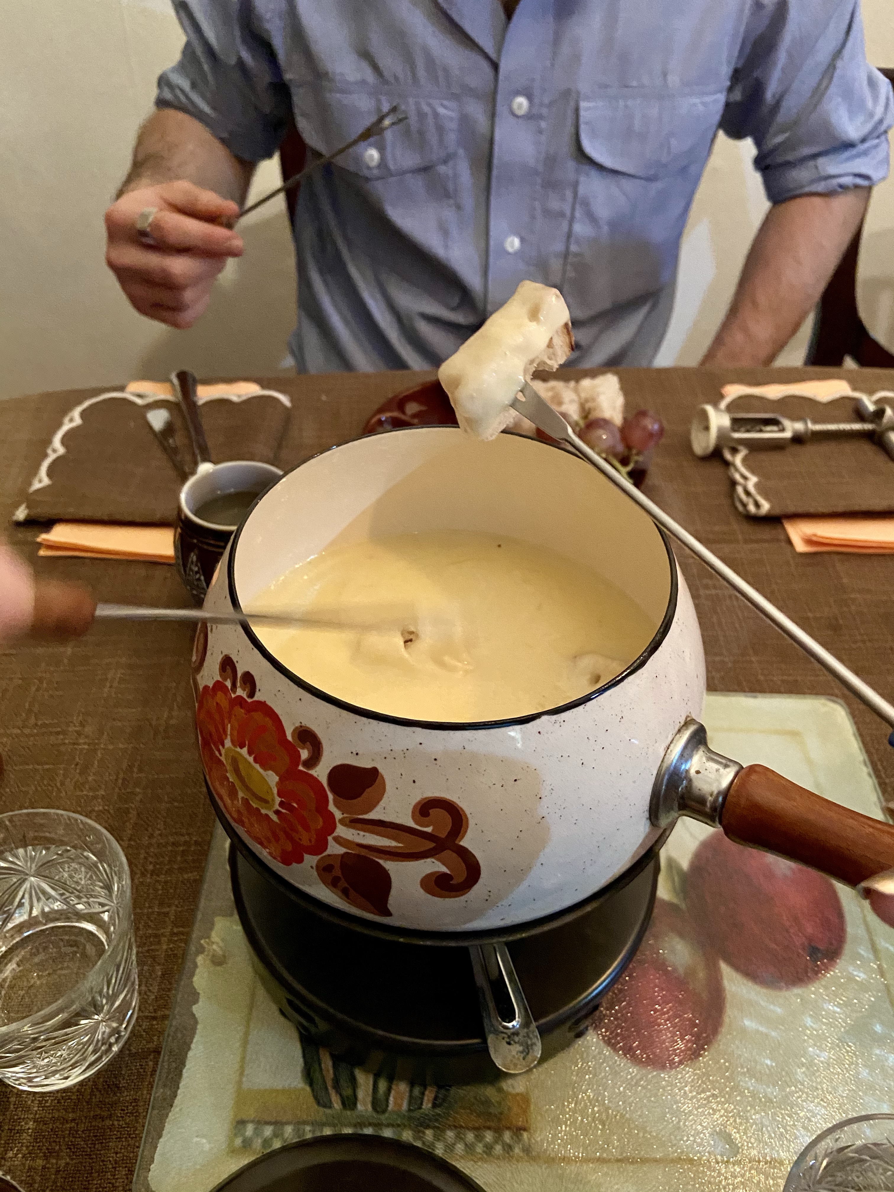 Tüm bunları hazır ettikten sonra işin en güzel kısmına sıra geldi, konuşa konuşa, sohbetle, keyifle yiyip içmek… Patateslerin üstüne erimiş peynirlerden döktük, bir turşulardan bir üzümden ağzımıza attık, önce beyaz şarap sonra kırmızı şarapla bardaklarımızı doldurup boşalttık… Yemeğe keyif katan, sohbet kadar biraz da görsel güzellikler tabii. Sofranın bu güzel düzeni, renklerin uyumu tamamen zevkli komşum Bilge Hanım’ın eseri… Fotoğraflarda gördüğünüz bölmeli fondü tabakları, ispirto ocaklı fondü seti ve seramik şarap bardaklarını komşularım 70’lerin sonunda Almanya’dan almışlar. (Hatta fondü setinin içinden çıkan Alman usulü fondü tarifleri kitapçığı bile duruyordu, pek şeker değil mi!) Gözümüzü okşayan bu detayların hepsine bayıldık! Bunlarla yiyip içerken sanki karantinada sıkışıp kaldığımız dünyamızdan kopup başka bir yere ışınlanmış gibi olduk… Ruhumuza nasıl iyi geldiğini tahmin etmek zor değil!