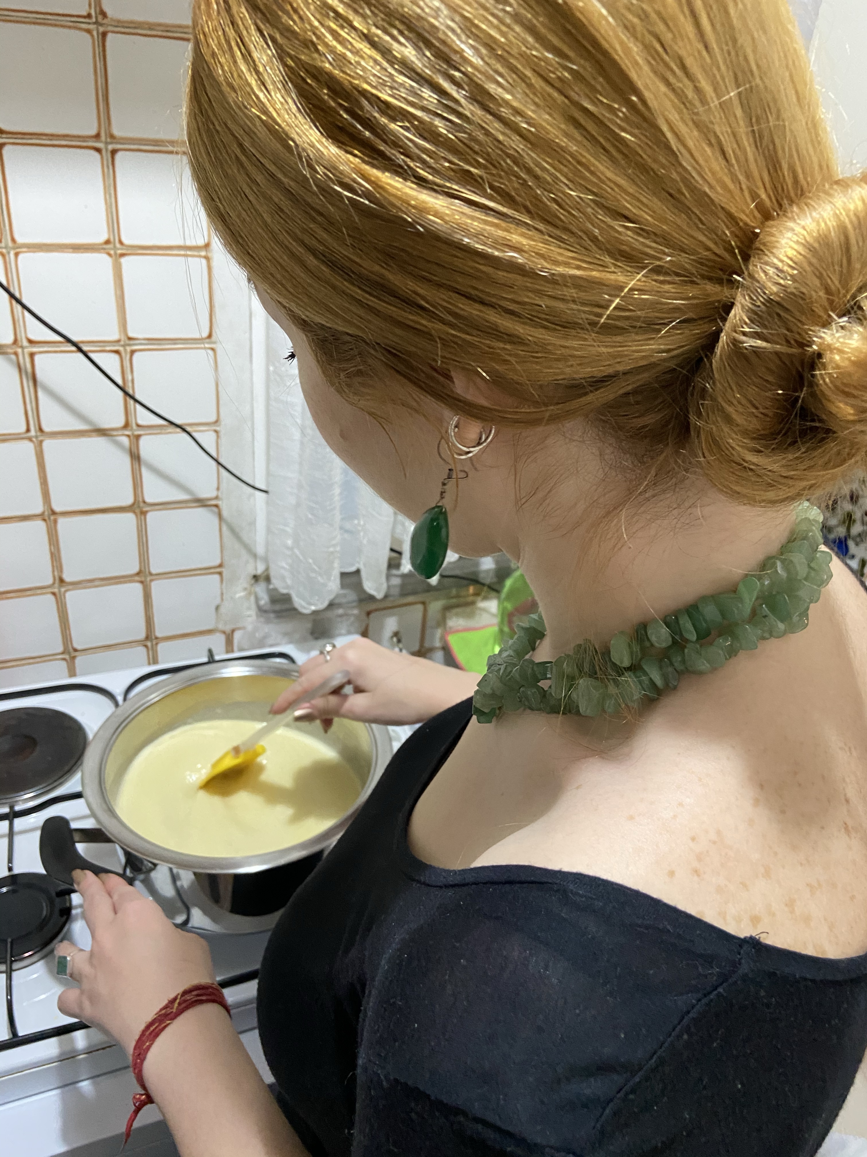 Fondülerin birkaç tipi var, benim bu hazırladığım “moitié-moitié” denen tipten, yani yarı yarıya… Sebebi basit, içinde eşit oranda iki peynir var, biri Suisse gruyère (yani gravyer), diğeri ise vacherin fribourgeois. Bu fondünün tarifi de gayet basit. Biz kalabalık olduğumuz için üç ölçü yaptık, ama iki kişi için bir ölçü yeter, ben de size bir ölçülük tarif vereceğim. Önce büyük bir diş sarımsağı soyup ikiye bölerek fondüyü hazırlayacağımız tencerenin içine komple sürüyoruz ki kokusu dağılsın. Sonra her iki peynirden iki yüzer gram (toplam 400 gram) rendelenmiş peynir koyuyor, 200 ml sek beyaz şarap, 1 yemek kaşığı mısır nişastası, biraz karabiber ve muskat, birkaç damla da limon suyu ekliyoruz. Hepsini aynı anda karıştırıp peyniri eritmeye başlıyoruz. Karışım asla fokur fokur kaynamamalı, ama kaynama derecesine yakın ısınmalı. Bu sırada tek püf nokta sürekli karıştırmak. Yaklaşık 10-15 dakika içinde peynir tamamen eriyecek, kıvama gelecek. (İlk bakışta peynir biraz sıvı gözükebilir ama fondü kabına alınca daha az ısı olduğundan kıvamı biraz katılaşacaktır, bunu göz önünde bulundurun. Yine de çok çok sıvı olduysa az daha nişasta ekleyebilirsiniz.)
