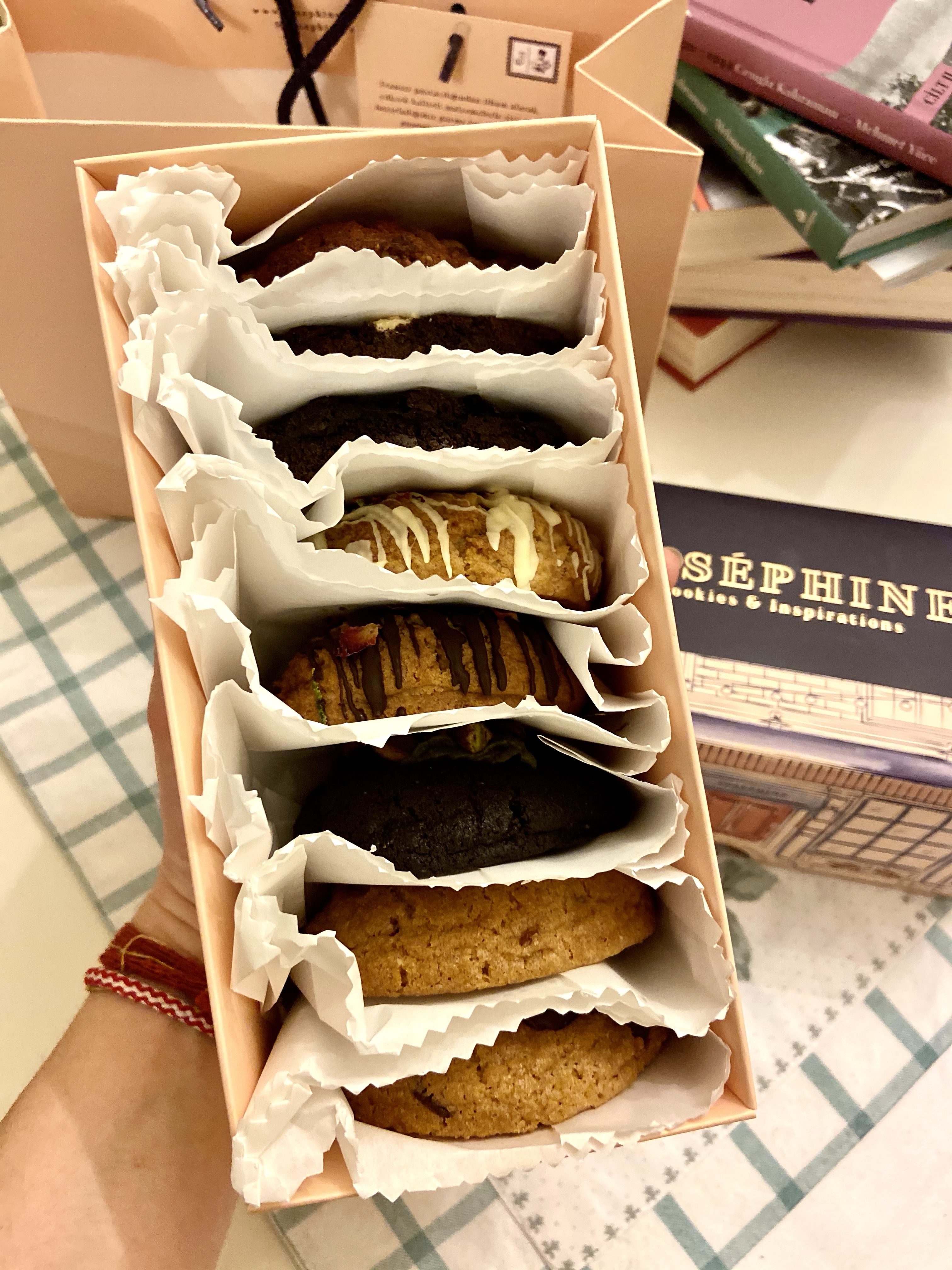 Kurabiye, ama ne kurabiye! Evvela özenli paketlemesi, müthiş zevkli kutusuyla çarptı beni. Abartısız, varaksız, alabildiğine zarif bir kutunun içinde, hiçbiri ezilmeyecek biçimde, her birinin neli olduğunu belirten küçük etiketler yapıştırılmış kağıtlarıyla tek tek dizilmiş çeşit çeşit güzellik… Suadiye’deki Joséphine Cookies‘in tezgahından gelen bu güzellikler vallahi sadece görüntüsüyle bile pek etkileyici! İkinci adım, koku. Kutunun kapağını açtığımda gelen koku muazzam: tereyağı, Antep fıstığı, yer fıstığı ezmesi, kakao, vanilya… Farklı lezzetlerin farklı kokuları birbirine karışırken iştahım da açıldıkça açıldı doğrusu!