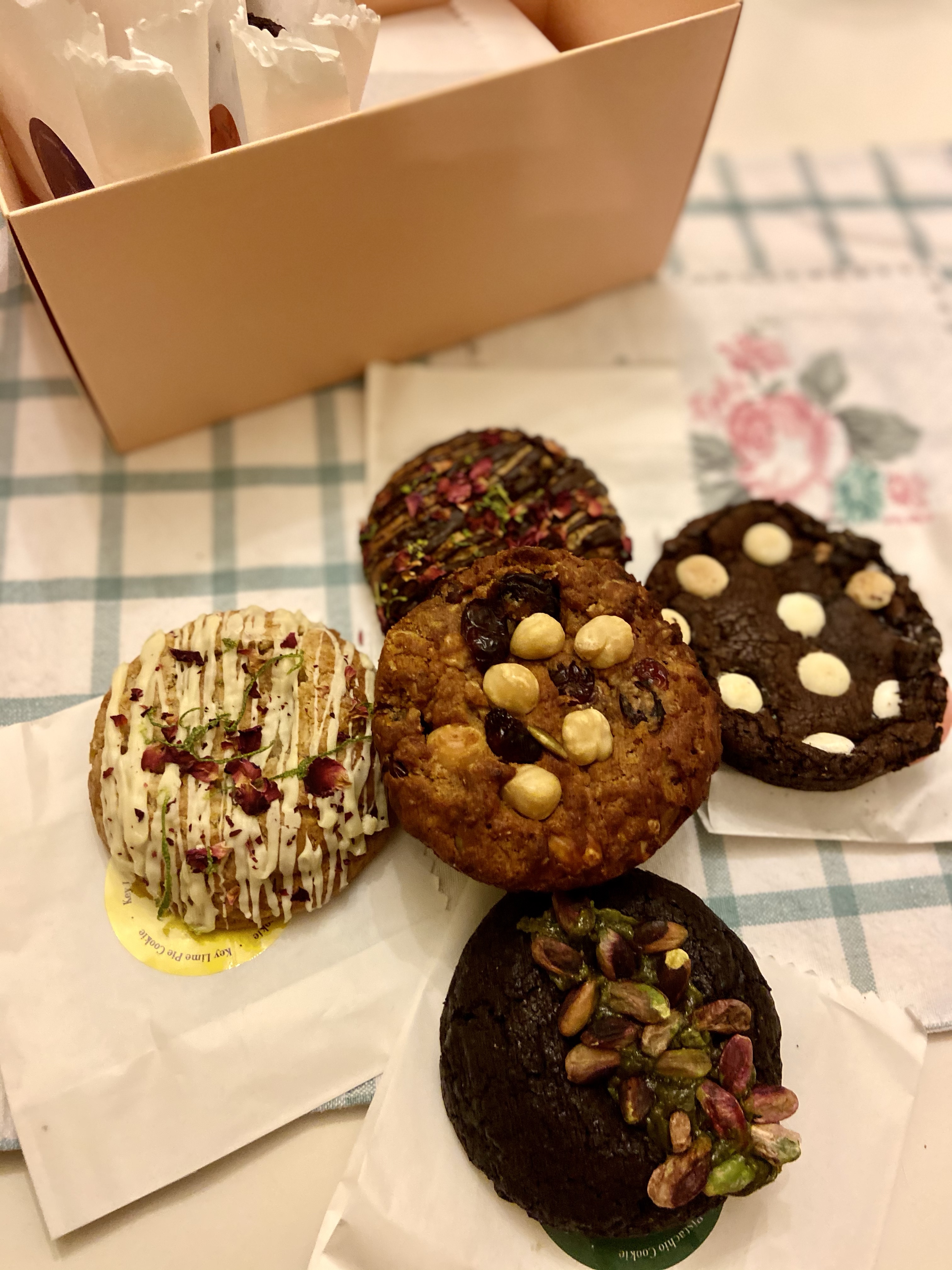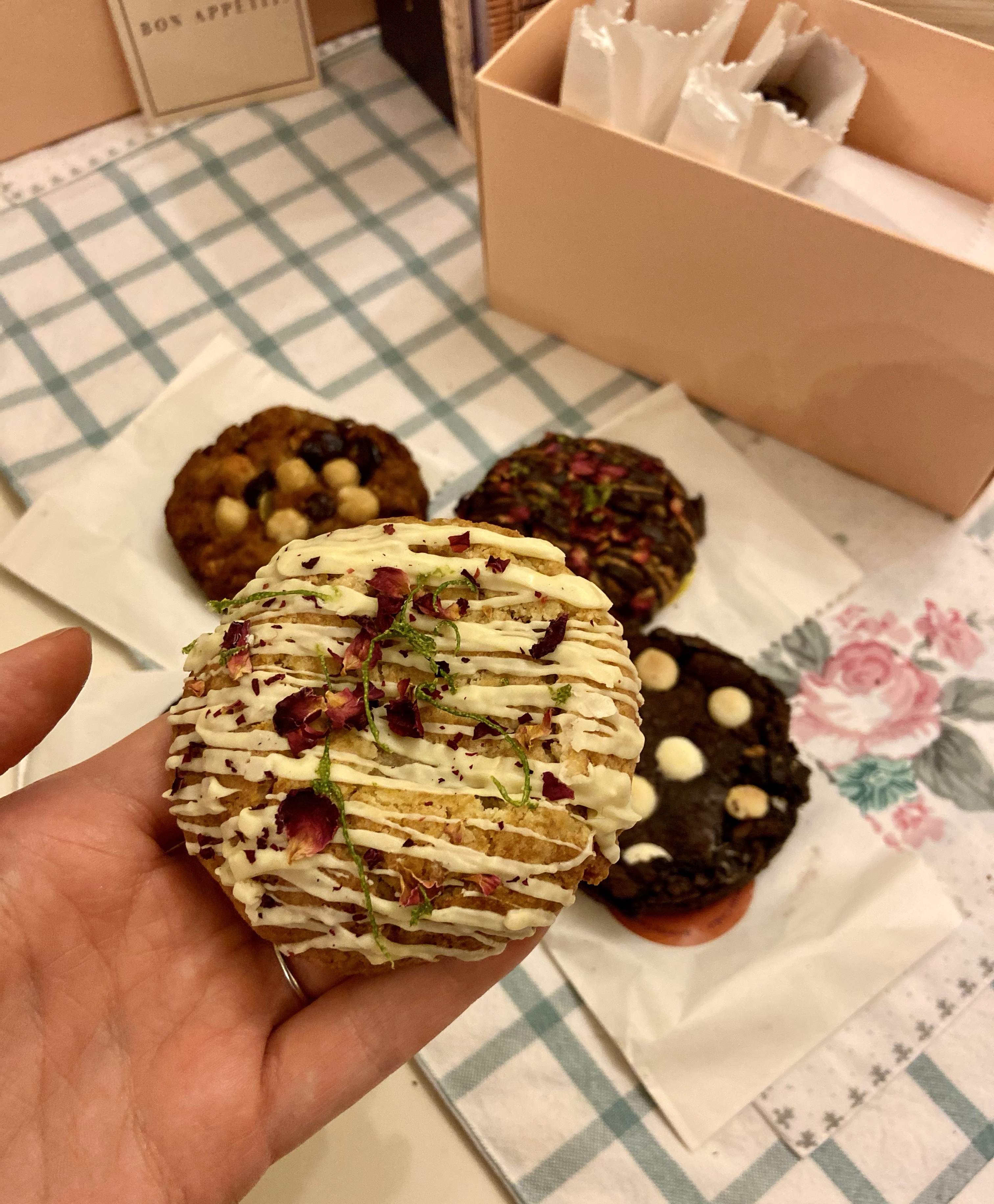 Gül tadına da, kuru gül yapraklarının rayihasına da bayıldığım için ilk denediğim gül yapraklarıyla süslenmesinden ötürü misket limonlu kurabiye oldu. Özellikle göbek kısmı yumuşacık ve misket limonu tadı muazzam, ki zaten bayıldığım bir aromaya sahip bu meyve… Brownie dokusuna sahip olan yer fıstığı ezmeli kurabiye ise oldukça yoğun bir tada sahip, keza beyaz damla çikolatalı brownie kurabiye de öyle. E ben de bu tarz yoğun tatlılara bayıldığım için kutudaki favorilerim brownie tipi olanlar oldu. (Hatta Antep fıstığı ezmeli kakaolu kurabiyenin de brownie tabanlı olanı vardır ya da yapılır umarım!) Chocolate chip cookie denen klasik çikolata parçacıklı, tereyağlı hamurlulardan granola benzeri daha “masum” olanlara, çeşitlerin hepsi gerçekten başarılı. En önemli nokta bence şu, favori tatlarınız olsun ya da olmasın, hepsinde ortak olan şey malzeme kalitesi. İyi tereyağ, iyi kalite fındık fıstık, güzel kakao zaten bu tarz üretimler için şart. İkinci olarak da, tabii iyi bir teknik… Yumuşacık ve nemli kalabilmesi, malzemelerin, aromaların iyi bir dengede kullanılması… Bu kurabiyelerde ise bunların hepsi bir araya gelmiş. Ne güzel değil mi!