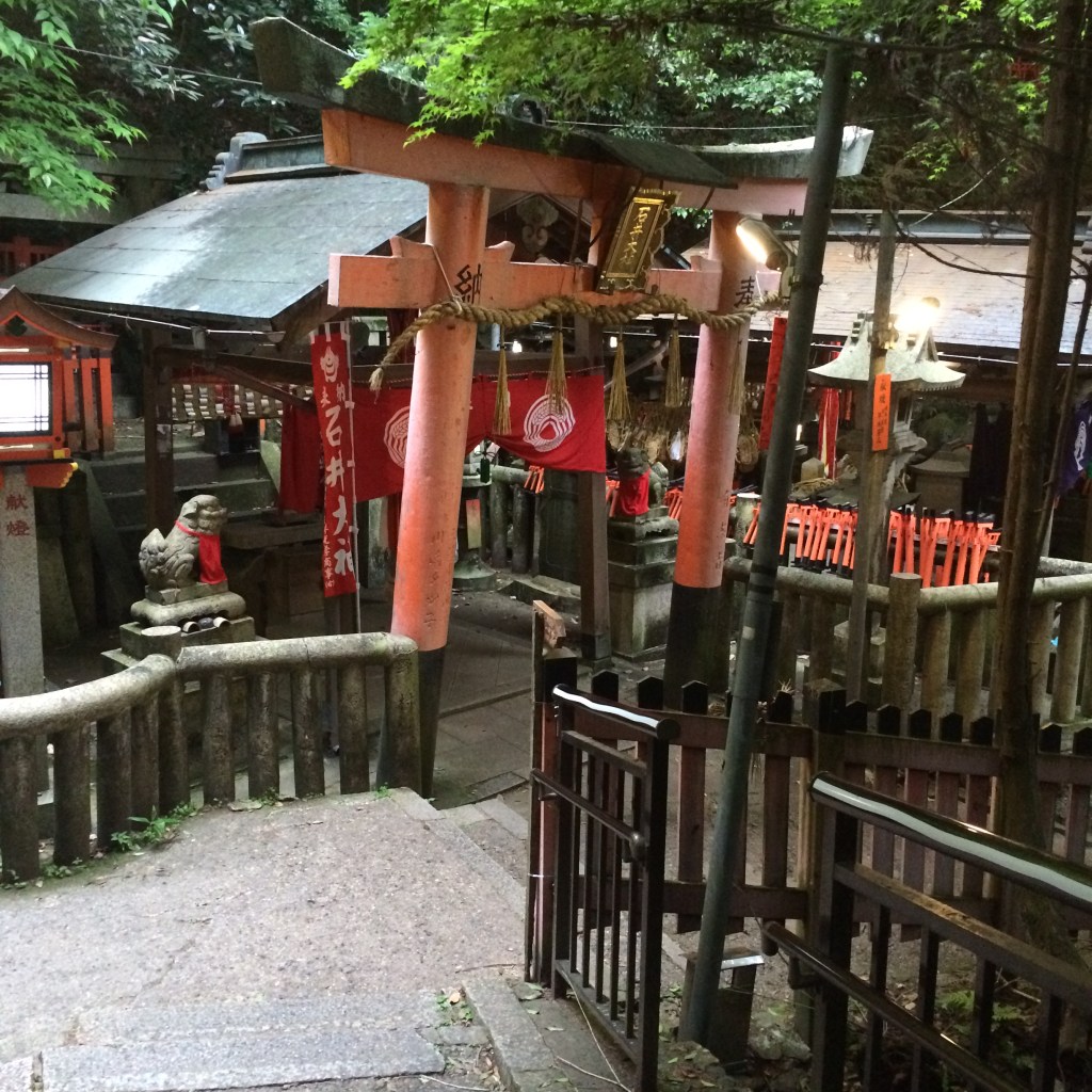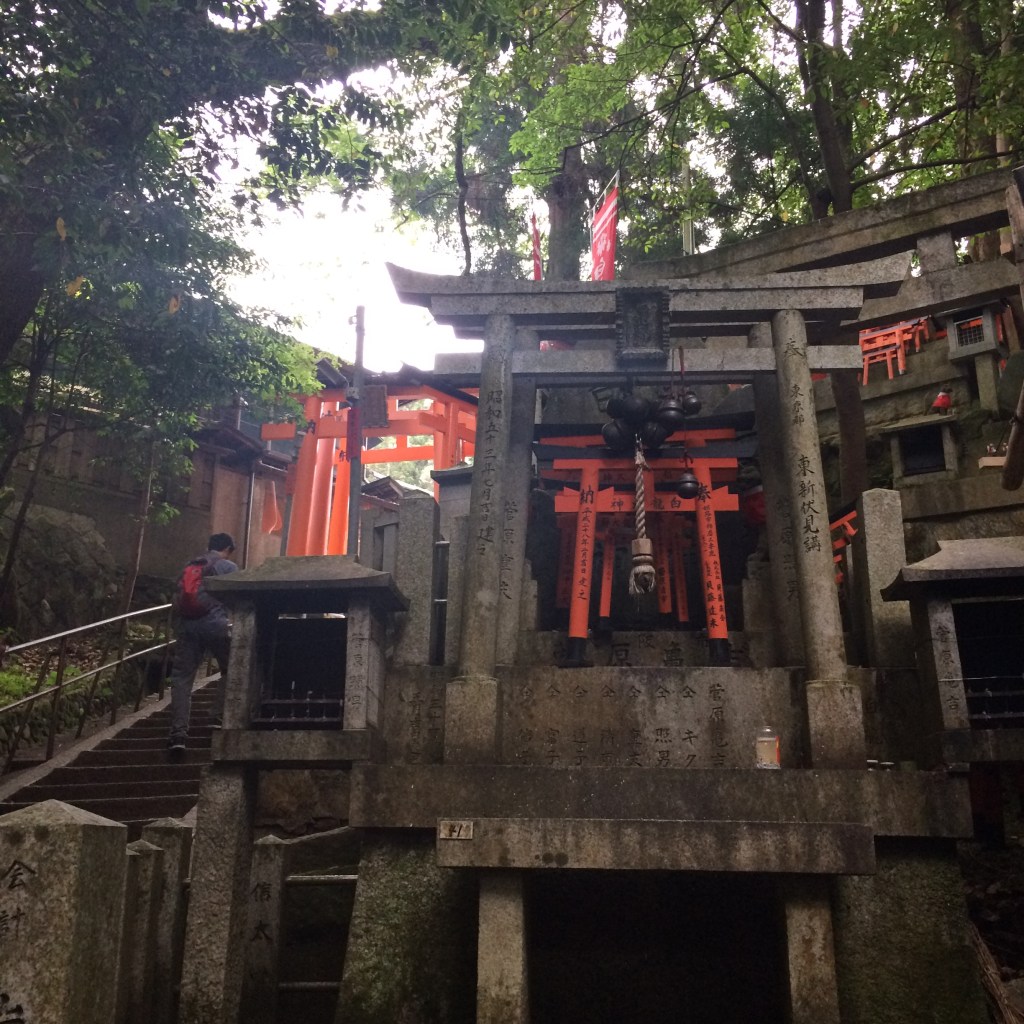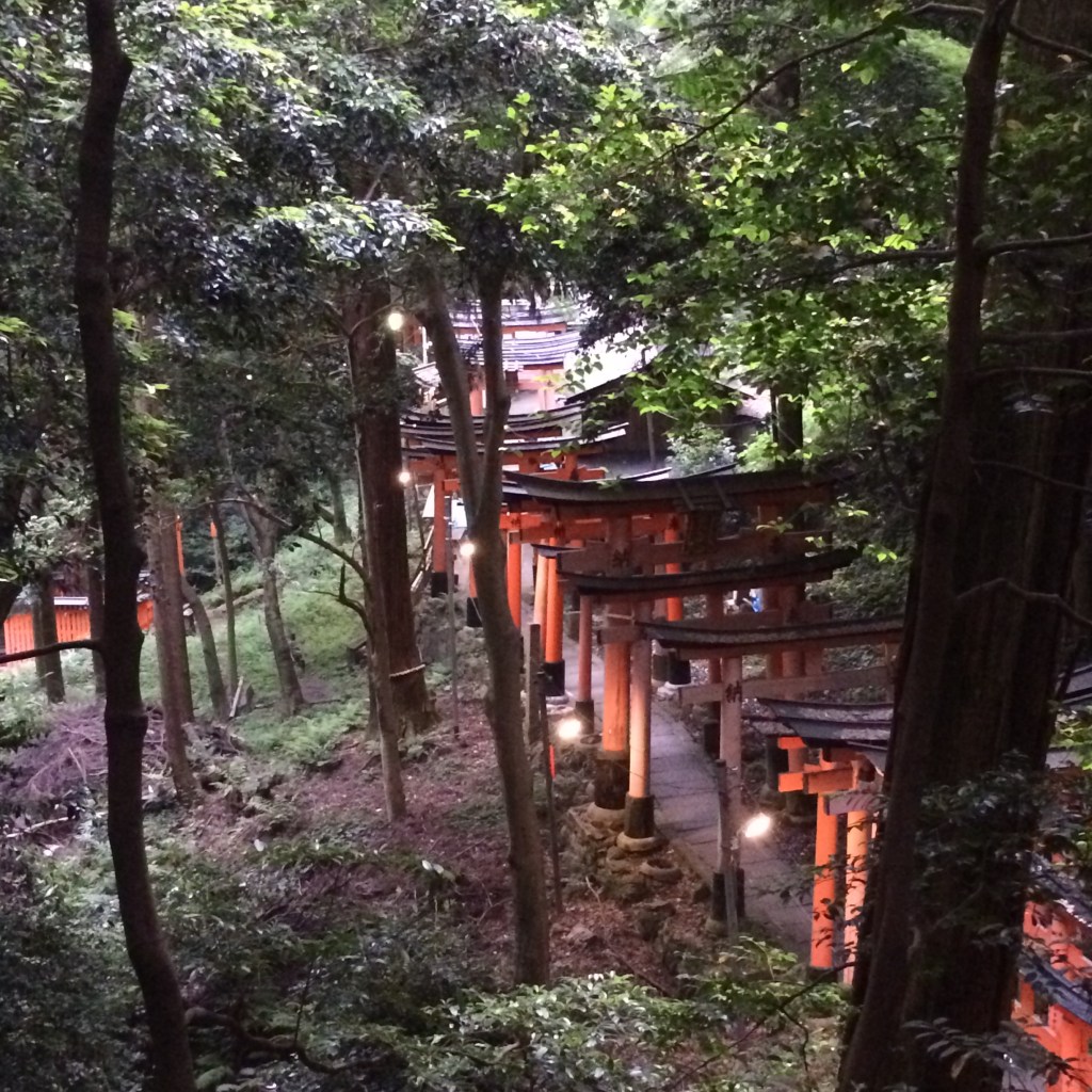 Tapınağa gittiğimiz günün sabahında, neredeyse bütün Kyoto fotoğraflarında yer alan meşhur “altın köşk” Ginko Kuji’nin olduğu göle gitmiş, ancak hem kalabalık, hem de havanın kapalılığından dolayı mıdır nedir, doğrusu pek etkilenmemiştik. Daha sonra bazı bahçelerden geçmiş, neredeyse tüm Japonya seyahatinde olacağı gibi şehirlerin içindeki yeşil alan bolluğuna, korulukların kuytularında karşımıza çıkıveren tarihî kalıntılara hayran olup geze geze akşamüstüne varmıştık. Uzun haziran günlerinin güzel öğleden sonralarının birinde Fushimi Inari tapınağına vardığımızda aslında içimde büyük bir beklenti de yoktu, nereden bilirdim ki o akşam pek güzel geçecekti… Kapıya vardığımızda, tapınağı görmeye gelenlerin çoğunun artık çıkıyor olduğunu fark etmiştik. Bu tapınak Japonlar için de muazzam önemli olduğu için ziyarete gelenler sadece yabancı turistler değildi. Saygısını göstermek adına kimono ve yukatalarını kuşanmış, saçını başını taramış, hazırlanmış şekilde görülen nice Japon ve bizim gibi turistler arasından sıyrılarak ana girişi geçtik ve dağın tepesine tırmanan, 3.5 km civarı uzunlukta, kapılı yolda yürümeye başladık…