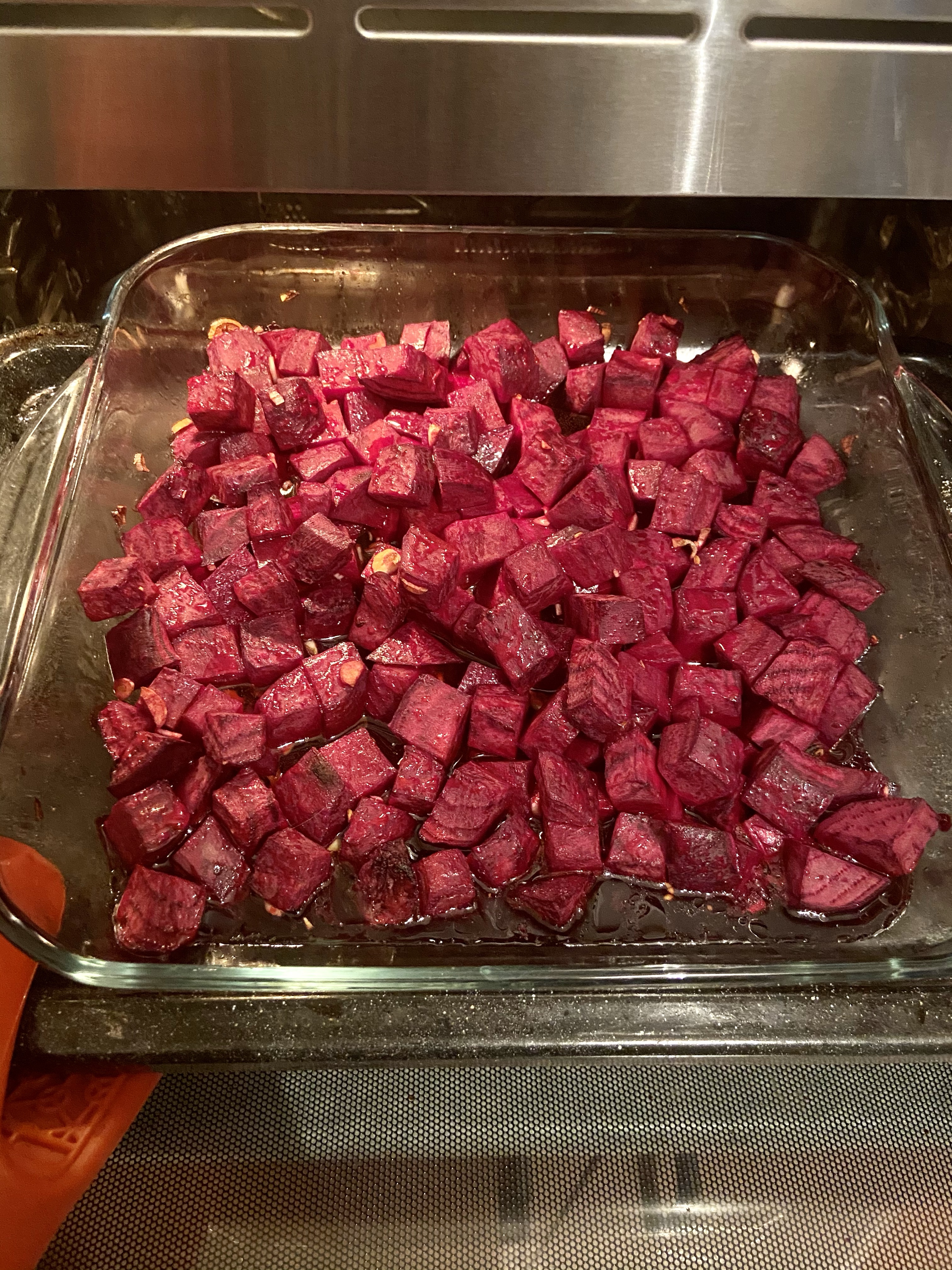 Pancarı neredeyse her şekilde yemeyi seviyorum, ama en çok fırında seviyorum. Pişme süresinin uzun olması dışında hiçbir kusuru yok, bu yüzden her ne yapacaksam önce pancarları fırına atıp sonra ona girişiyorum. En çok fırında taze biberiyeli, incecik dilimler halinde yapmayı severim, ama bugün daha pratik olduğu için iki pancarı iri küpler halinde doğradım, yine ince ince dilimlenmiş 5-6 diş sarımsakla karıştırdım, bolca zeytinyağı ve 4-5 yemek kaşığı balzamikle harmanladım. Tuz, karabiber ve 170 derece, alt rafta 1 saat pişmeye yolluyoruz kendilerini. Pişerken çok kurumamaları için ara ara karıştırıp pancarları ıslatıyorum. Bu sürede hafif kıtır kalıyorlar bu arada, daha yumuşak olmalarını istiyorsanız daha uzun süre pişirebilirsiniz.