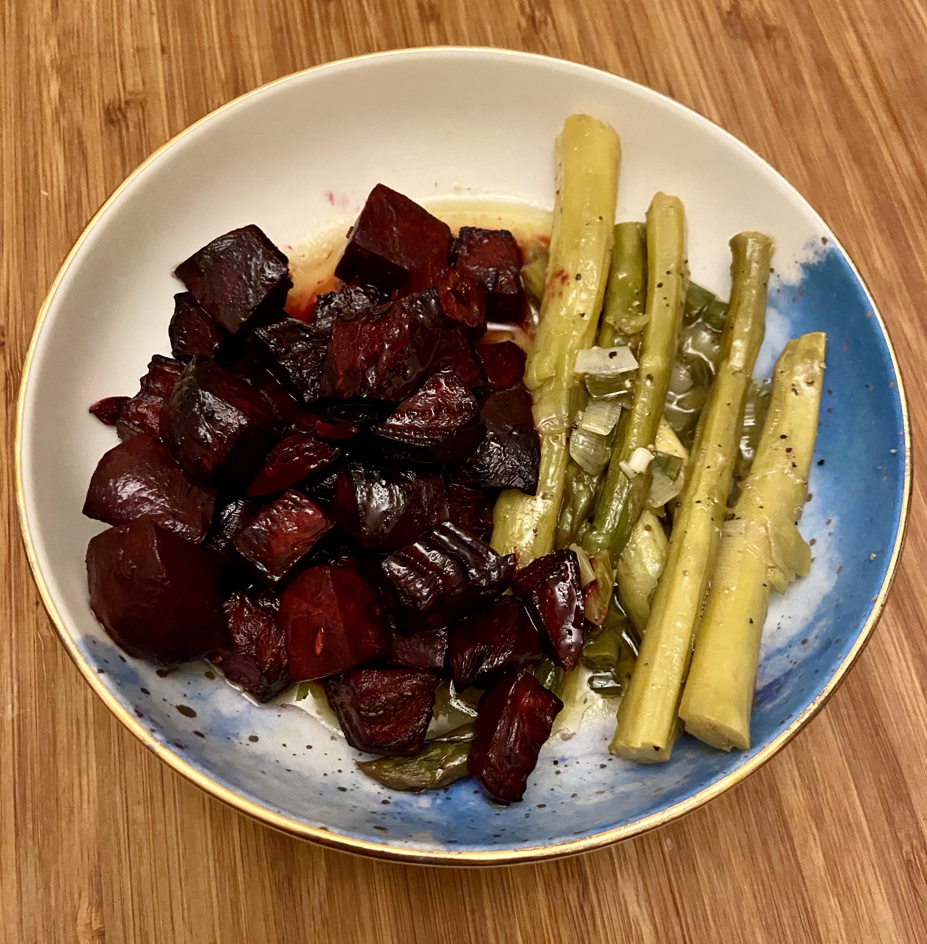 Ben şahsen sabırsızlıktan öldüğüm için önce bir tabak ılık yedim, ardından pancarlar pişip soğuyunca bu kez de güzelim renkli pancarlarımla artık soğuyup tadını iyice çekmiş kuşkonmazlarımı yan yana koyarak bir tur da öyle yedim! İkisinin birbirinin tat uyumuna ayrı, tabakta yarattığı renklere ayrı bayıldım! İsterseniz birlikte, isterseniz ayrı ayrı yiyin, ikisi de çok lezzetli…