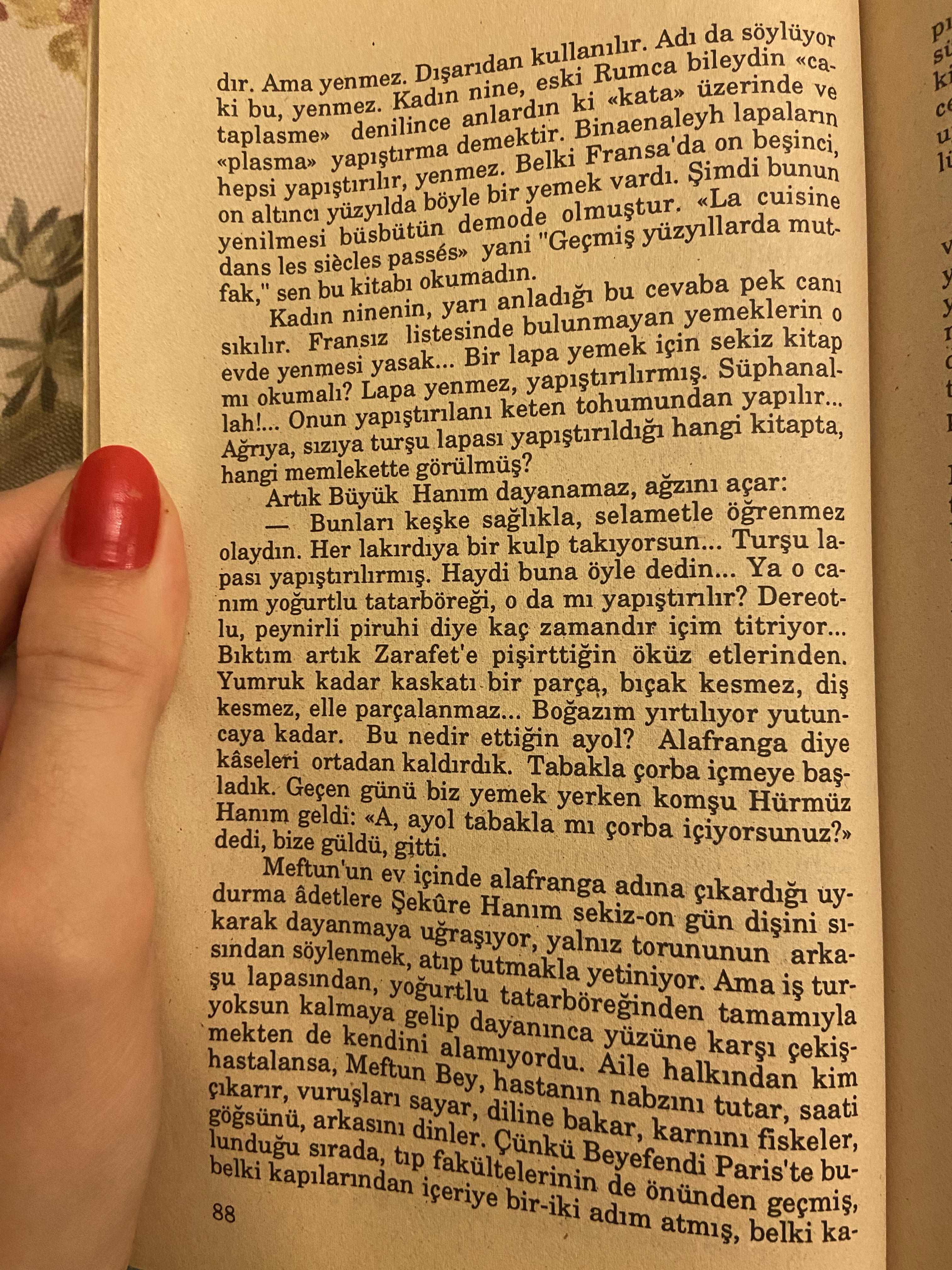 Sonra, bizim bugün manasız bulacağımız, ama o dönemin “ideal”lerini yansıtan tavsiyeler de var tabii o kitaplarda. Bazı yemeklerin “düşük rütbeleri” sebebiyle davet sofrasına çıkarılamayacağı söyleniyor, mesela makarna, kiraz misafire çıkarılamazmış efendim. Keza “Çorba öğle yemeğinde olmamalı, sadece akşam yemeğinde olmalı. Öğlen ordövr alınmalı. Servis yaşlılardan değil, kadınlardan başlamalı” deniyor ve çok yağlı, salçalı, baharatlı yemeklerin kesinlikle sağlıksız olduğuna inanılıyor; “Mide inkılabı yapılmalıdır!” deniyor. Bir günde 4 öğün sayılıyor. Sabah yedi, öğlen on iki, akşam beşte çay öğünü, akşam onda ise akşam yemeği. Şimdi “Akşam yedide yemeğinizi bitirmiş olun” diyor ekseri diyetisyenler, bugünkü tavsiyelerden ne kadar farklı değil mi? Sonra, peçete büyük problem! Dize mi konulacak, tabağın altına mı, peçete ağzı silmek için kullanılabilir mi, yoksa zinhar kullanılmamalı mı? Dirsekler ille vücuda yapışık mı olacak, hafifçe masaya dayayabilir miyiz? Yemeğin sonunda el yıkamak için masaya gelen suyu amman içmeyelim, rezil olduğumuz an da o andır!