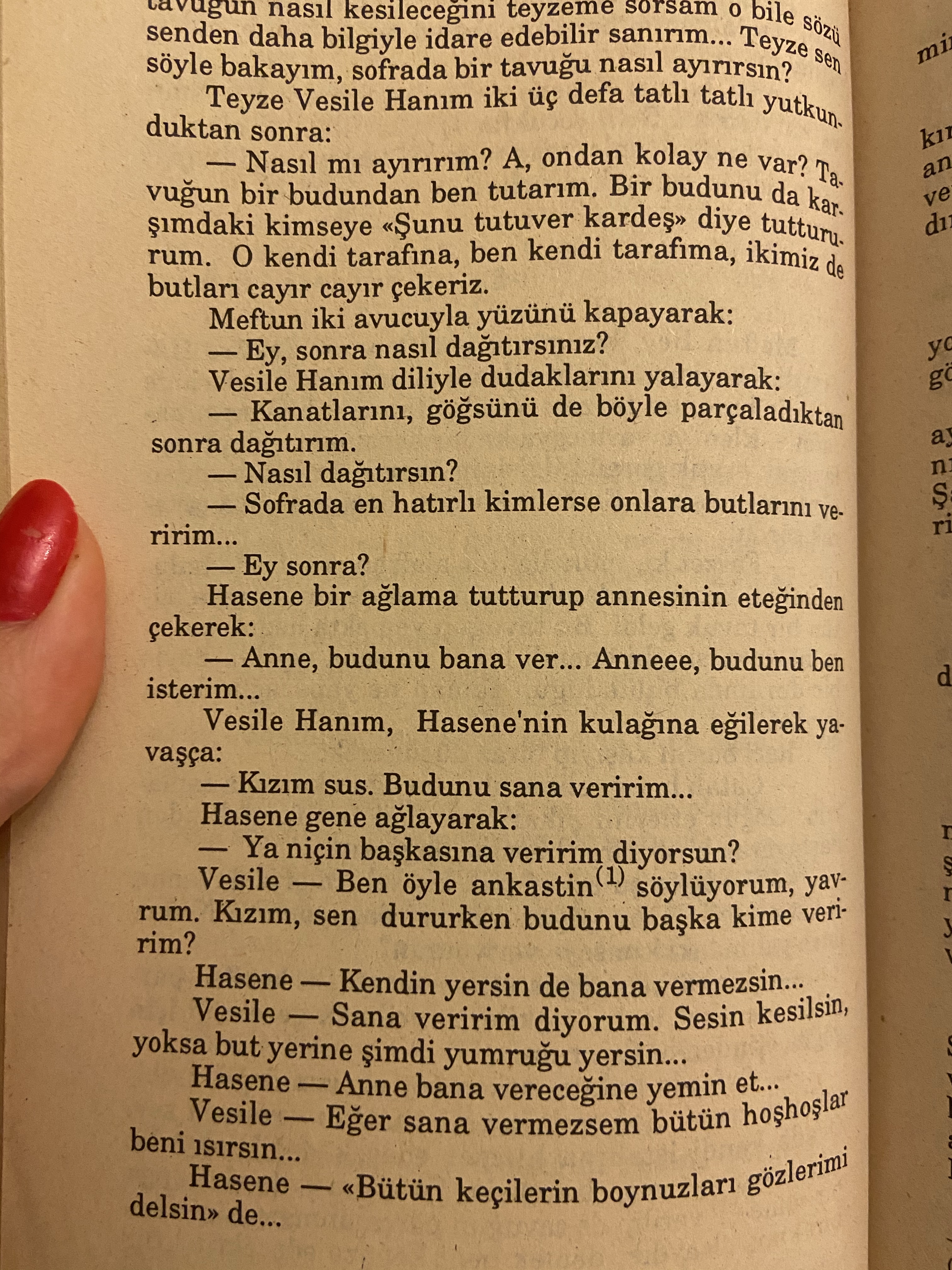 Bir büyük açmaz daha, sofrada yemek esnasında ne konuşulacak? Mesela sofrada yemeğin nefasetinden bahsedebilir miyiz? “Hayır, yemekte yemek konuşmak hoş değil!” deniyor kitaplarda. Sofrada siyaset, din gibi tartışmalı konular açmak hepten yasak! E biz ne konuşacağız? “Güzel şeylerden konuşun” diyorlar. Ama hangi güzel şeyler? Sanat, edebiyat, havadan sudan muhabbetlere izin var, peki ya güzelliğin kendisi? “Avrupa’da kadınlara güzelliğinden, nefasetinden bahsedilir, ama bizde hoş karşılanmaz ha, yapmayın” diyorlar yazarlar. Hatta bu kitapların yazarlarından biri olan Dalkılıç, “Sofradaki kadınların nezaketen de olsa elini öpmeyin” diyor, “bize uymaz” diyor, “zaten kaidelerini bilmiyorsunuz, sırıtıyor sizde, beceremiyorsunuz, iyisi mi yapmayın siz” diyor!
