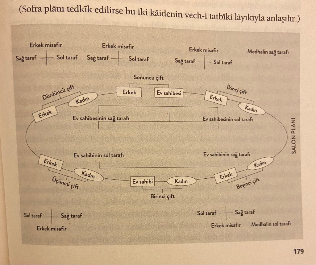 Bu kitaplarda sofra adabı dışında her türlü adab-ı muaşeret hususu var aslında. Mesela “Çaya five o’clock kıyafetiyle gidilir, ama normal kıyafetle de gidilebilir. Mütevazı aileler bile kabul günü yapmalıdır.” gibi tavsiyeler var. Sonradan “altın günü”ne dönüşen kabul günlerinin özü, Avrupa’daki, Rusya’daki “kabul günü” adeti. Hani klasik romanlardan bildiğimiz, üst sınıf aileler belli günleri kabul günleri olarak ilan ederler, kartlarında kabul gün ve saatleri yazar; işte o belirtilen gün ve saatlerde köşklerinin kapıları gelen gidene açıktır. Bir nevi genel randevu, “Beni görmek istiyoran şu gün şu saatte gel, müsait olacağım” demek gibi… Böylece tek tek herkesi davet etme işine gerek kalmaz. (Tabii bu orjinalinde kadınlı erkekli bir şey, ama bizde kaçgöç yüzünden olsa gerek, kadınlardan ibaret bir sosyal eğlenceye dönüşmüş.) Bu dönem yayımlanan adab-ı muaşeret kitapları genellikle Batılı örnekleri bire bir çevirip sayfalarına taşıdıkları için bu kitaplarda bir sofra düzeni meselesi var ki, evlere şenlik! Kurallarda “Eşler yan yana oturmasın, o gece bari farklı insanlarla konuşsunlar, ama bir yıla kadar yeni evliler ve nişanlılar yan yana oturabilirler” deniyor mesela. Yahut “Masada herkesin oturacağı yerler kartlarla belirtilmeli, ama bu yeterli değil, ev sahibi oturma düzeninin planını kapıya asmalı ki, hangi bey yanında hangi hanımın oturduğunu bilsin ve ona kol vererek onunla odaya girsin” deniyor. Okuyan da sanır ki, o devide herkes dev konaklarda yaşıyor ve asgari elli kişilik yemek davetleri veriyor da, kapıya oturma planı asacak! Kim odaya kimle girecek, kim kime kolunu verecek, bu nasıl düzenlenecek, aman aman çok önemli!