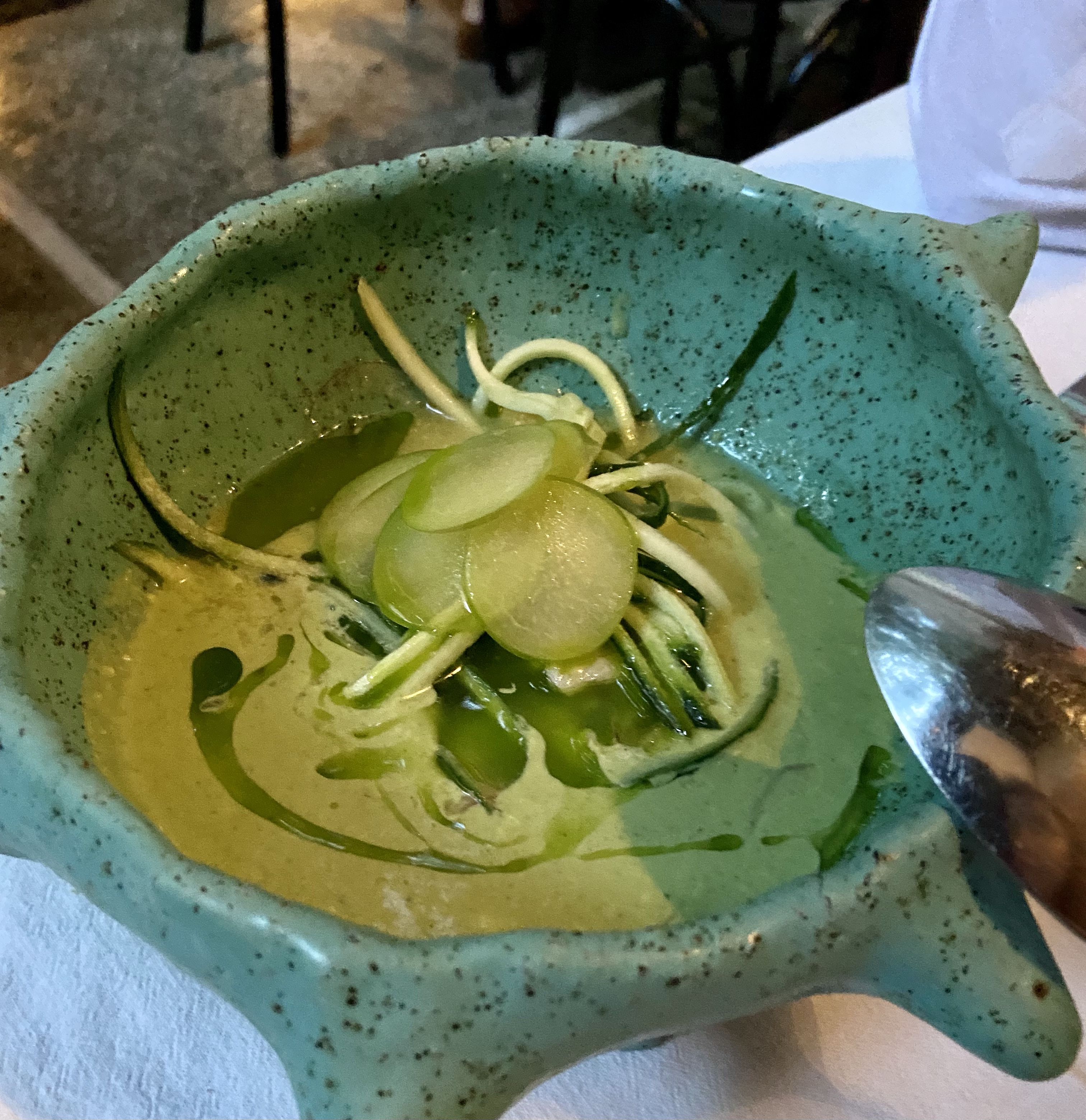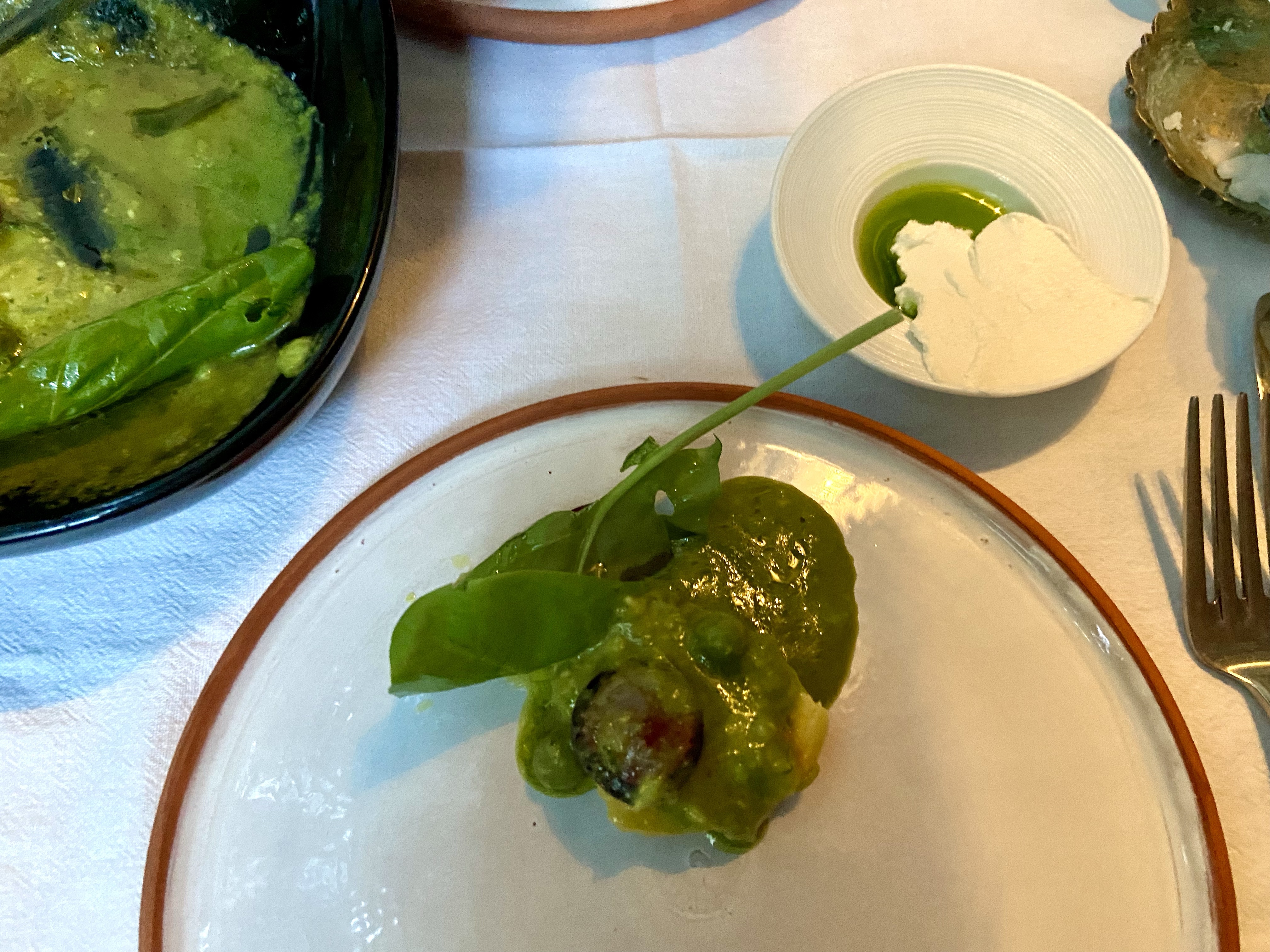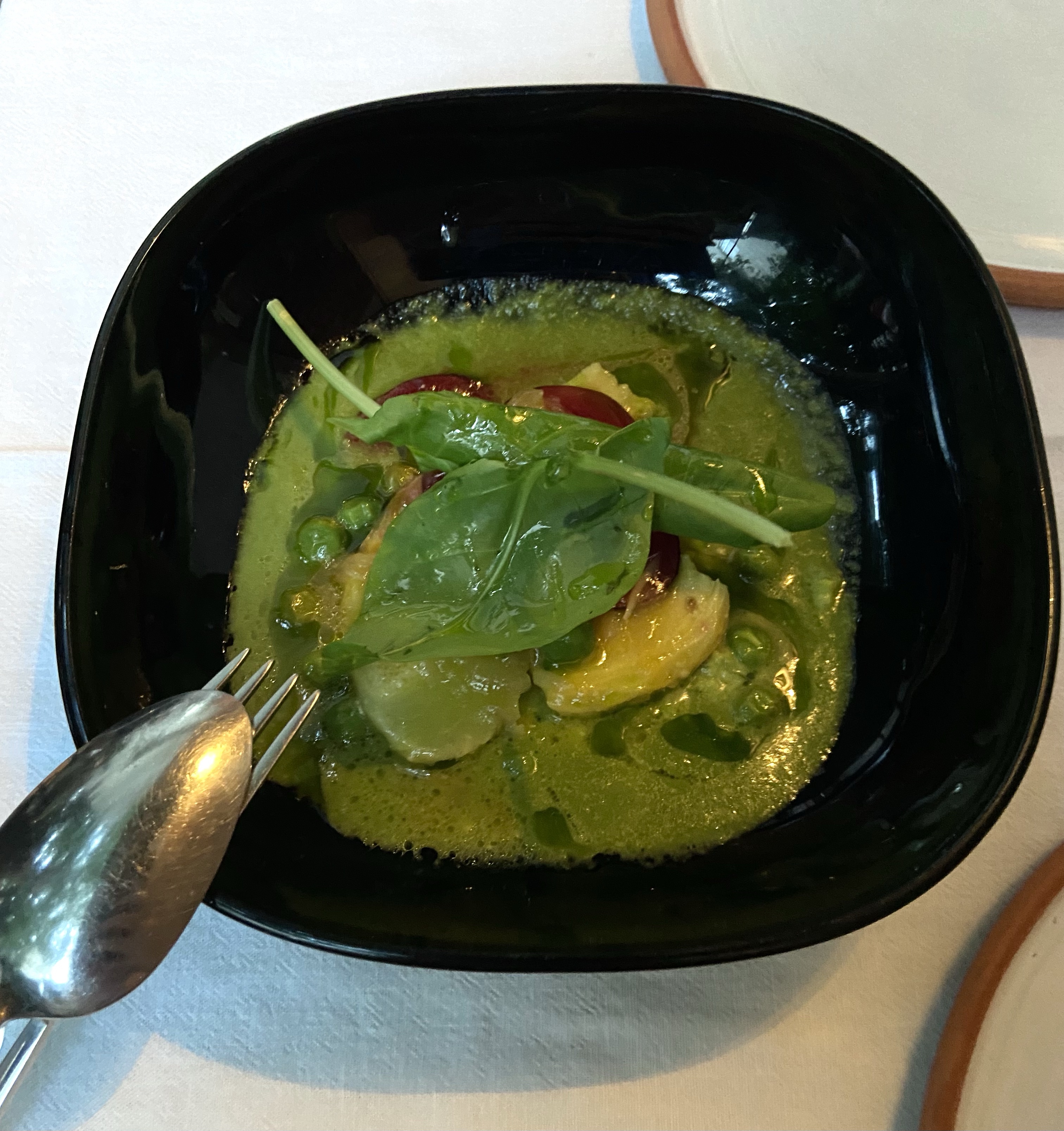 Başlangıç olarak kuzukulağı soslu enginar ve bezelye püresi ile levrek ceviche sipariş ettik. Kuzukulağının ekşiliğine bayılan, bezelye ve enginar çok seven biri olarak zaten ilk tabak benim için bankoydu. Kıvam ve lezzet açısından soğuk çorba olarak bile servis edilebilir, çok lezzetliydi. Ancak aynı övgüleri ceviche için düzmem zor, zira sosu lezzetli olmakla birlikte balıklar dirilikten çok uzaktaydılar. Ya balıklar blanşe edilmiş ya da lime suyunda gereksiz uzun bekletilmiş. Eğer “Türkiye’de insanlar olması gerektiği gibi diri ceviche yemiyorlar” diye düşünülerek bu şekilde yemekten taviz verildiyse çok üzücü. Haşlanmış levrek üstüne sos dökülmüş gibi bir dokudaydı yemek, haliyle tatmin etmedi. Kendi yaptığım ceviche doğrusu daha lezzetli…