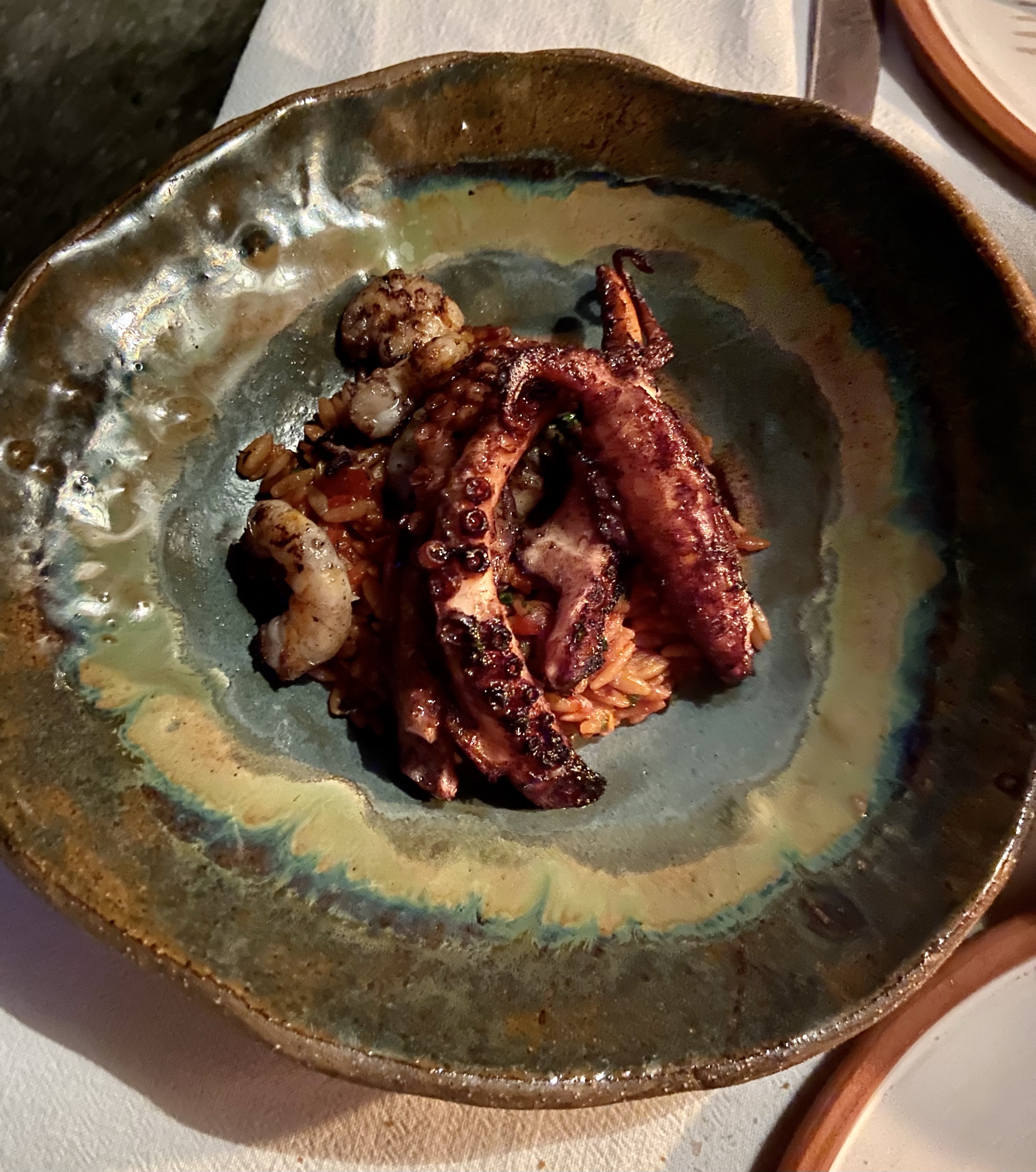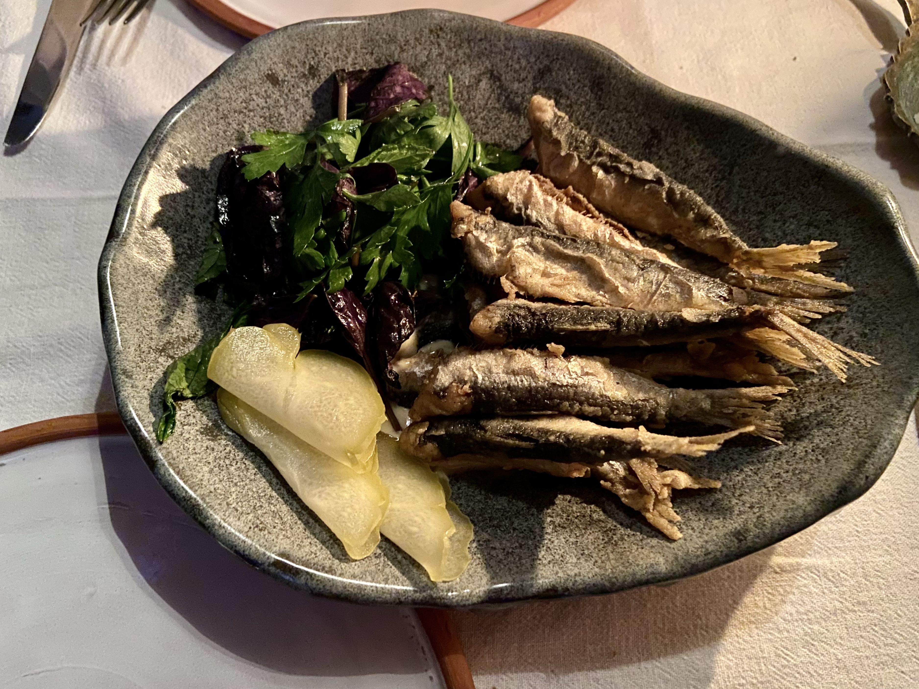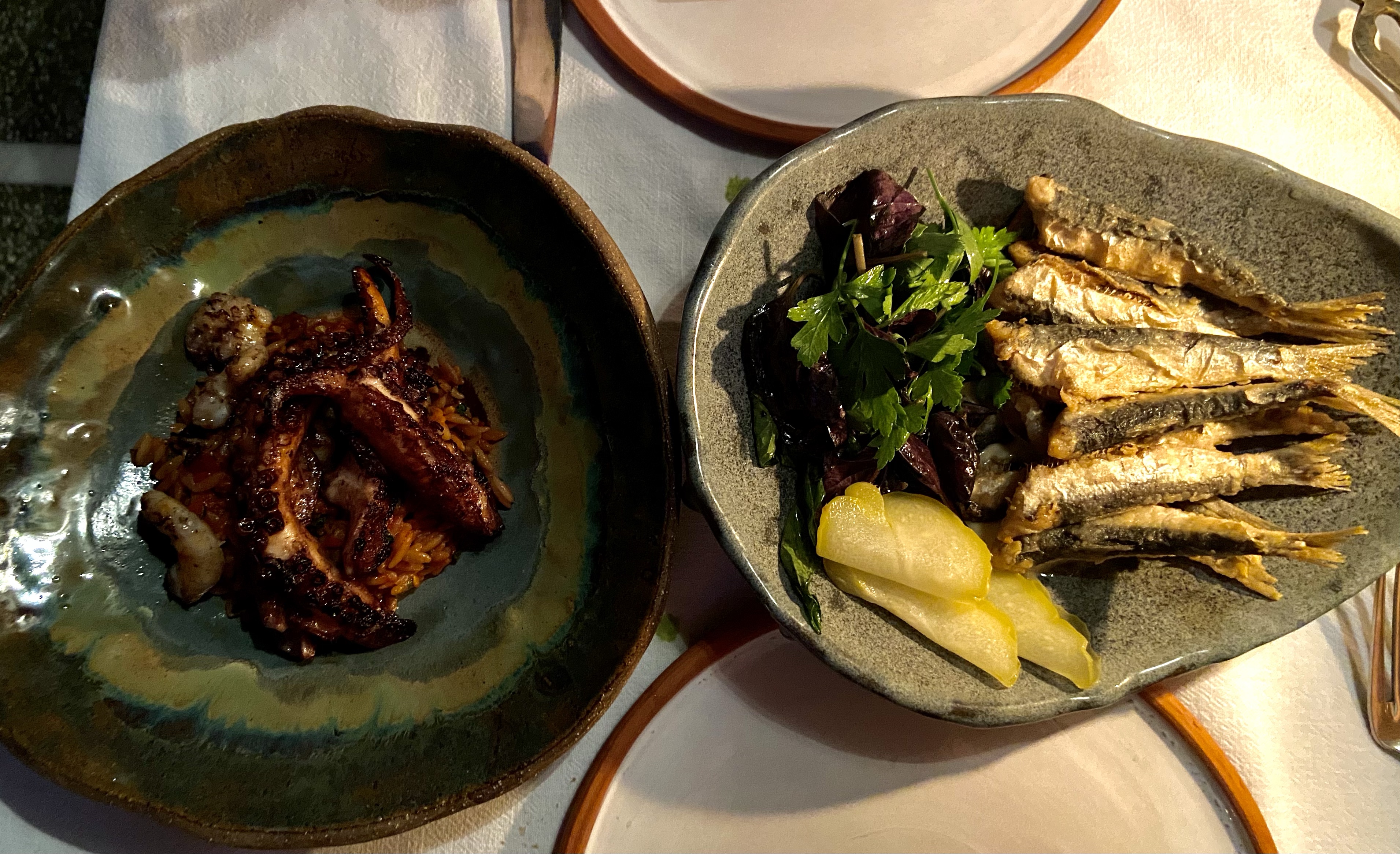 Gelelim ana yemeklere… Arpa şehriye üstünde ahtapot ve aioli sosu üstünde sardalya sipariş ettik. Diyebilirsiniz ki “Henüz sardalyalar yağlanmadı!”, haklısınız, zamanı normalde bu aylar değil. Fakat bu sene (belki deniz suyundaki sıcaklık değişimlerinden dolayı) sardalyalar erkenden yağlanmış ve Sur Balık’ta inanılmaz iri sardalyalara rastlanmış olduğundan burada da şansımızı sardalyalardan yana kullandık. Eh, öyle gelmediler. Ama bu bizim şansa bıraktığımız bir konu olduğu için sorun etmedik çok. Aioli sosun yoğunluğu ve tadı ise mükemmeldi, sardalyaya da acayip yakışmıştı, hem balığı da yağladığı için sardalyaların henüz çok yağlanmamış olmasını telafi etti. Balıkların yanında gelen ağaç bamyası (bildiğiniz bamyayla alakası yok) turşusu tam bir sürprizdi, bayıldım! Taze otlarla hazırlanan salata da nefisti. Ahtapotun kendisinde çok bir numara göremesek de, onun altındaki karidesli domatesli arpa şehriye pilavı nefisti.