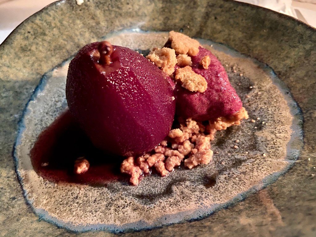 Ve tatlı… Tatlı menüsüne bakmadan önce “Kesin tatlılardan biri pavlova” deyip güldüm arkadaşıma ve tabii ki öyleydi. Bilmiyorum tüm iyi yemek restoranlarında pavlova görme modamız ne zaman bitecek? Ayrı bir tatlı ustası gerektirmiyor, malzemeleri basit, hafif, evde tutturması da zor olduğundan dışarda yenmesi tercih edilebilir, bu faktörlerin hepsinin farkındayım da cidden 5 yıldır her yerde pavlova görmekten çok sıkıldığımı söyleyerek içimi şuracığa dökmüş olayım. Neyse, biz yanında üzüm sorbeyle gelen şarapta pişmiş armut tercih ettik. Şarapta armuta şahsen bayılırım, bence basit ama kişilikli bir tatlı. Bu versiyonda baharatı biraz daha fazla olsa daha da iyi olurdu ama diriliği, tadı iyiydi yine de. Yanında gelen üzüm sorbe ise harikaydı ve armutla uyumu da çok güzeldi. Tatlının yemeklerden başarılı olduğunu söyleyebilirim rahatça…
