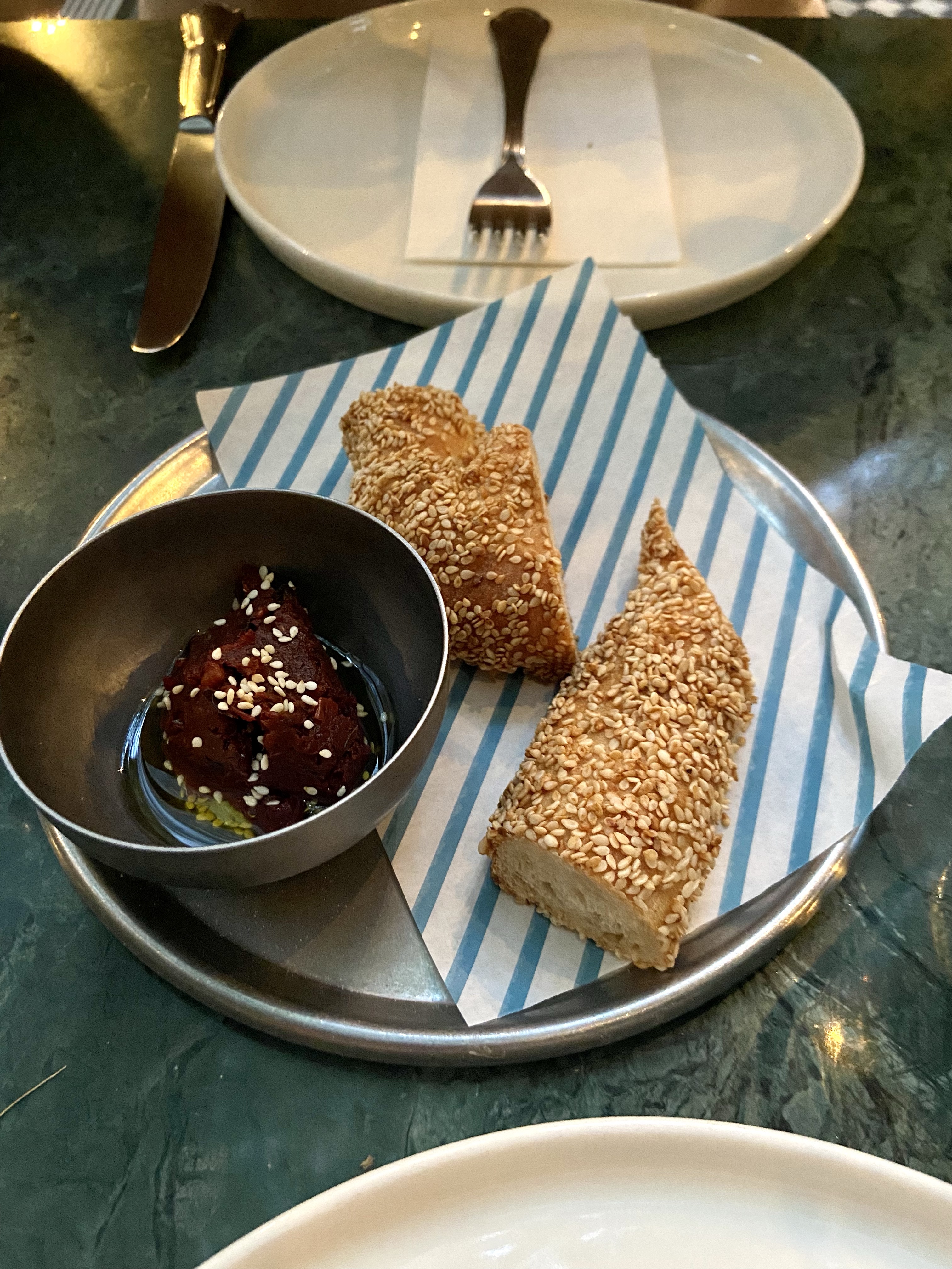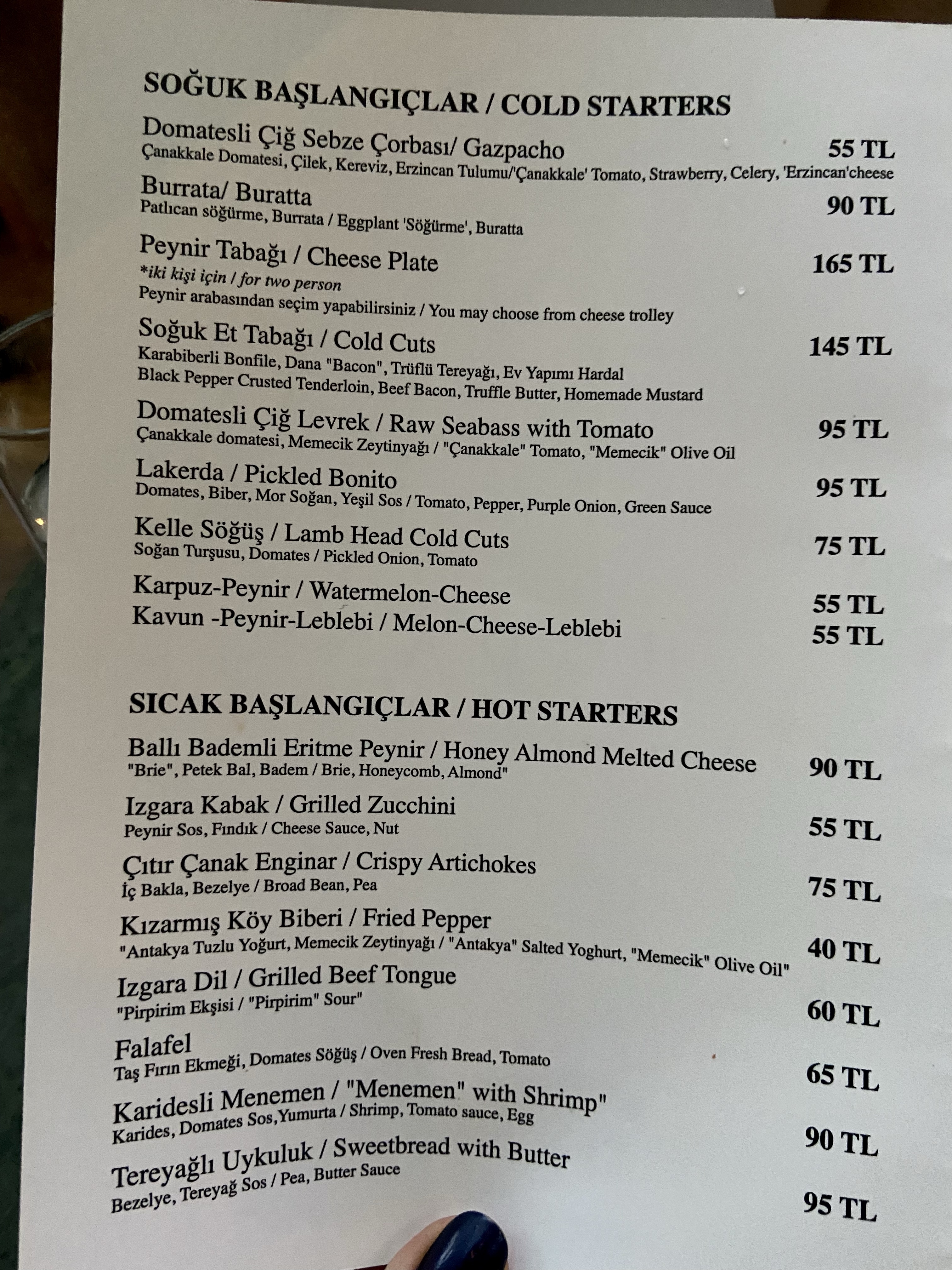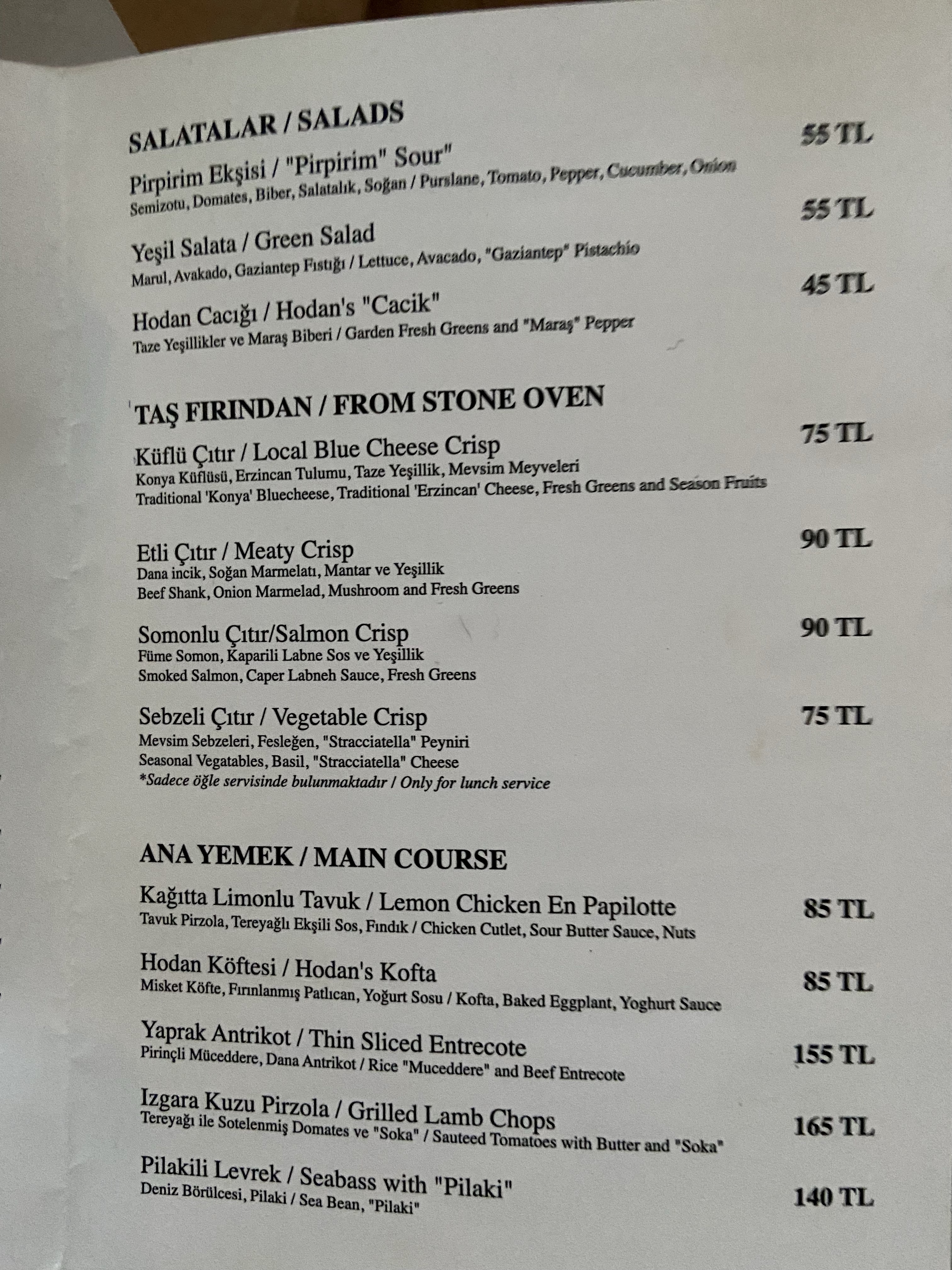 Bir süredir hem çok gözüme çarptığı hem de zevkine güvenebileceğim kişilerce beğenildiğini gördüğüm için epey hevesle gittim Hodan’a. Güleryüzlü karşılama, masamıza bakan garson İbrahim Bey’den güzel yönlendirmelerle başladık. Menüde paylaşımlık olarak değerlendirilmeye uygun epey kalem var, biz de doğrusu onlara yöneldik; benim ya da Alp’in pirzola veya köfte yeme modunda olduğumuz bir akşam değildi! Benim için domatesli çiğ levrek çok çekiciydi, direkt onu istedim. Sevgili Güzin Yalın “Çıtır enginarı kesin dene!” dediği için onu da hemen aldık. Taş fırından da etli çıtır istedik.
