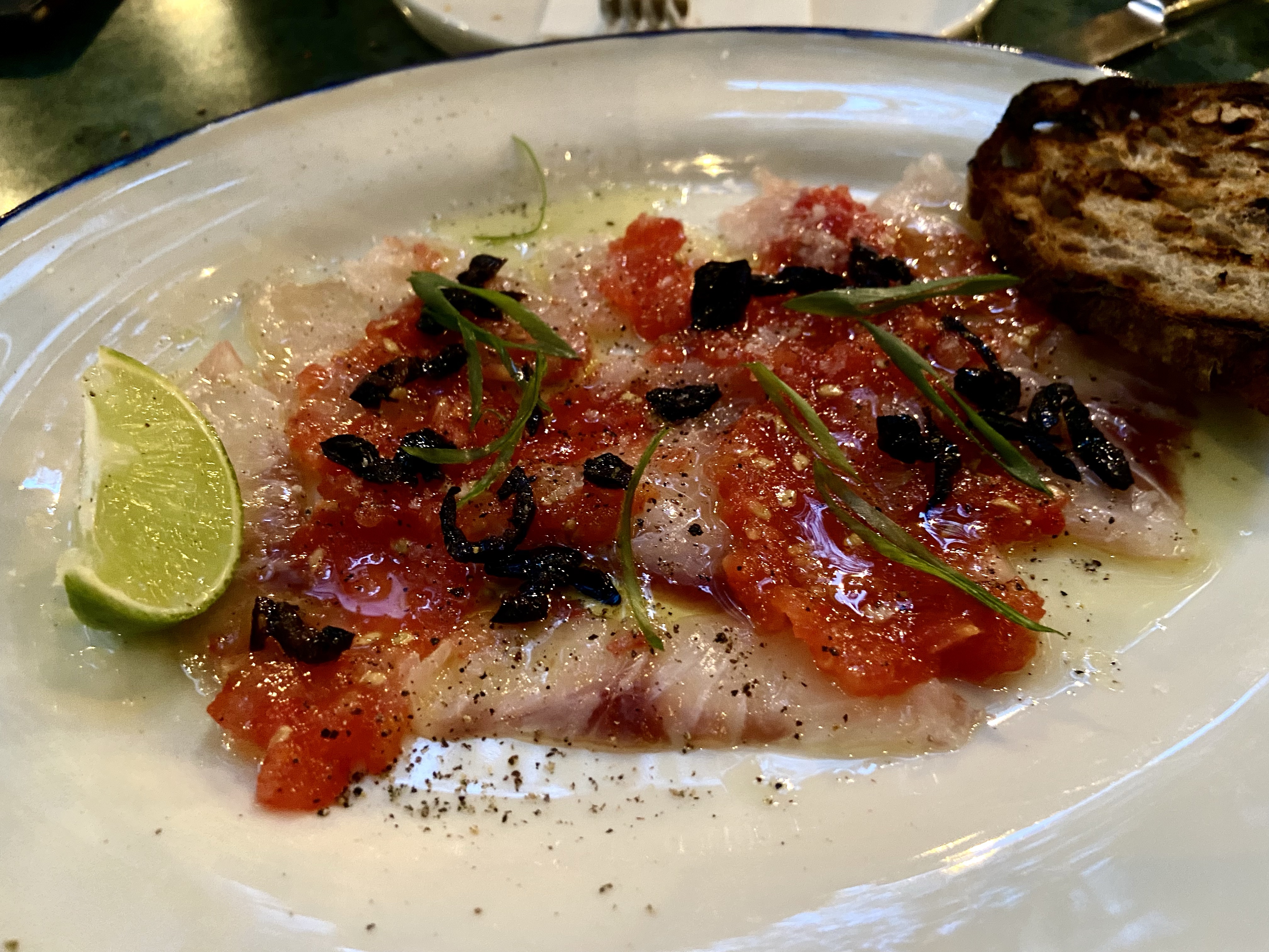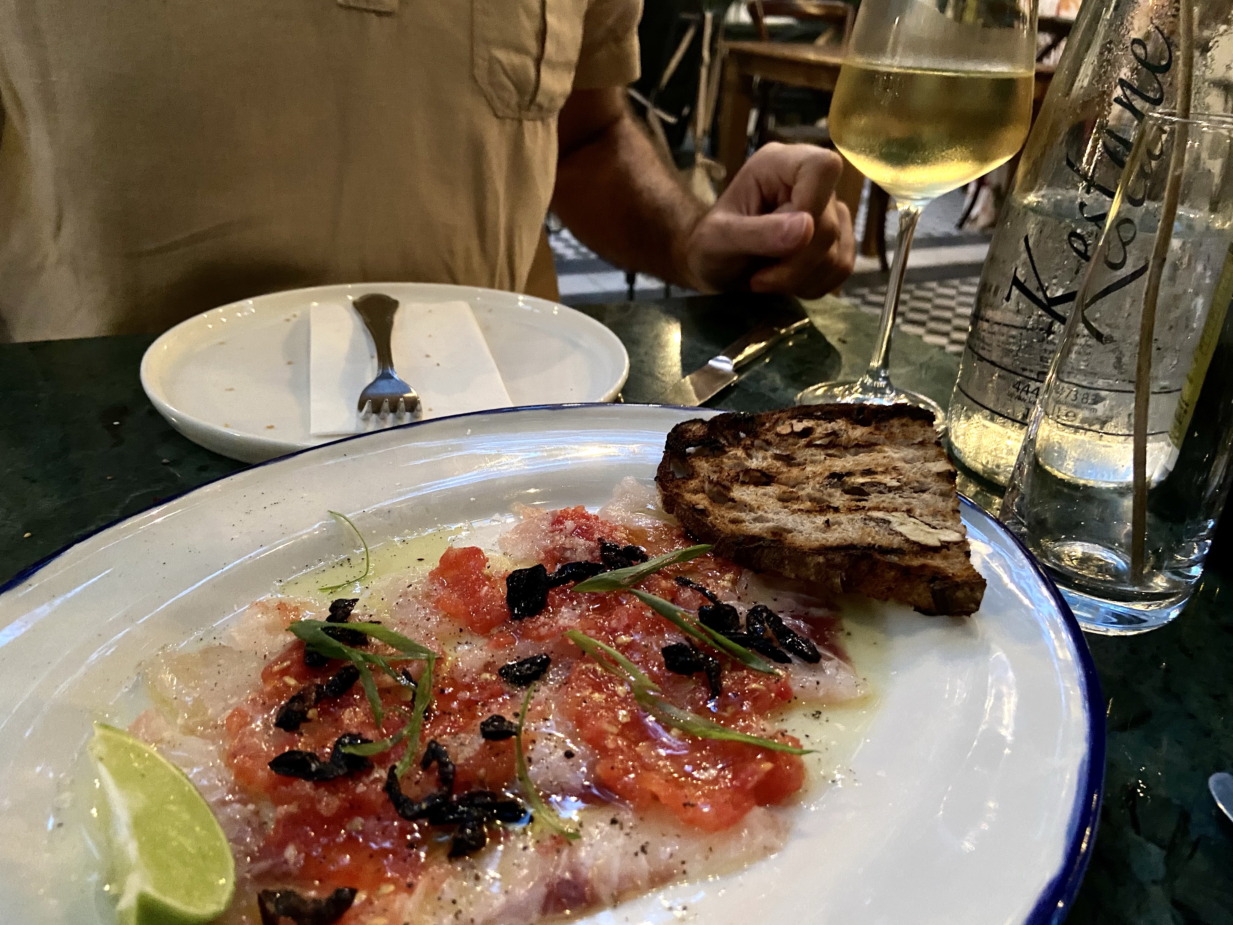 Domatesli çiğ levrek tek kelimeyle mükemmeldi. Araka‘da cevichedeki balık dokusunun fazla yumuşamış ve kesinlikle çiğ balık diriliğinde olmadığından yakınmıştım, burada durum tam tersi; harika dirilikte, domates püresi, zeytinyağı, zeytin ve ıtırlı otlarla marine edilmiş, çok lezzetli bir levrek yedim. Sadece bunu yiyip yanında bir kadeh beyaz şarap içmek için bile buraya uğrarım, öyle sevdim! Yanına Chamlija’nın siyah üzümden yaptığı beyaz şarabı Papaskarası Blanc de Noirs da harika yakıştı.