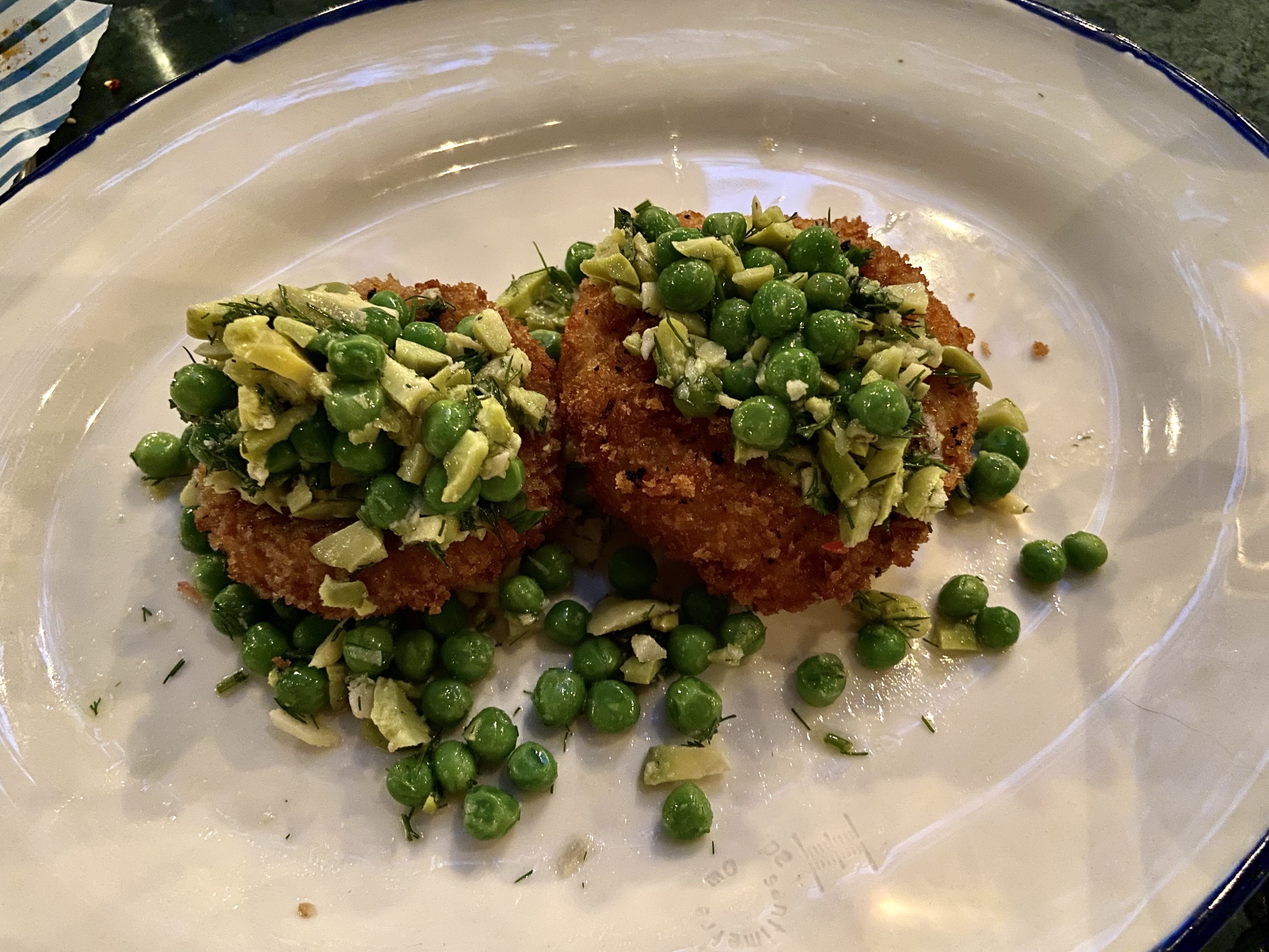 İkinci kısım, çıtır enginar. Bu, menüdeki “yenilikçi” sayılabilecek tabaklardan biri. Enginarlar, klasik şekilde pişirildikten sonra çıtır kaplamayla kızartılmış, üstünde oldukça diri bakla ve bezelyelerle servis ediliyorlar. Isırdığınızda yine limonlu, zeytinyağlı alıştığınız enginar tadı geliyor ağzınıza fakat kaplaması ona ayrı bir lezzet katıyor, üstelik tabii soğuk değil sıcak sıcak yiyorsunuz. Kızartmalarla ve bu tarz kaplamalarla çok aram olmamasına rağmen beğendim. Tek eksi notum, bezelyelerin diriden çiğe yakınlıklarıydı, o çiğ nişasta tadı hafiften geliyordu. Yoksa diri olmalarına hiç itirazım olmazdı, ama bezelyenin aroması çok mutluluk verici değildi.