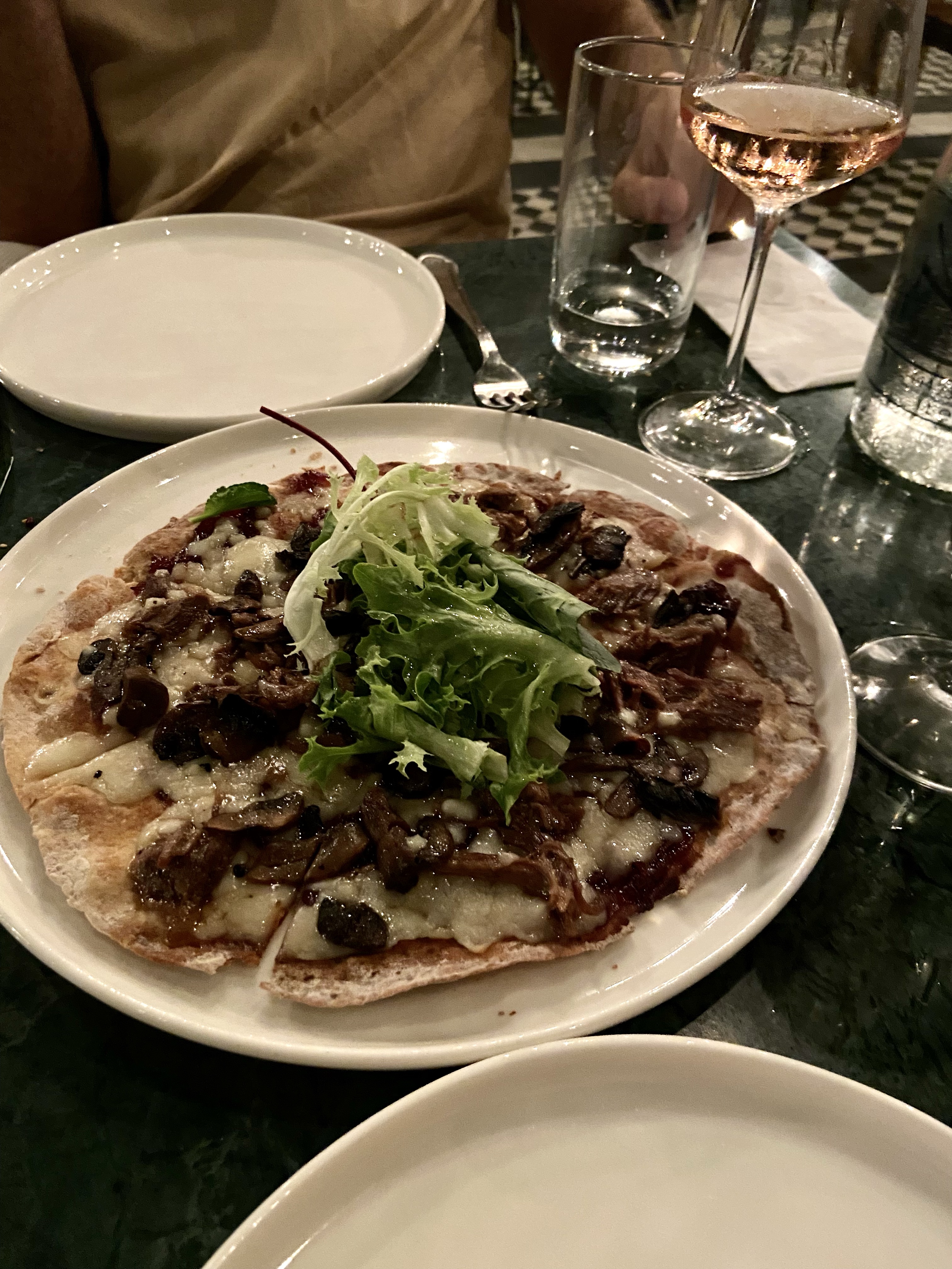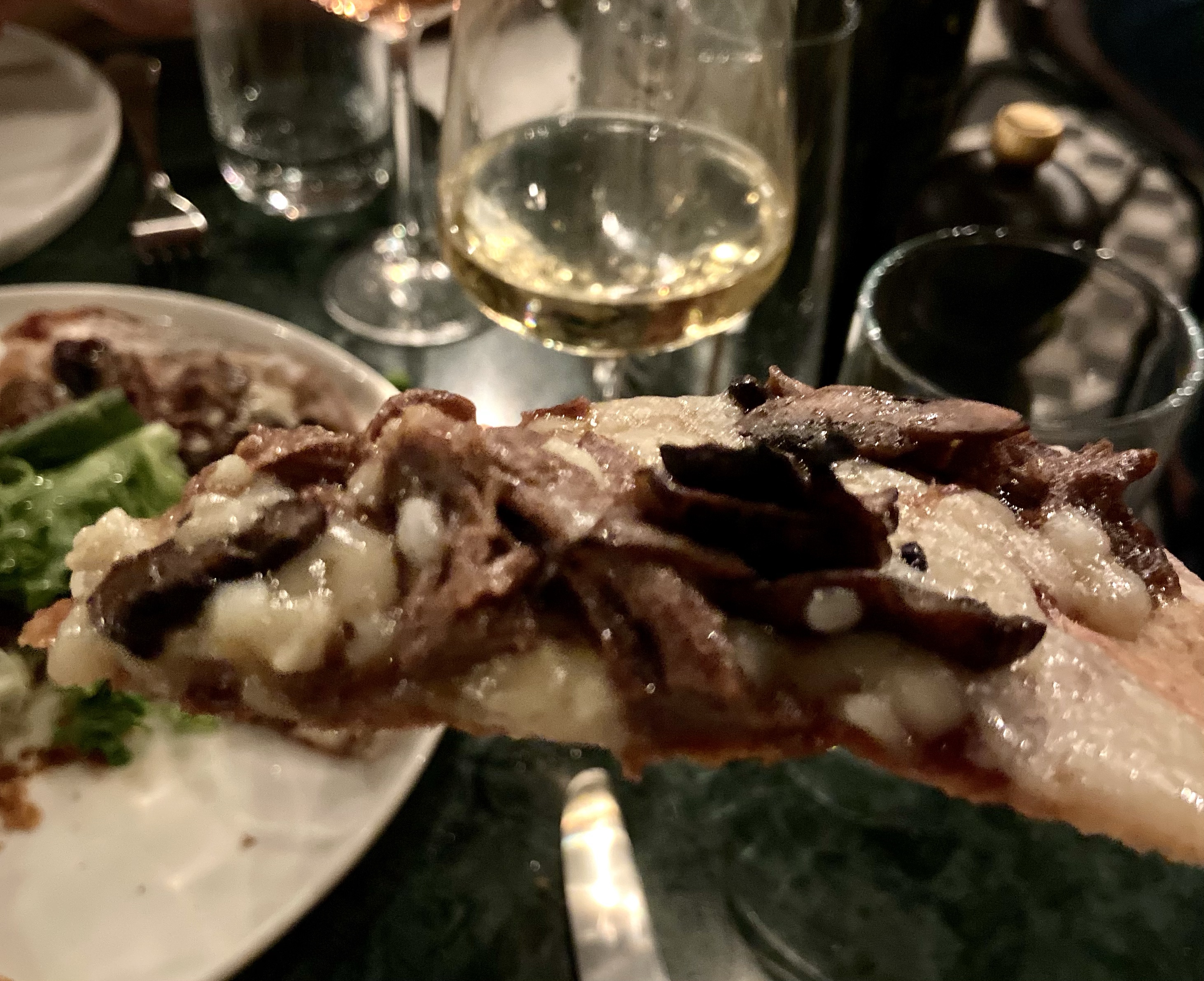 Gelelim etli kıtıra… Öncelikle üstündeki dana incik ve soğan marmelatı zaten bence banko lezzet ikililerinden, çok severim. Soğanlar soğan marmelatından ziyade karamelize soğana yakındılar, menüde yazıldığı gibi biraz daha marmelat tadında olmalarını tercih ederdim, ama çok sorun değil, zira tadı güzel. Mantarları çok lezzetli değildi ama onun da çok eksiğini hissetmedim. Tek şaşırdığım, bu kadar özel lezzetlere dikkat edilen bir yerde, bu yemeğin üstünde yeşillik olarak, bildiğimiz “akdeniz yeşillik” diye satılan ve salatalara dolgu olsun diye kullanılan lezzetsiz karışık otlardan bir kupleyle gelmesiydi. Daha özellikli bir yeşillikle servis edilmesini beklerdim. Fakat tabii bunlar işin detayı, öze baktığınızda yemek hâlâ güzel mi? E evet, güzel, çünkü et iyi, kıtır hamur da gerçekten kıtır. Yufkadan kalın, lavaştan ince iki katman hamur, iki kez fırınlanarak böyle kıtır olması sağlanıyormuş. Unu da belli ki karışık, çünkü esmercene. Gayet lezzetli, gayet de doyurucu.