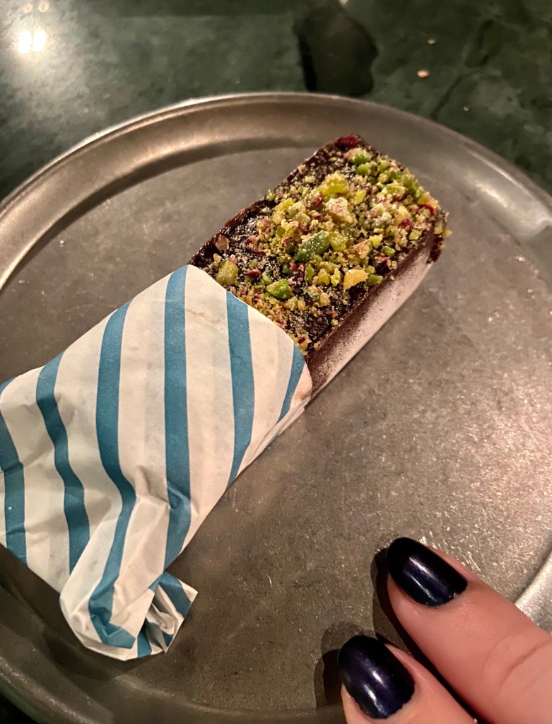 Menüdeki tatlılar içinde en merak ettiğimiz Antep fıstıklı frigo olunca bir de ondan deneyelim dedik. Çok minik, hafif, canınız tatlı istemezken bile yiyebileceğiniz bir tatlı. Alman pastası ve tiramisu ise servis arabasında devasa kaselerde geziyor, isterseniz hemen dolu bir kaşık alıp tabağa koyup size veriyorlar, yani alengirli bir sunum beklemeyin. Onları da merak ettim, fakat bir dahaki sefere bıraktım.