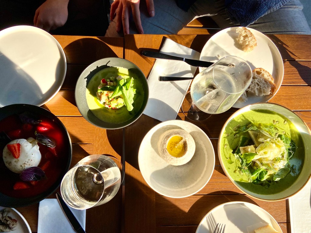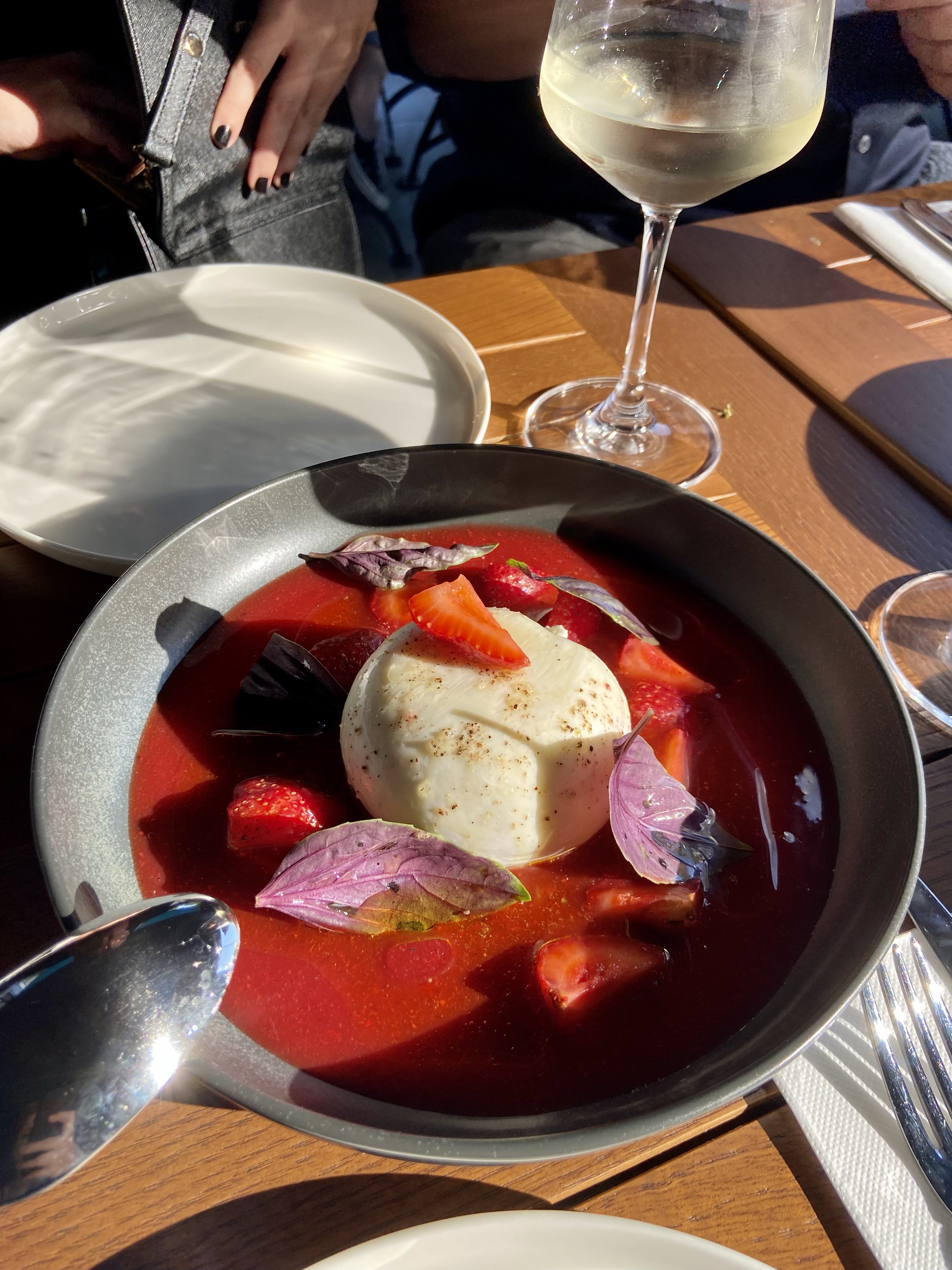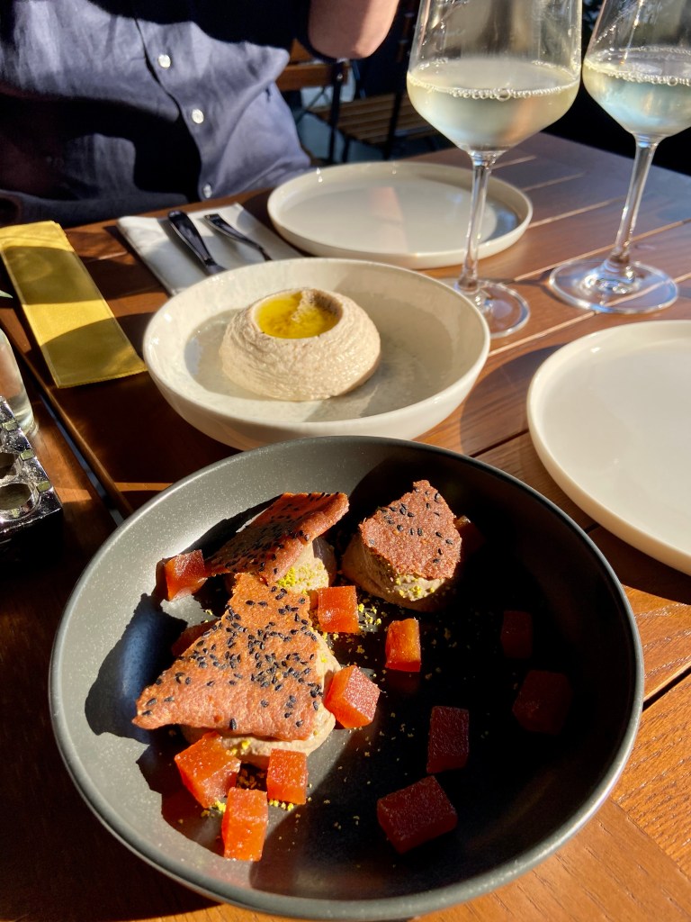 Yanımdaki insanlar da meyveli tatları en az benim kadar sevdikleri için çilek coulis içinde yüzen bir burrata istemekte gecikmedik. O ne renk ama, değil mi? Çileği salatalarda, peynir yanında çok sevdiğimden ve çilekli fesleğen salatasını yaygınlaştırma şubesi başkanı olduğumdan bu tabak da beni gayet mutlu etti. (Burrata’yı nereden aldıklarını sorma fırsatım olmadı ama Buffa olduğunu tahmin ediyorum.) Soğuk bakla çorbası içinde gelen enginar, ızgara kabak ve rezene ise hem çok fresh, hem de çok uyumlu bir tabak. Rezene kadar aromalı bir bitkinin bizde lokantalarda bu kadar az yer bulması beni çok üzüyor, nerede rastlasam direkt atladığım şeylerden biri kendisi. Bu tabakta da kesinlikle diğerlerini parlatan, patlatan rezene bence. Yine gördüğüm yerde söylemeden geçemediğim ceviche de çok ama çok başarılıydı. Diri, salatalık gazpacho ve kavunla zenginleştirilmiş, harika bir tabak! Hepimizin favorilerinden biri oldu. Tarama, gayet başarılı. Elle çırpılmadıysa bile hissettirmiyor, yumurtalar paralanmamış, başarılı bir kıvam tutturulmuş ve beyaz şaraba da en az rakıya olduğu kadar iyi bir eşlikçi…