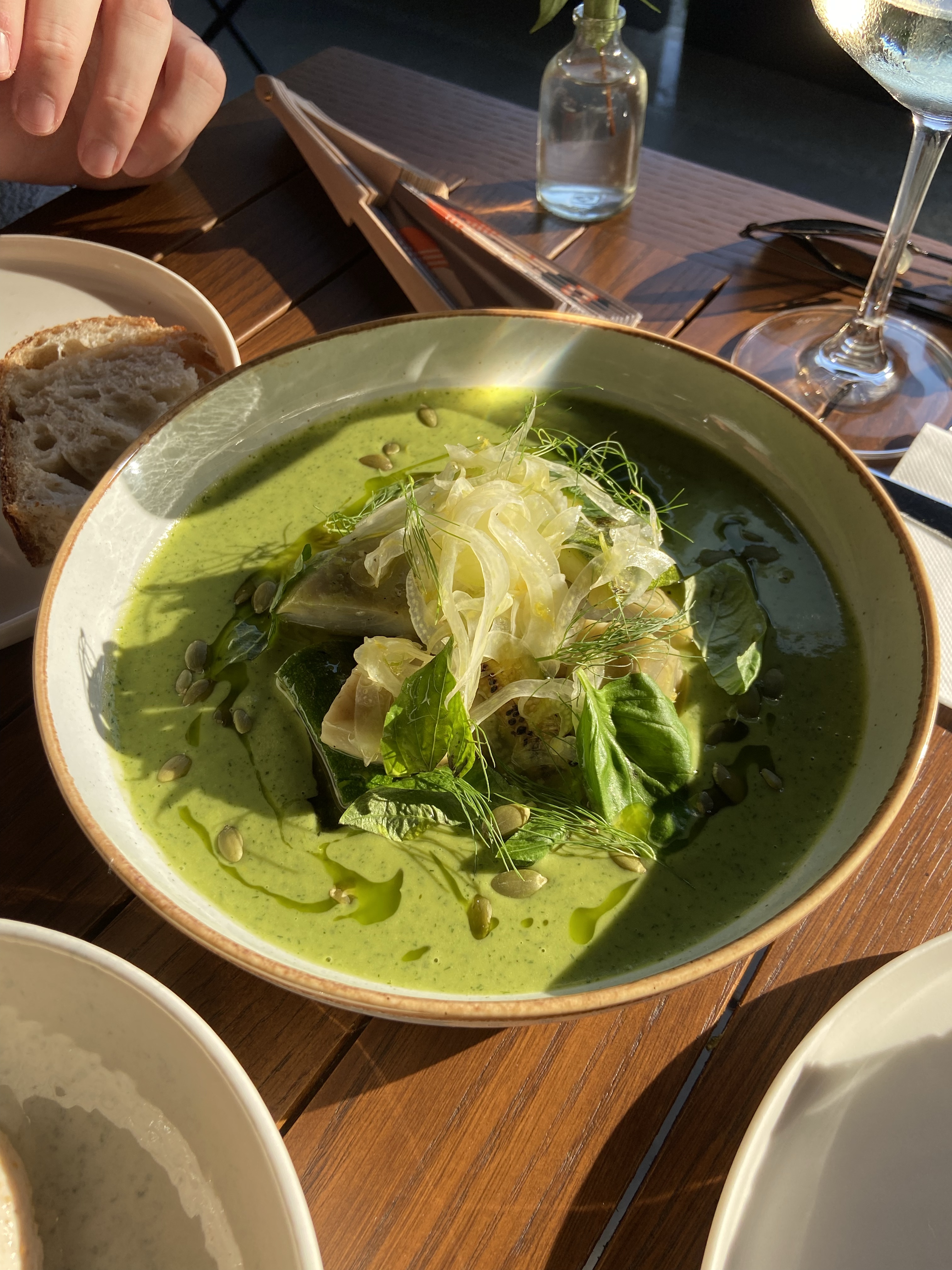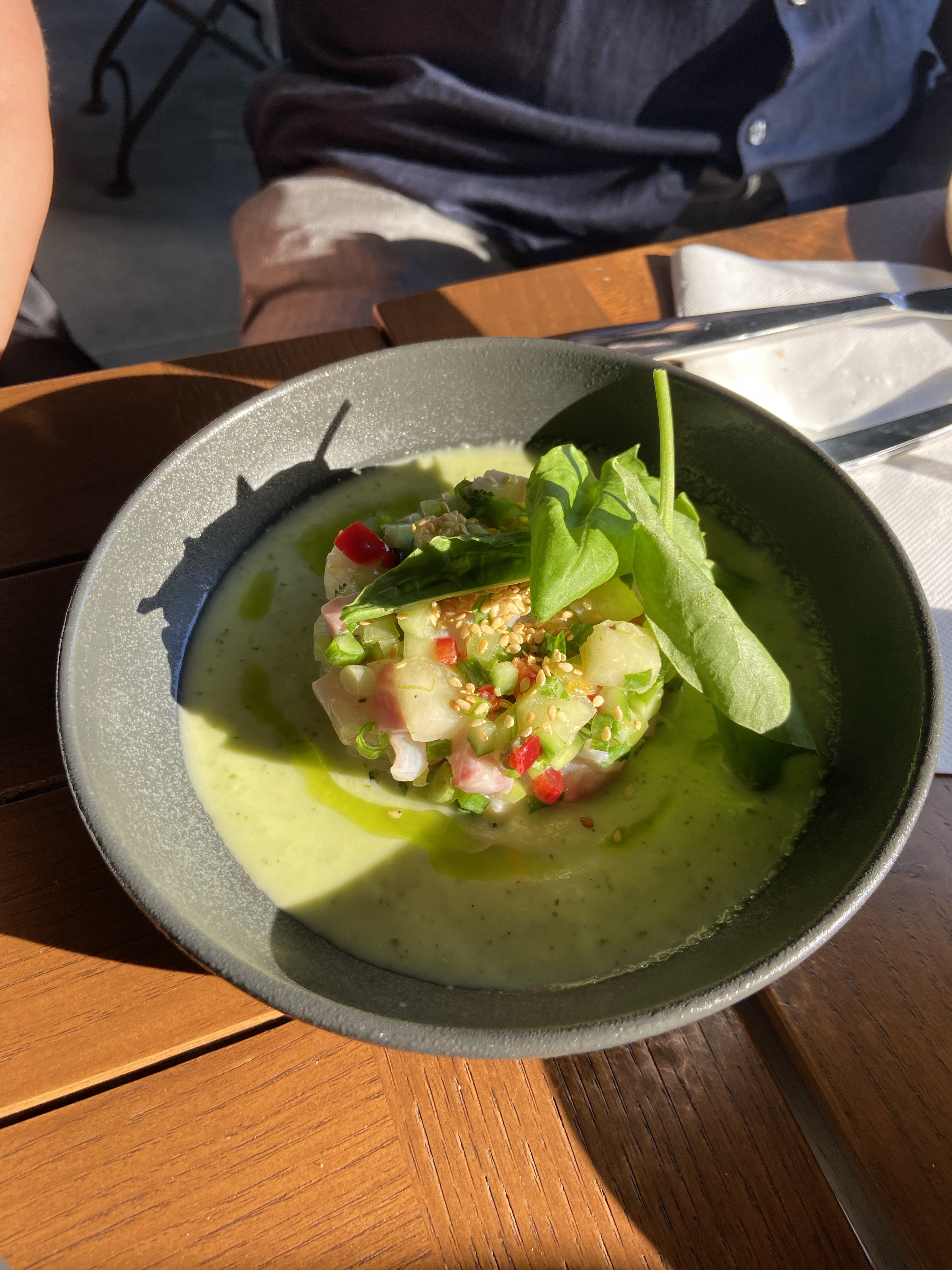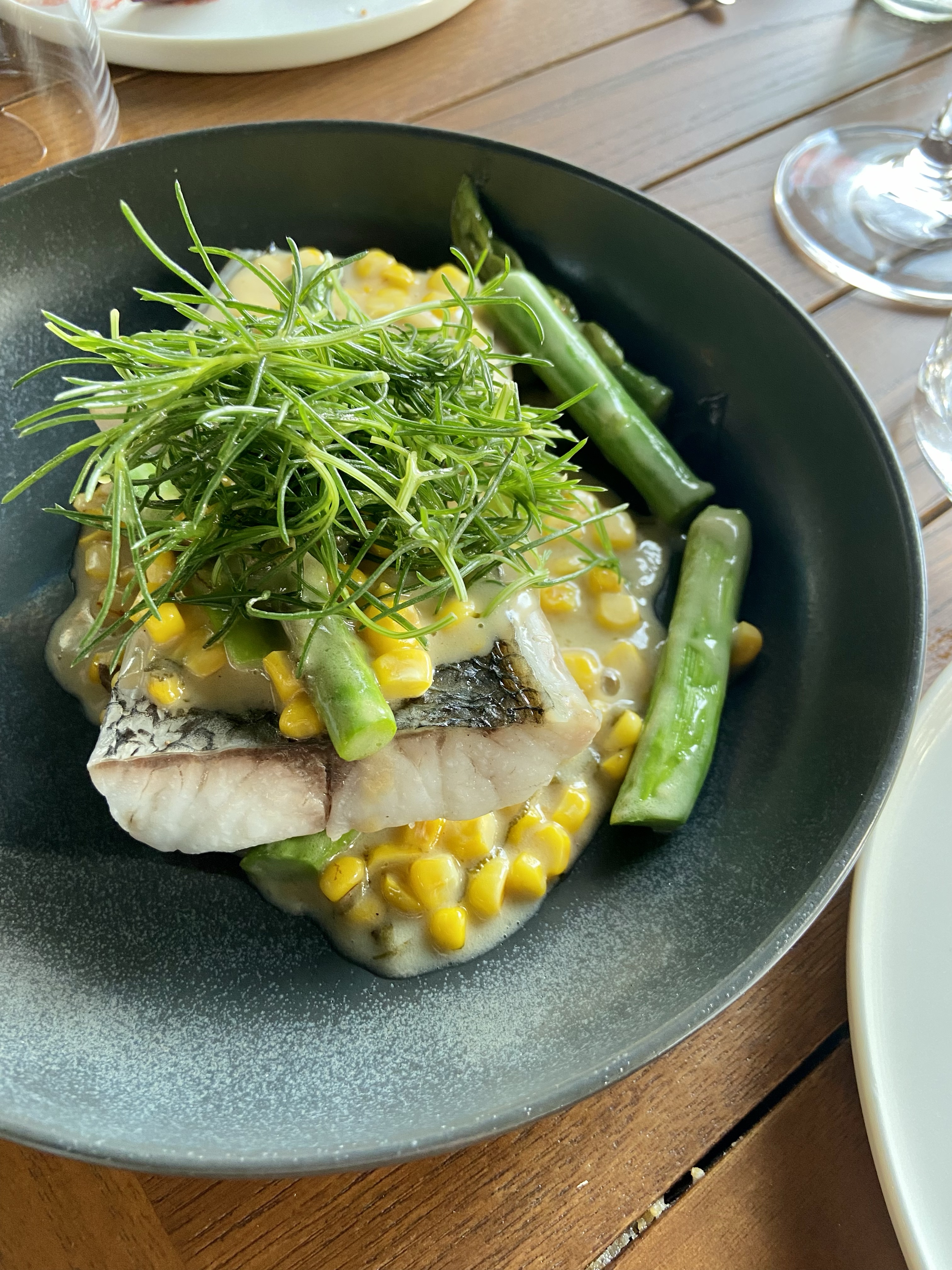 Yanımdaki insanlar da meyveli tatları en az benim kadar sevdikleri için çilek coulis içinde yüzen bir burrata istemekte gecikmedik. O ne renk ama, değil mi? Çileği salatalarda, peynir yanında çok sevdiğimden ve çilekli fesleğen salatasını yaygınlaştırma şubesi başkanı olduğumdan bu tabak da beni gayet mutlu etti. (Burrata’yı nereden aldıklarını sorma fırsatım olmadı ama Buffa olduğunu tahmin ediyorum.) Soğuk bakla çorbası içinde gelen enginar, ızgara kabak ve rezene ise hem çok fresh, hem de çok uyumlu bir tabak. Rezene kadar aromalı bir bitkinin bizde lokantalarda bu kadar az yer bulması beni çok üzüyor, nerede rastlasam direkt atladığım şeylerden biri kendisi. Bu tabakta da kesinlikle diğerlerini parlatan, patlatan rezene bence. Yine gördüğüm yerde söylemeden geçemediğim ceviche de çok ama çok başarılıydı. Diri, salatalık gazpacho ve kavunla zenginleştirilmiş, harika bir tabak! Hepimizin favorilerinden biri oldu. Tarama, gayet başarılı. Elle çırpılmadıysa bile hissettirmiyor, yumurtalar paralanmamış, başarılı bir kıvam tutturulmuş ve beyaz şaraba da en az rakıya olduğu kadar iyi bir eşlikçi…