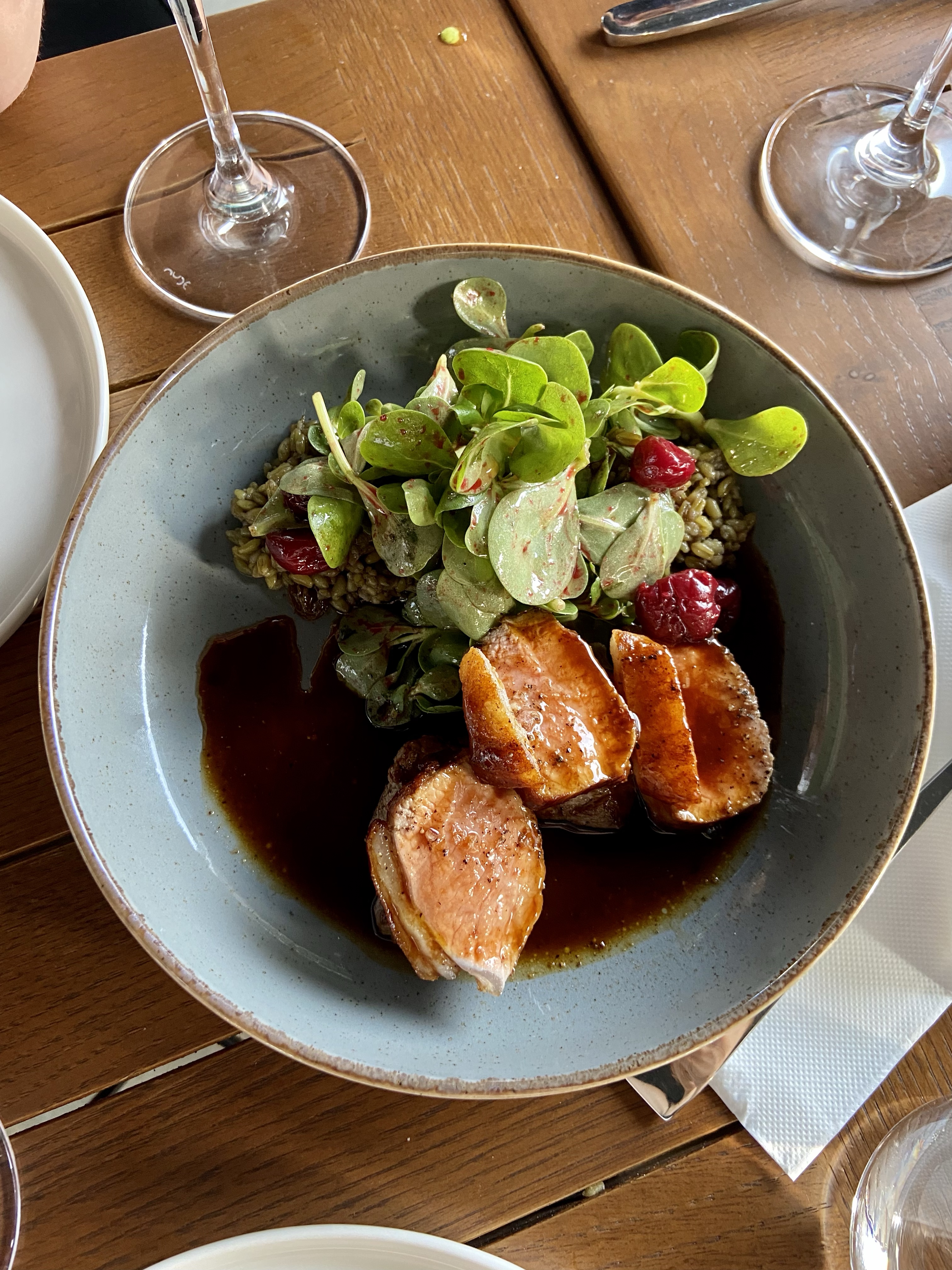 Bunca soğuktan sonra gelelim sıcaklara… Kuşkonmaz ve mısırla birlikte servis edilen, adaçaylı ve balık stoklu bir sos eşliğinde gelen minekop çok ama çok güzeldi. Bu benim tam görmek istediğim tarzda bir balık tabağı: Dengeli, uyumlu, ama dümdüz bir ızgara edip getirme şeklinde değil, yaratıcılık kullanılmış, “balık yemeği” formatında bir tabak. Gidenlerin -menüde mevcut olabildiği zamanlarda- kesinlikle ıskalamamasını öneririm. Fakat kuzu karski için ille de söyleyin diyemeyeceğim. Karski, aslında kuzunun en lezzetli yerlerinden biri, hem yumuşak hem aromatik bir bölgesi. Vişneli soslu olması da beni cezbeden noktalardan biriydi, zira ben kalp meyveli soslar. Lakin et biraz sertti ve beklediğim kadar bütünleşmemişti lezzetle. Fakat tabağın tamamlayıcısı olan vişneli firik muazzamdı doğrusu! Eh, bu kadar başarılı tabağın içinde et de biraz sert oluversin, dert değil. Menünün yarısını filan yediğimiz düşünülürse, memnuniyet oranımız çok çok yüksek!