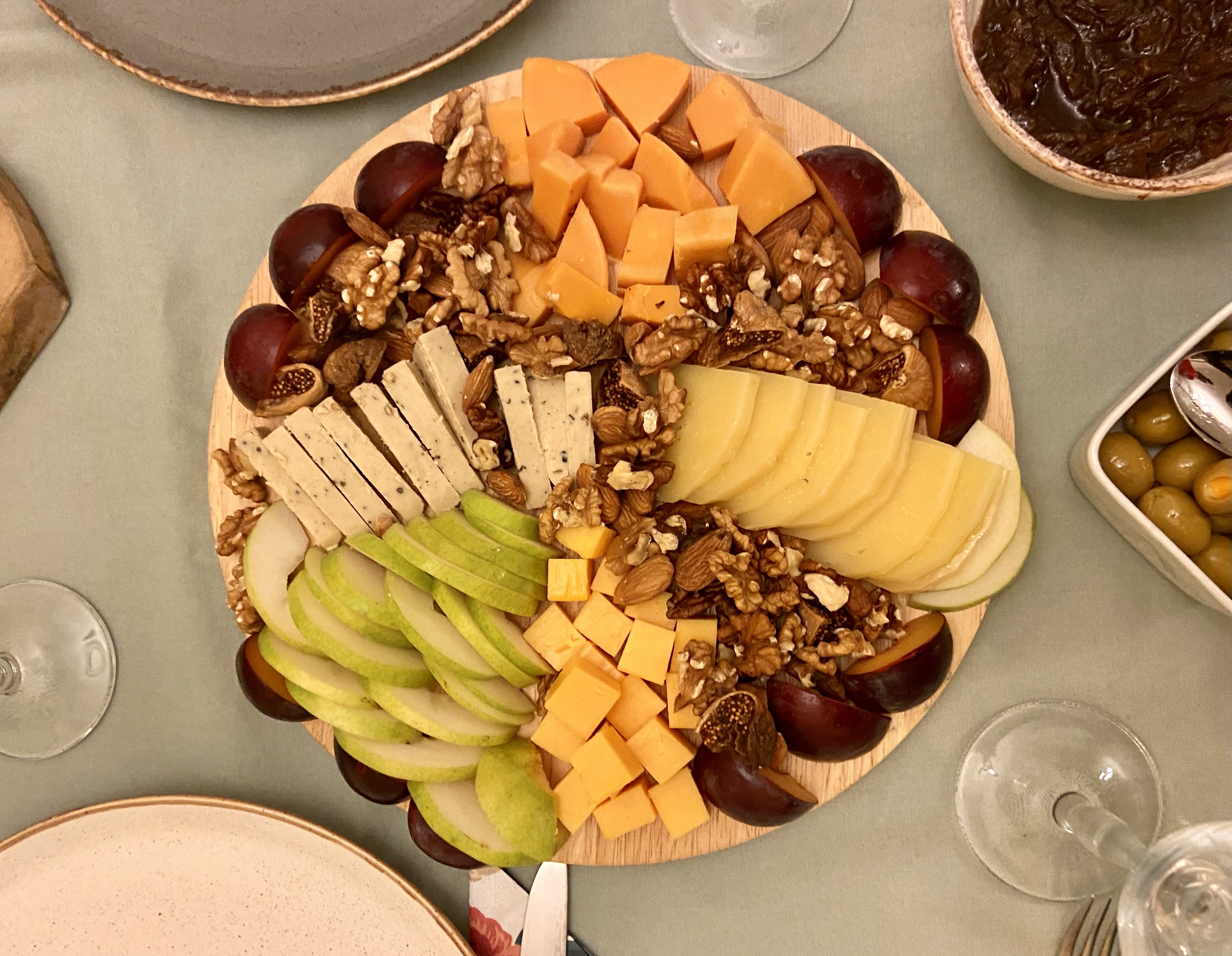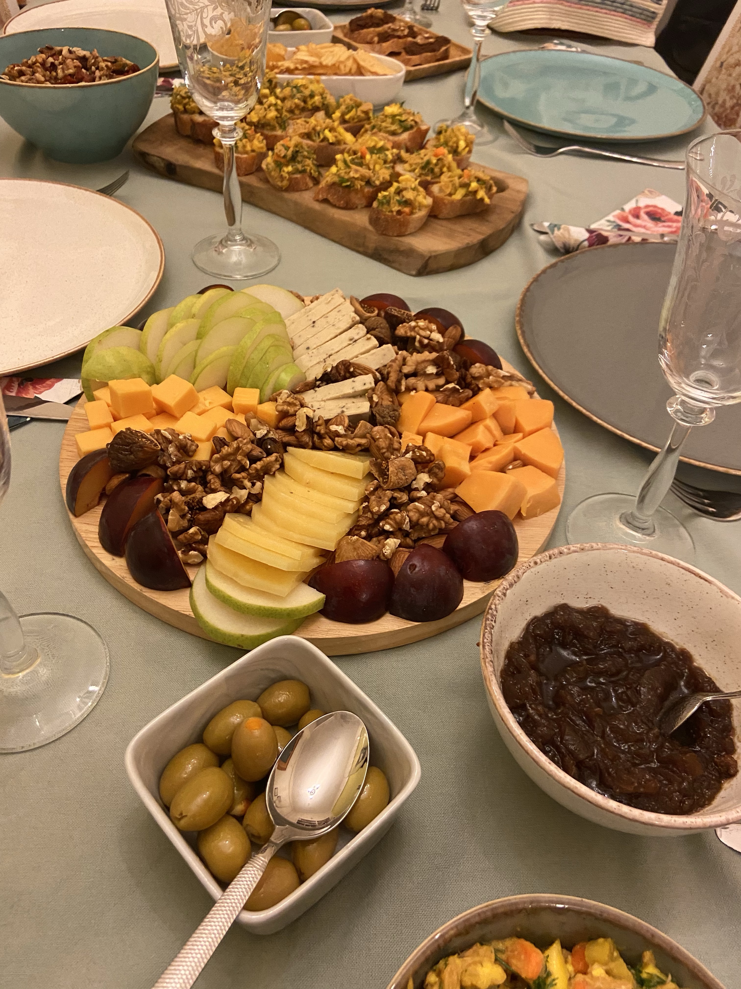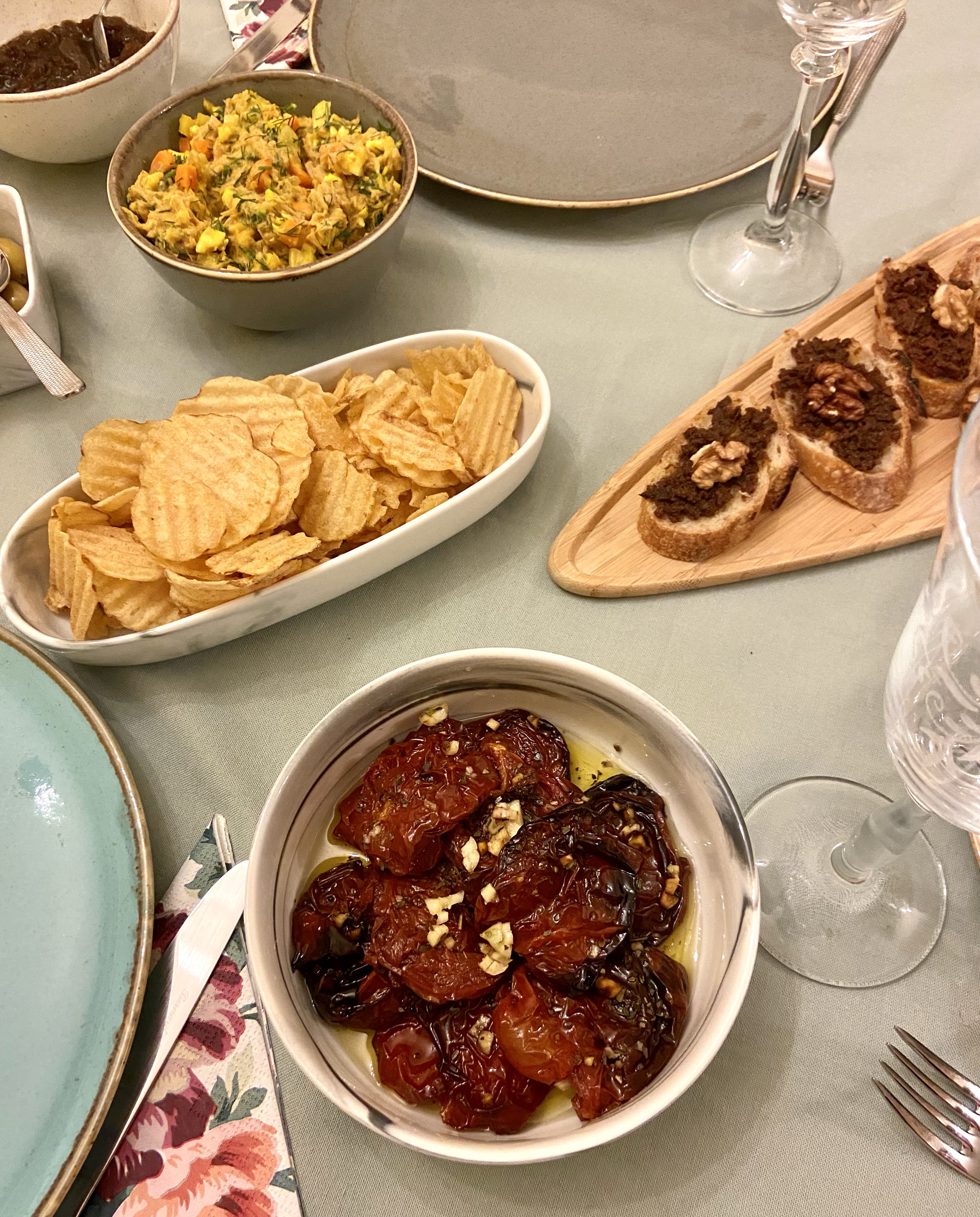 Sofranın kalanı tahmin edilebilir şeyler; güzel bir peynir tabağı olmazsa olmaz mesela değil mi? Kuru incir, kuru kayısı gibi meyvelerin yanına ben hep taze de eklerim ve bence peynire en güzel yakışan meyve armut. Ama çok ballı değil, az kıtır olacak. Mevsim dokunuşunu da bu ara kolay bulunan anjelik eriklerle yaptım, o da çok yakıştı. Yine peynirlere en güzel eşlikçi soğan reçeli… Ne yazık ki Türkiye’de bulamıyorum, bir ara Auteur’de vardı ama sanırım artık yok. Keşke bir yerler yapsa, Fransa stoklarım erimeye yüz tuttu! Son kavanozları dostlarla paylaştık gitti. Bunların dışında şarap yanında portakal ve limon dolgulu yeşil zeytin favorimdir, onları da ekledim. Dostum Neşe tam bir atıştırma uzmanı olarak çok enteresan şeyler bulur, tarçın ve tatlı patatesli cipsler bulup “Sen acayip şeyler denemeyi seviyorsun, sana aldım” demişti; eh dedim hadi hepimiz deneyelim. O kadar güzel çıktı ki! Klasik cipslerden sıkılanlar buna saldırsın derim! Brezilyalı bir dostumuz da sarımsak ve aromatik otlarla yağa bastığı kuru domateslerden getirdi, onu da kondurduk sofraya ve tamamız!