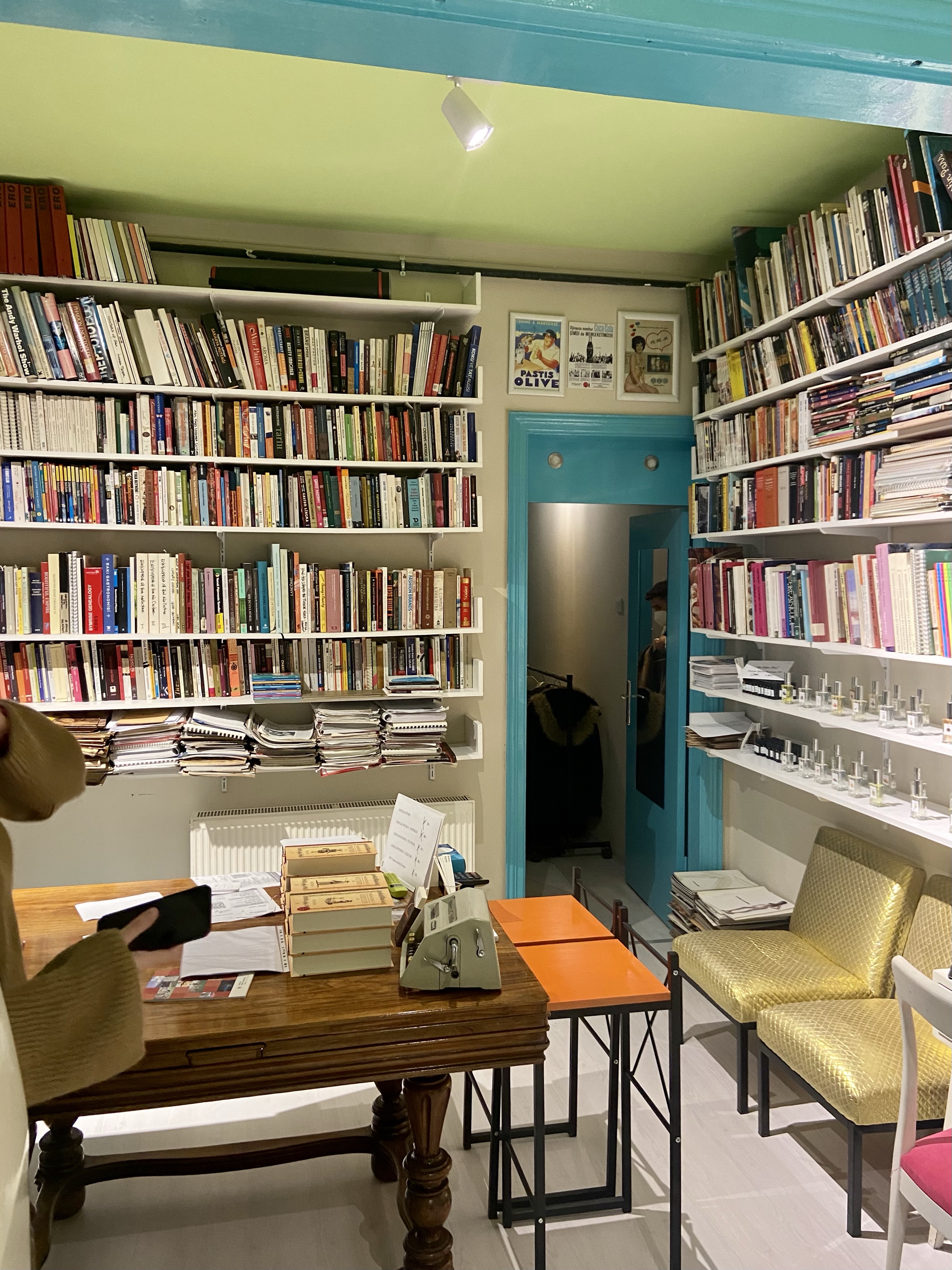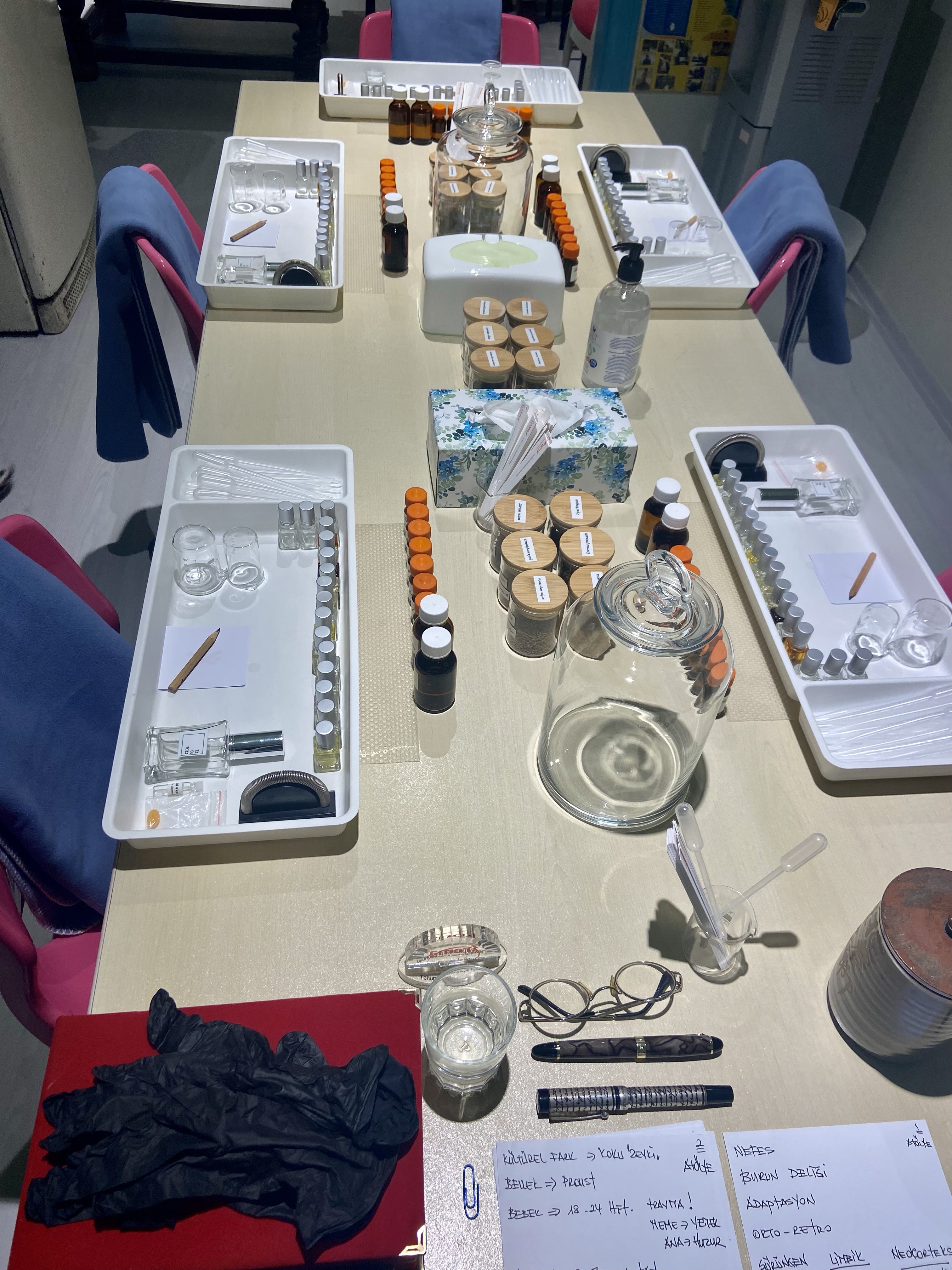 Vedat Ozan aslında yıllardır meraklıları için koku atölyeleri düzenliyordu, ama pandemi yüzünden iki senedir sekteye uğramıştı, öncesinde de epey bir süre yer doluydu. Ben de bir türlü gidememiştim. Nihayet çok küçük gruplarla ve çok dikkatli biçimde yeniden yapmaya başladı ve bu kutlu haberi aldığımda ben de büyük bir heyecanla konuk oldum! Atölyenin daha kapısından girerken harika bir yere girdiğinizi anlıyorsunuz: kokuyla ilgili kitaplar, Vedat Ozan’ın koku orgu, şişeler, kokular, özel koleksiyon eski parfümler… Alice’in harikalar diyarından hallice bir ortam!