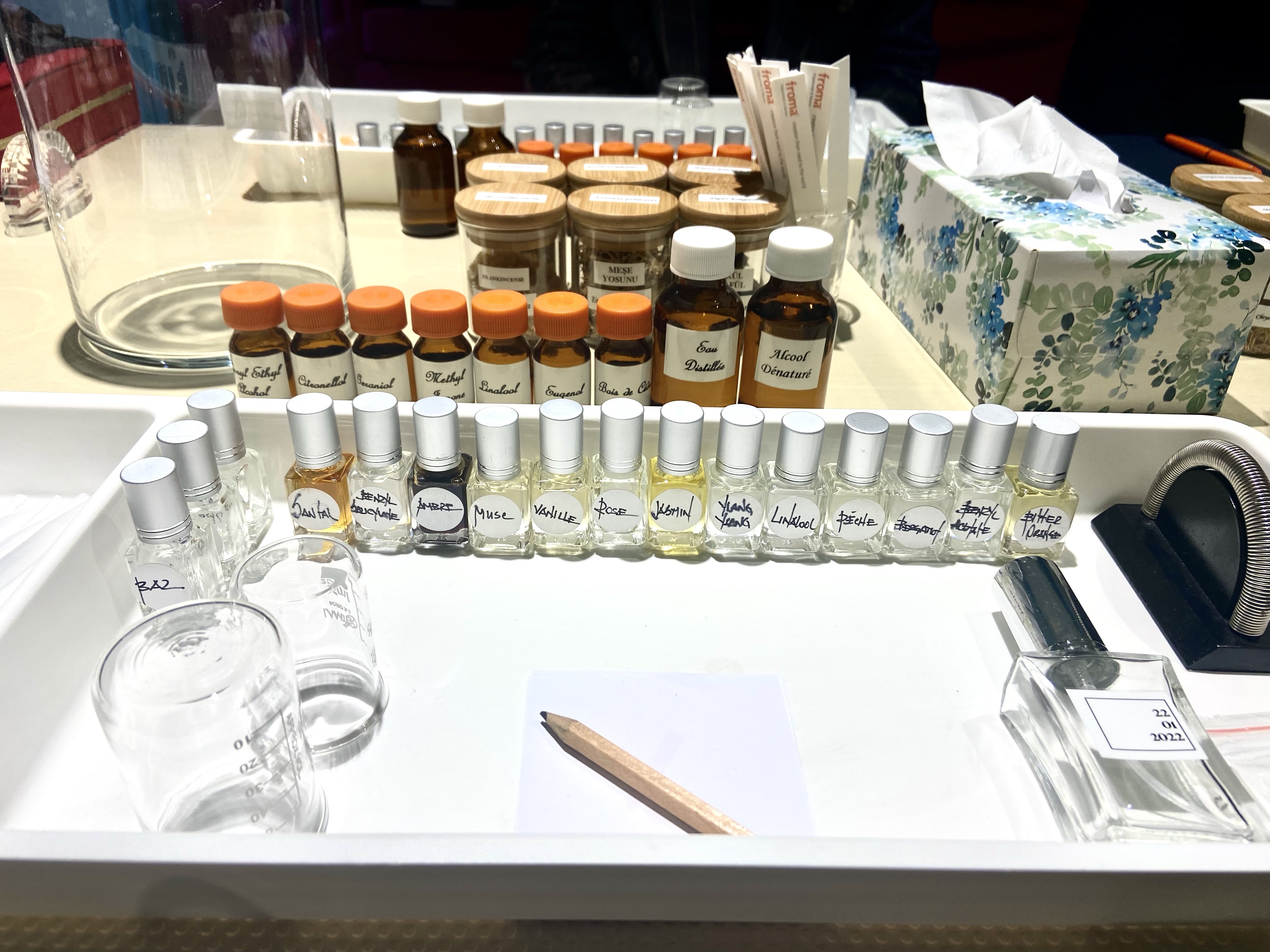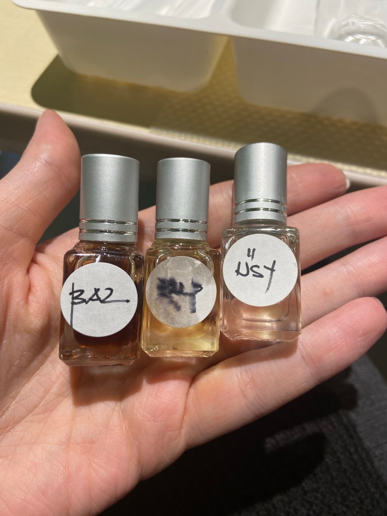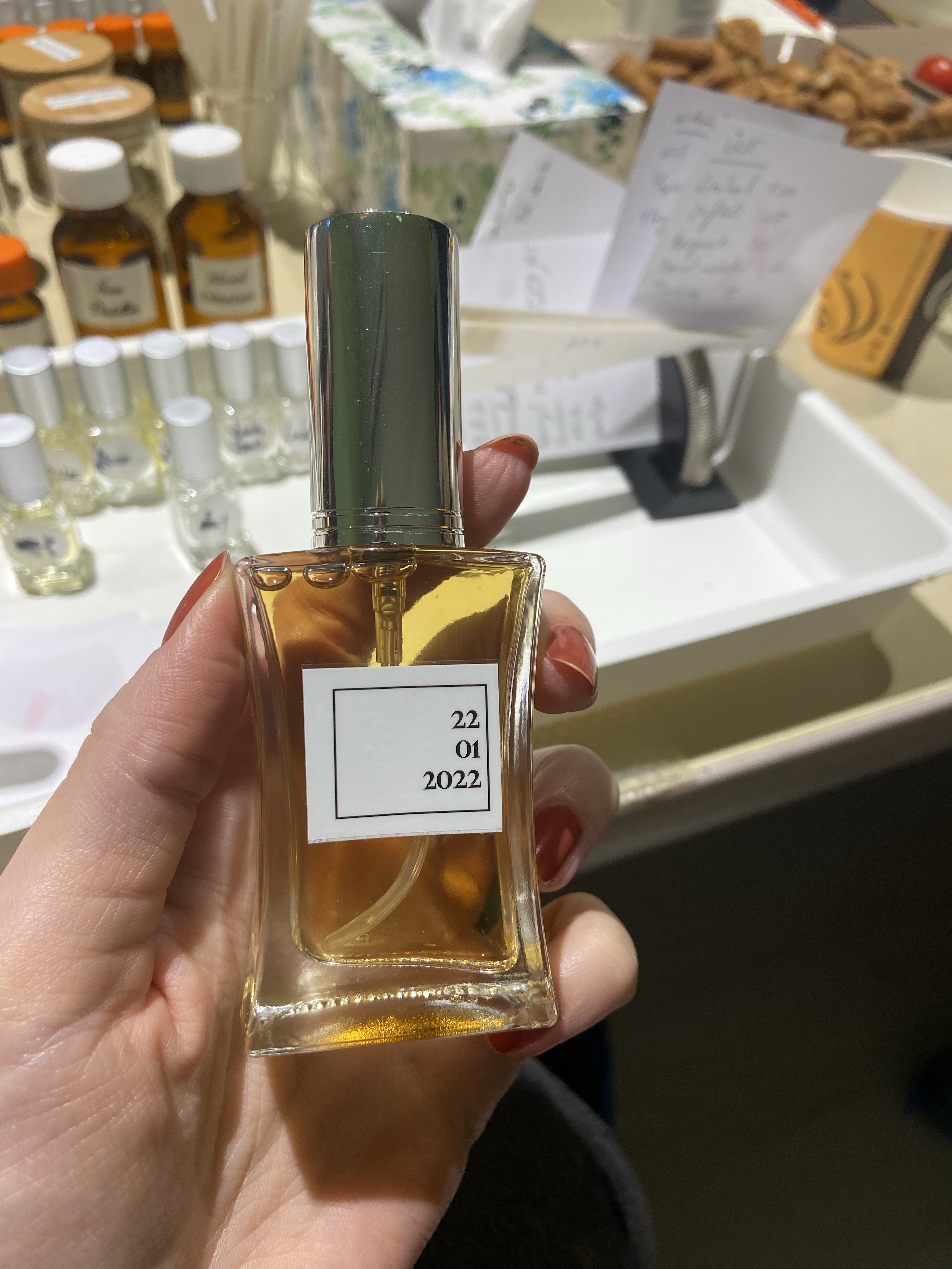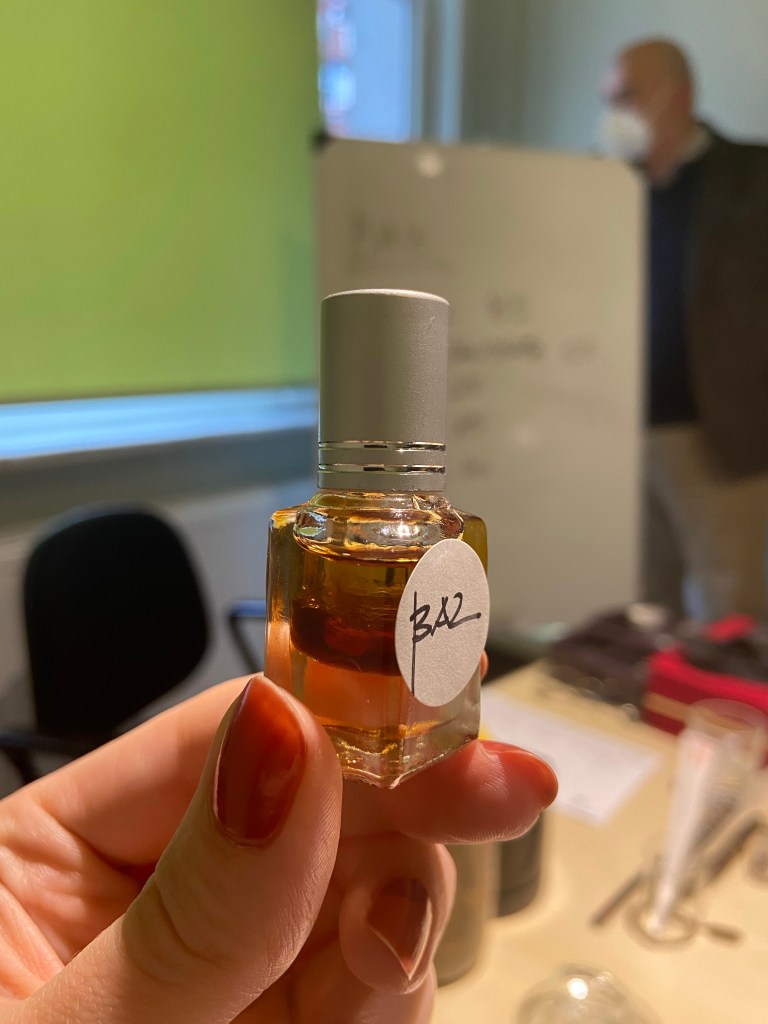 Birbirinden enteresan bilgilerle ve küçük, sürprizli deneylerle dolu saatler su gibi aktı geçti (ben tabii burada size hızlı oynat modunda geçtim), konuştuk, gülüştük, şaşırdık, bilgilendik ve geldik final kısmına. Önümüzde duran iki dizi şişeyi kullanma vaktimiz geldi: Önce bir gül akoru yapacak, sonra onu diğer akorlarla birleştirerek bir parfüm yapacağız! Tek bir akor bile birçok molekülden yaratılıyor; örneğin önümüzde duran kehribar renkli şişeler bir gül akoru yapmamız için gereken maddeleri içeriyorlar. (Ki Vedat Bey bunun “basit” bir gül akoru olduğunu söylüyor, aslında daha komplike olsa daha iyi olurmuş!) 7 ayrı şişenin içindeki sıvıları Vedat Bey’in verdiği reçeteye göre damlalıkla karıştırıyor, çalkalıyor, heyecanla kokluyoruz. Voila, işte bir gül aroması! Vedat Bey “Teninize direkt sıkmayın ama banyo suyunuza karıştırabilirsiniz bunu” dese de, birçok tatlıcıda güllaçların üstüne serpilen kötü kalite gül sularından daha sağlıklı olduğuna emin gibiyim nedense!